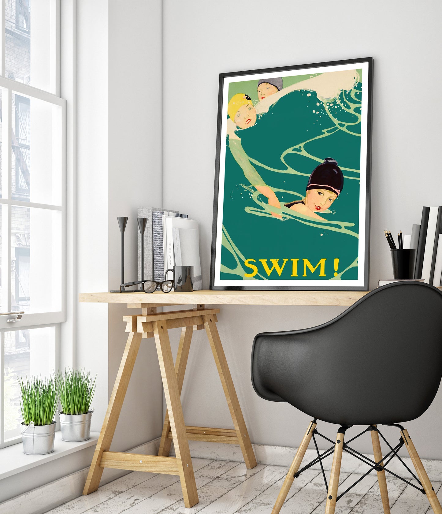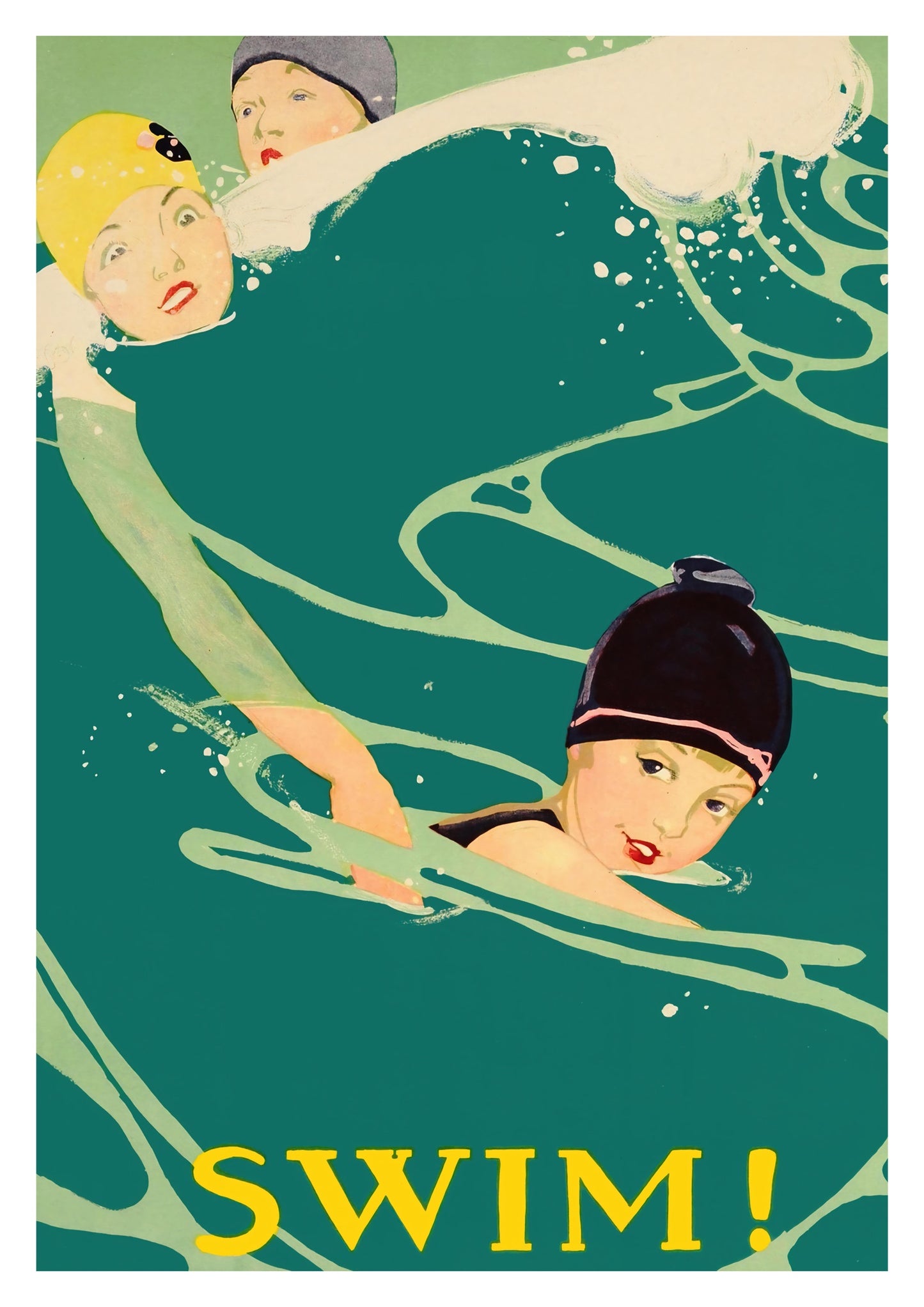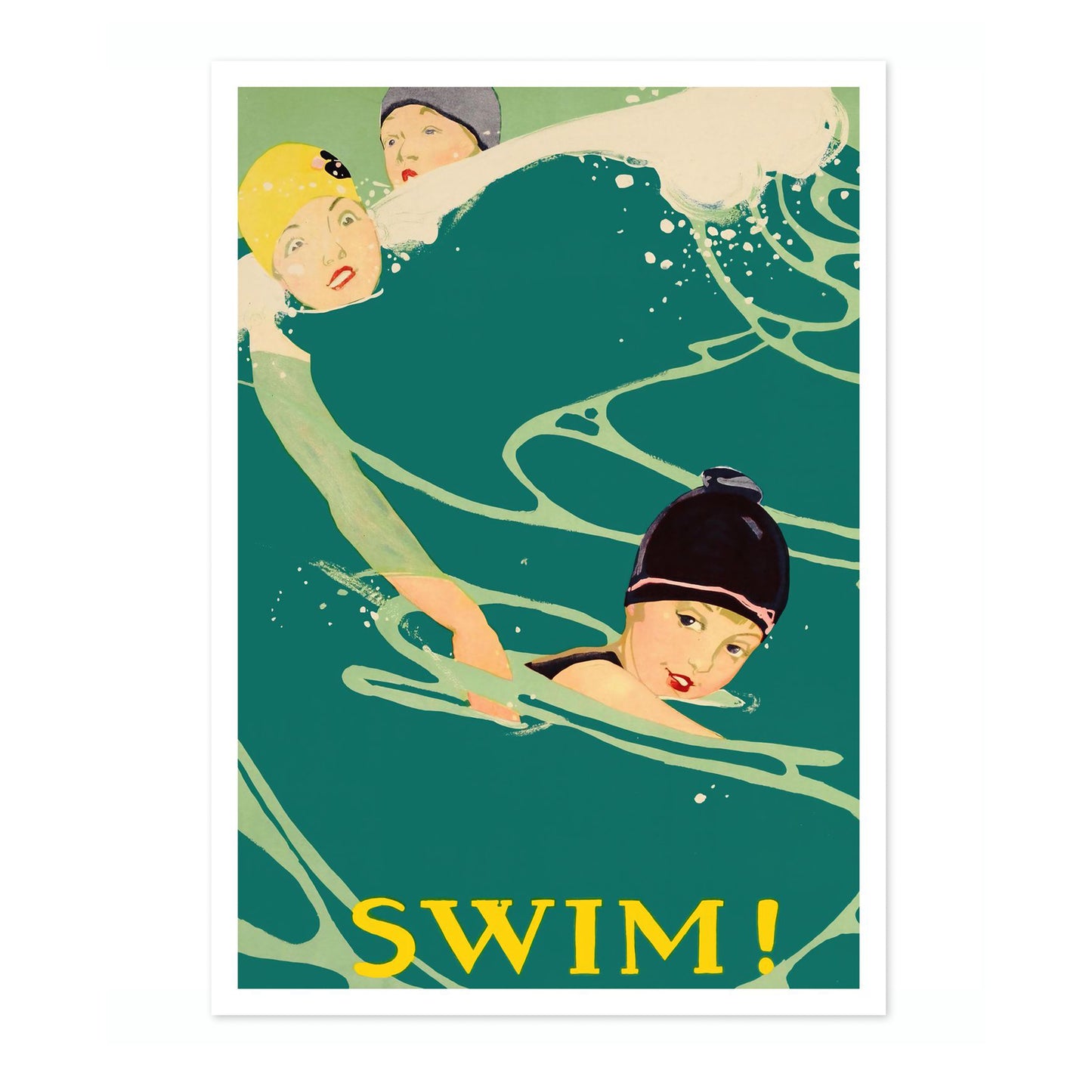 This vintage-inspired "Swim!" poster features a trio of women in retro swim caps gliding through stylized waves in vibrant green hues. The dynamic composition and bold typography capture the essence of competitive swimming, evoking nostalgia. Perfect for art and sports enthusiasts, this illustration brings a lively aquatic theme to any space. Ideal for those seeking a green vintage sports poster.