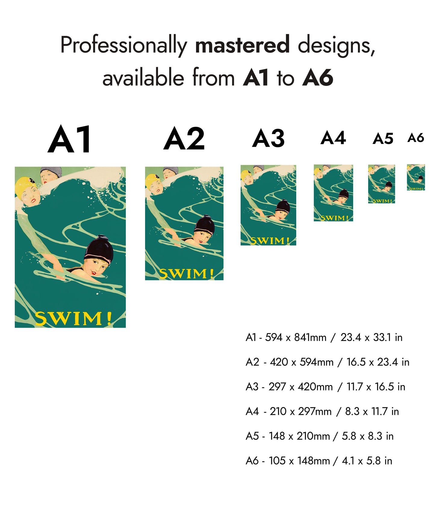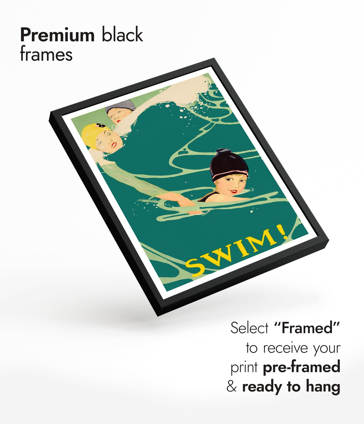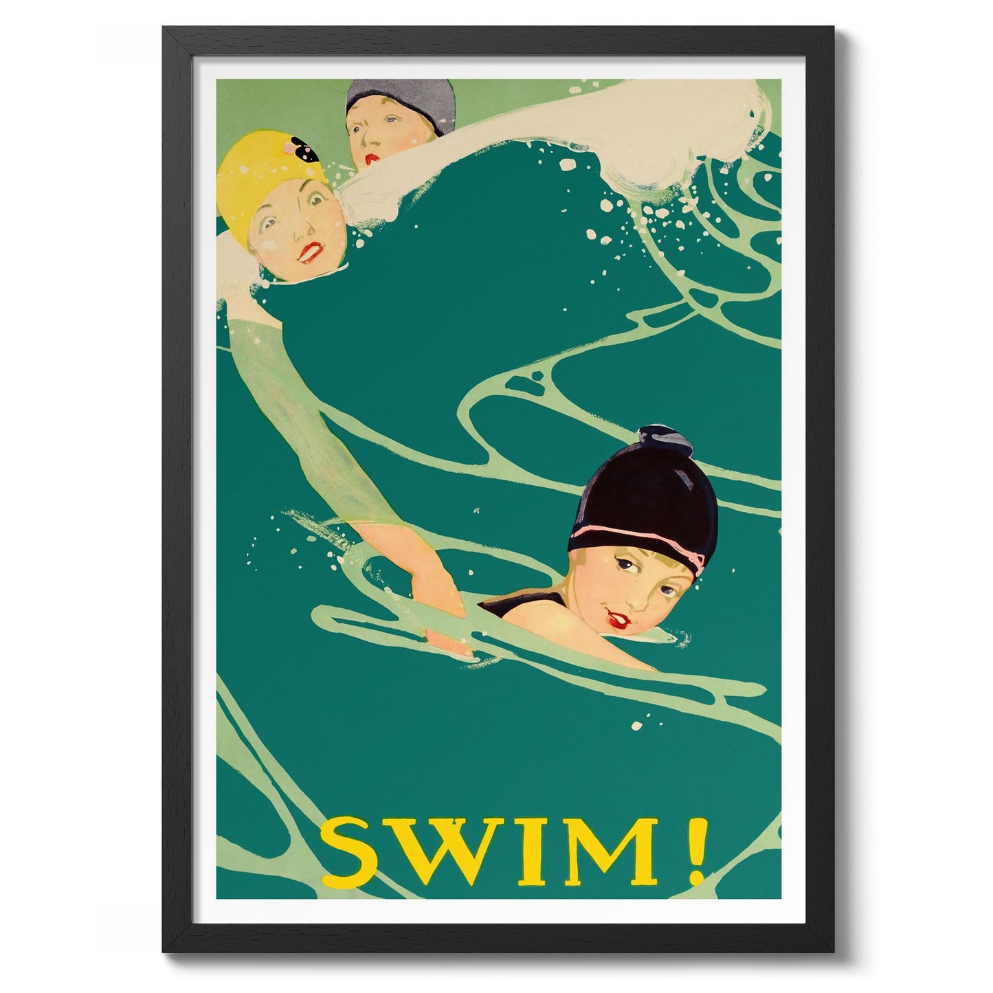 This vintage-inspired "Swim!" poster features a trio of women in retro swim caps gliding through stylized waves in vibrant green hues. The dynamic composition and bold typography capture the essence of competitive swimming, evoking nostalgia. Perfect for art and sports enthusiasts, this illustration brings a lively aquatic theme to any space. Ideal for those seeking a green vintage sports poster.