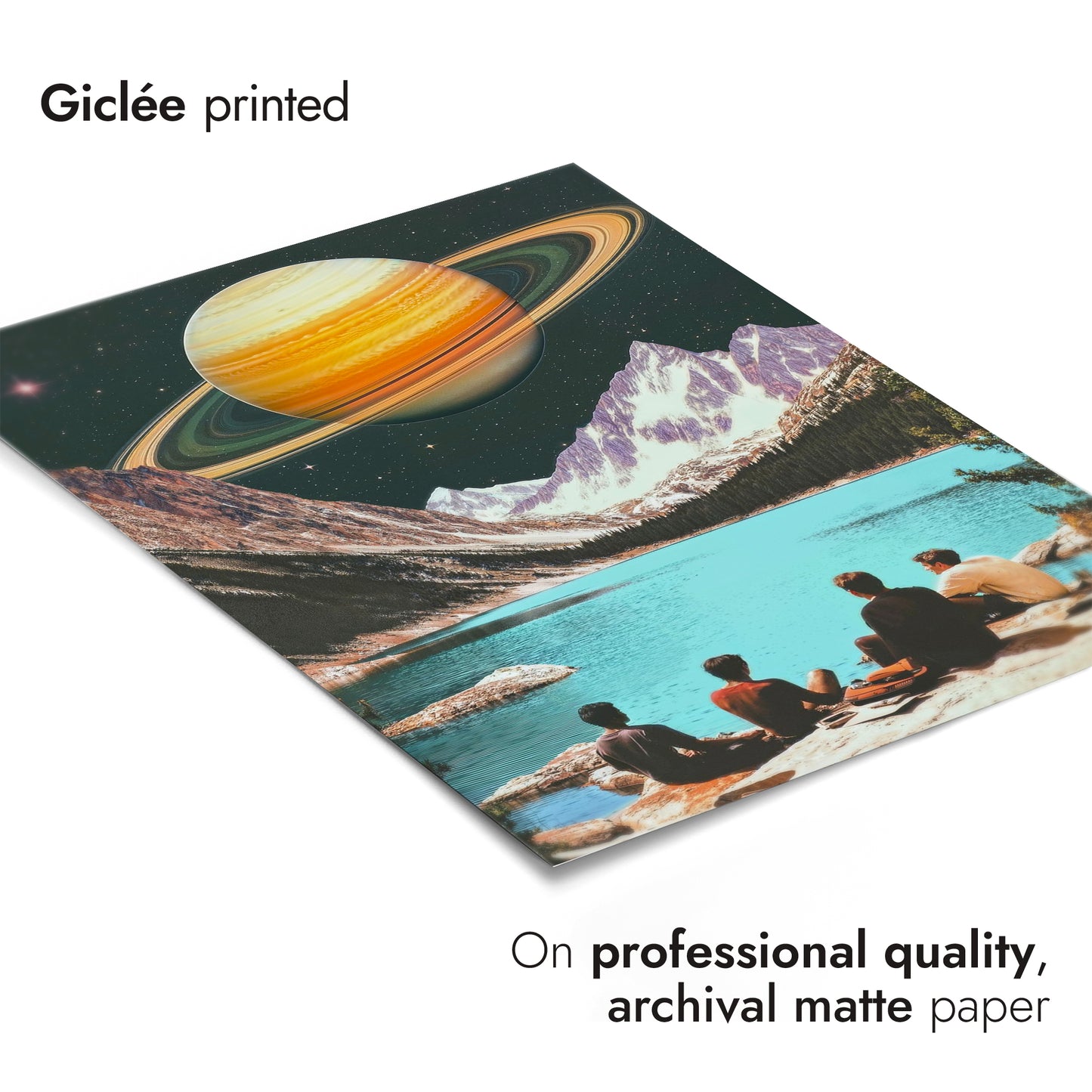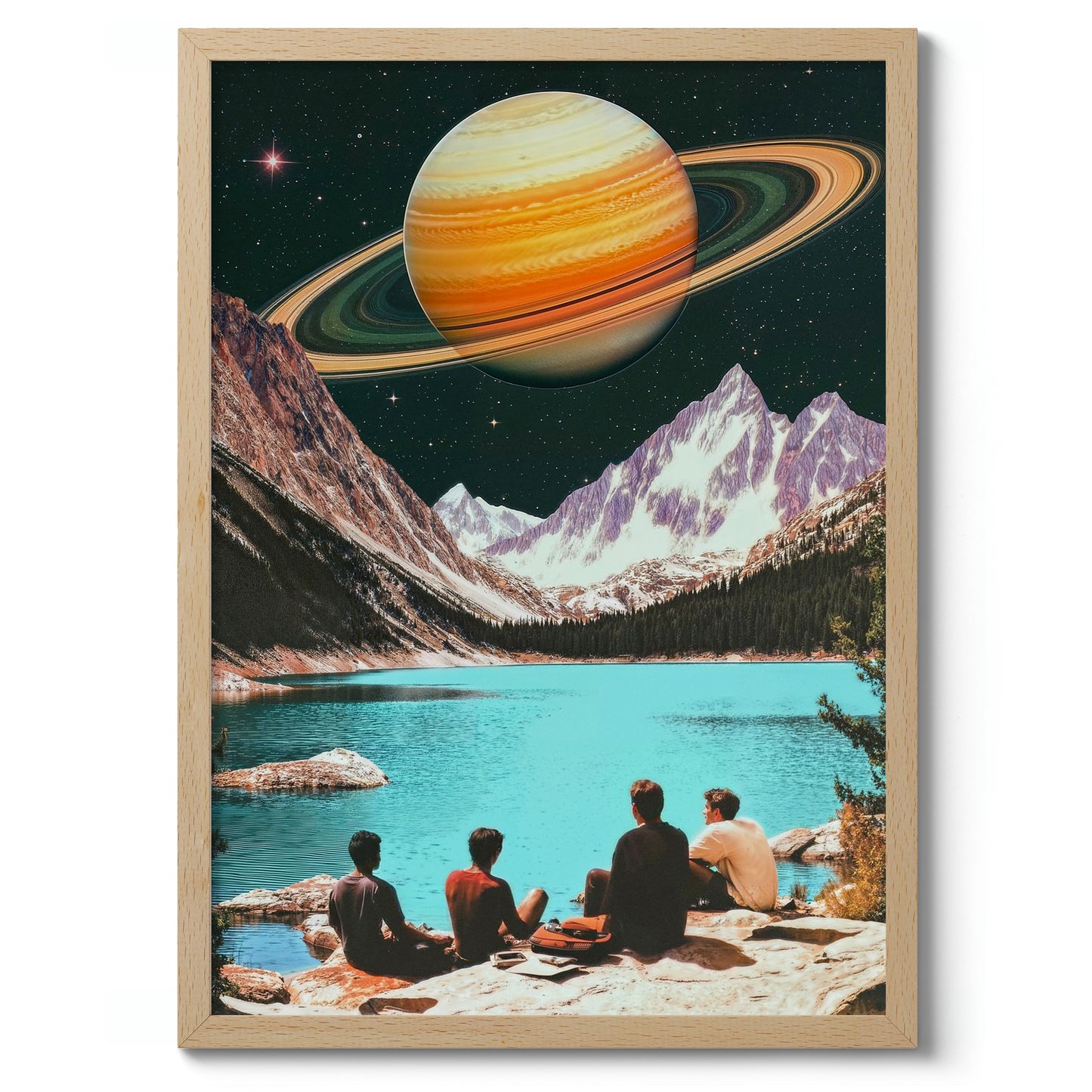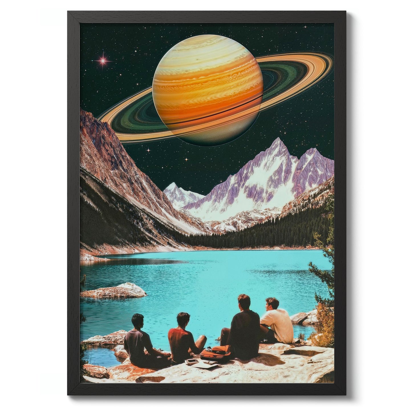 This captivating poster, "Swimming on Saturn's Moon," blends vintage aesthetics with a sci-fi theme. It features a surreal landscape where a group of people overlooks a tranquil turquoise lake, juxtaposed against majestic mountains and the looming presence of Saturn in the starry sky. The artwork's retro vibe and imaginative scene make it a striking addition to any space-themed decor.