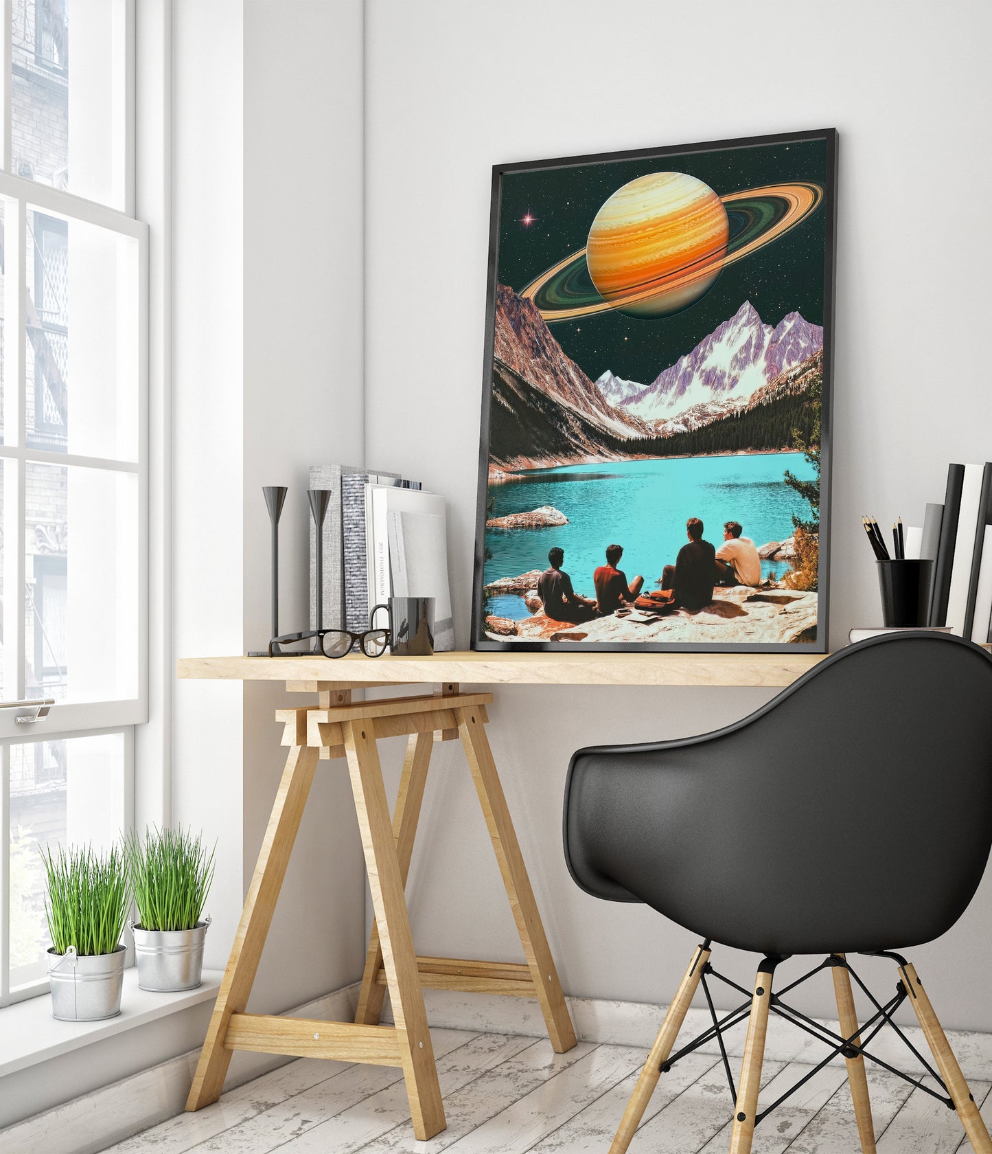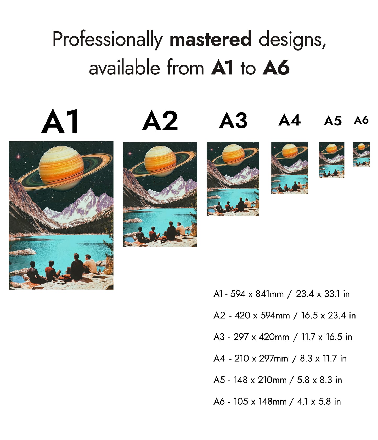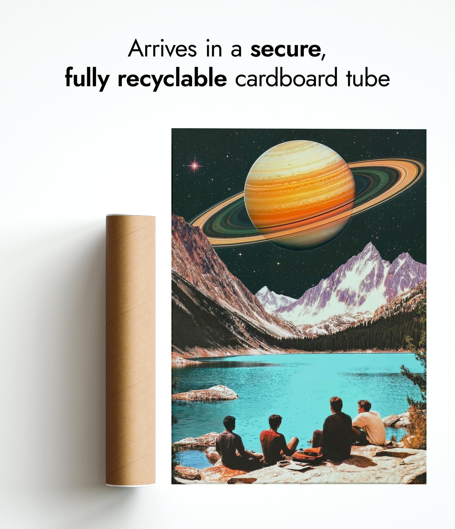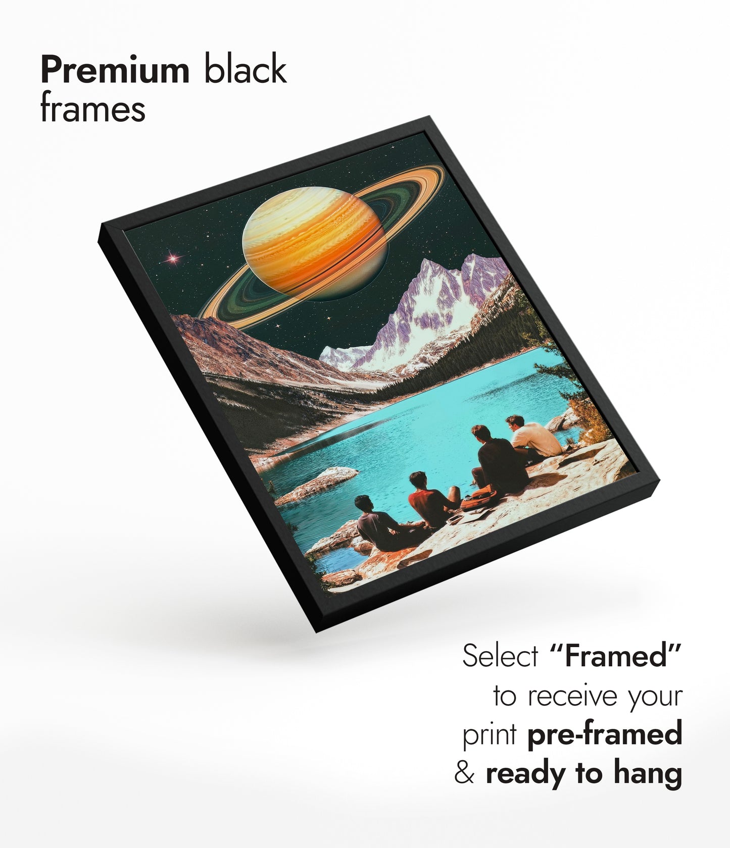 This captivating poster, "Swimming on Saturn's Moon," blends vintage aesthetics with a sci-fi theme. It features a surreal landscape where a group of people overlooks a tranquil turquoise lake, juxtaposed against majestic mountains and the looming presence of Saturn in the starry sky. The artwork's retro vibe and imaginative scene make it a striking addition to any space-themed decor.