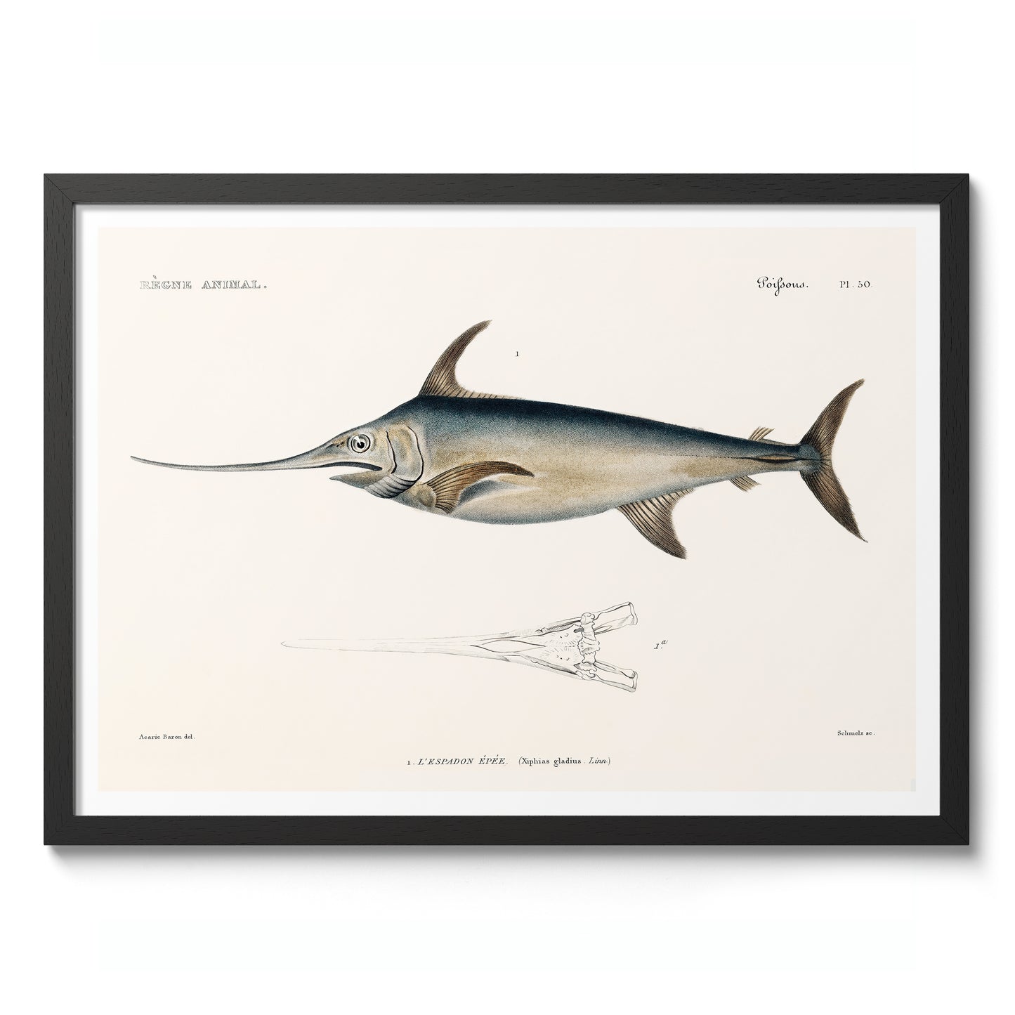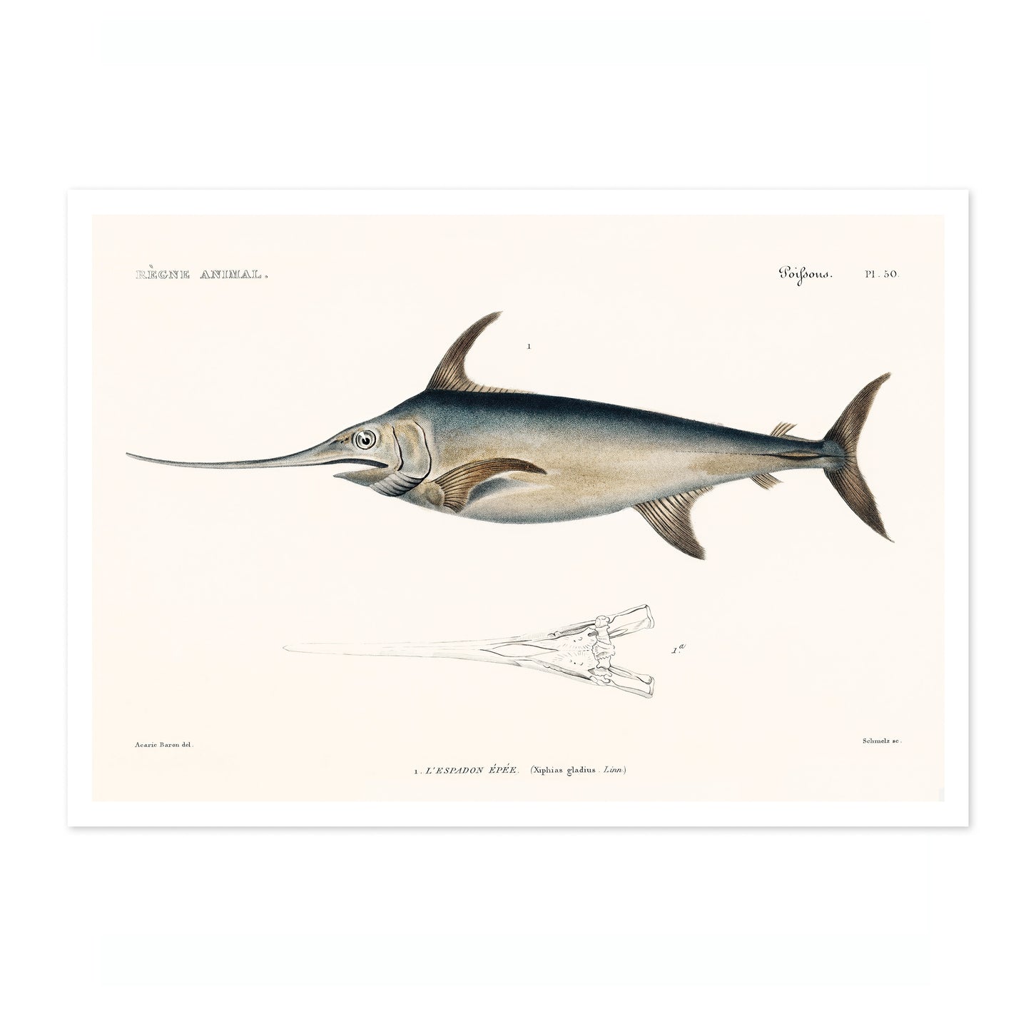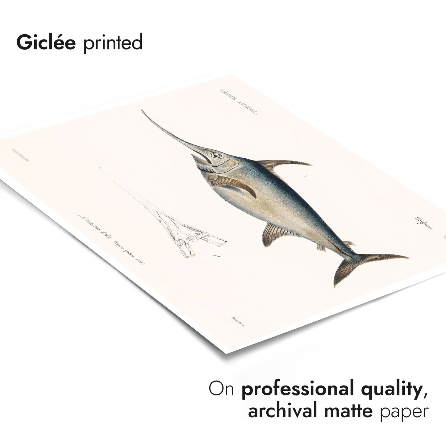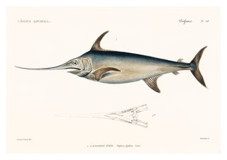 This vintage style "Swordfish" poster by renowned naturalist Georges Cuvier depicts an intricately detailed illustration of the majestic swordfish. The artwork features precise anatomical details, highlighted by the swordfish's elongated body and characteristic sword-like bill. Ideal for nature and marine life enthusiasts, this piece combines scientific accuracy with artistic elegance. Perfect for adding a touch of sophistication to any space.