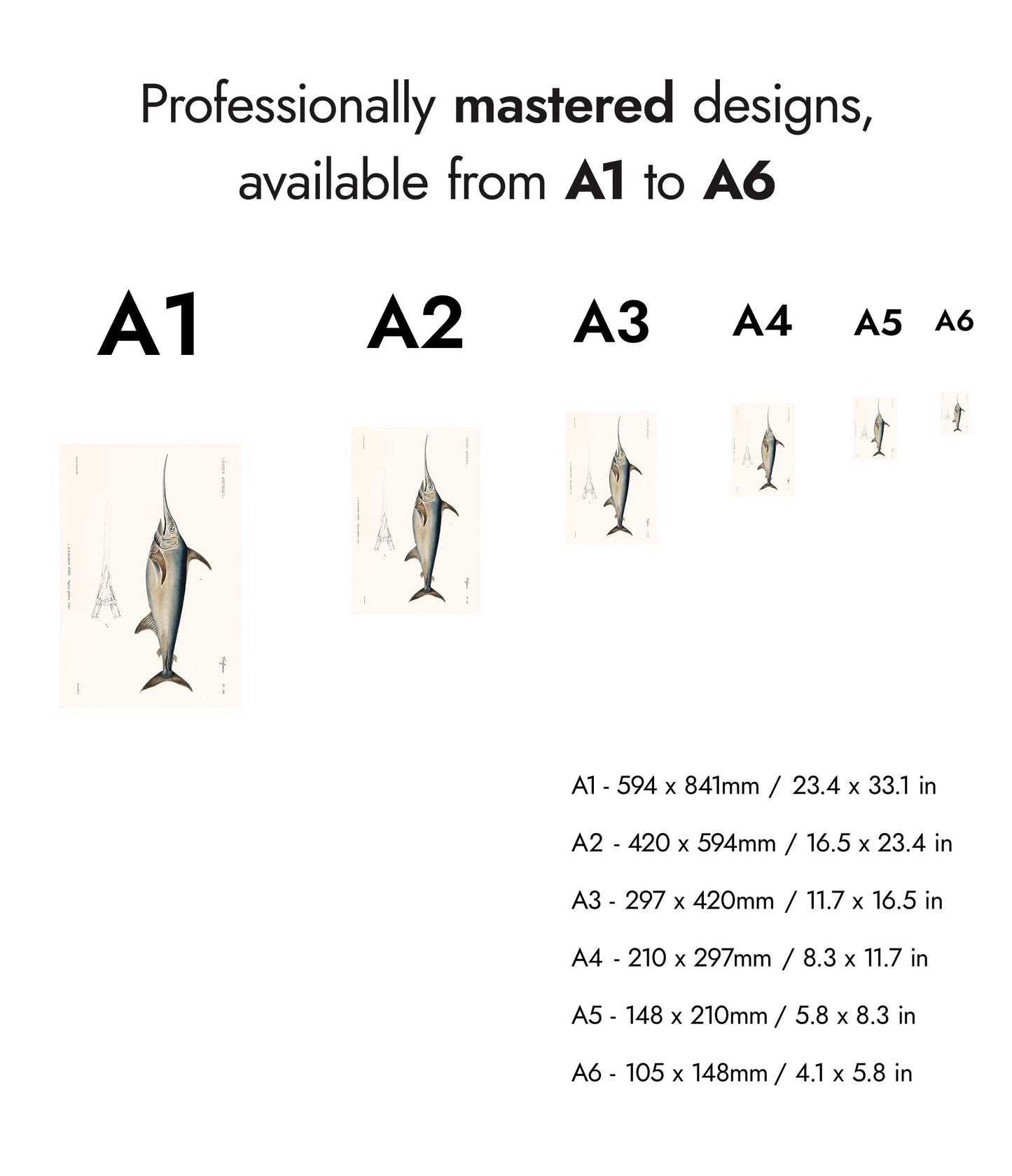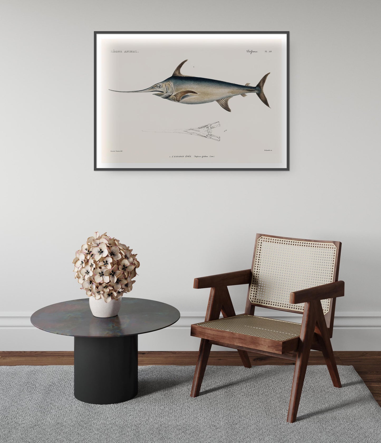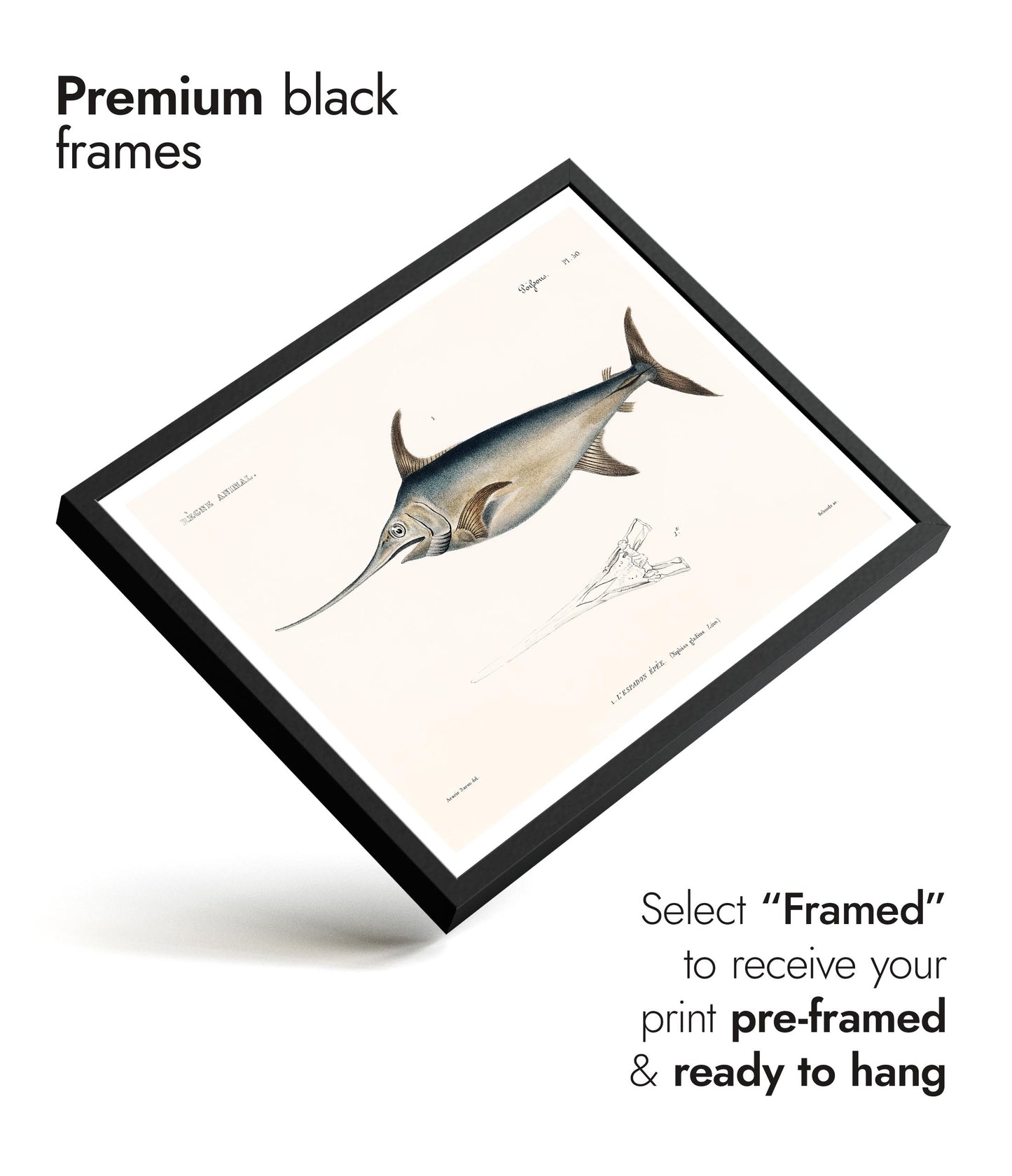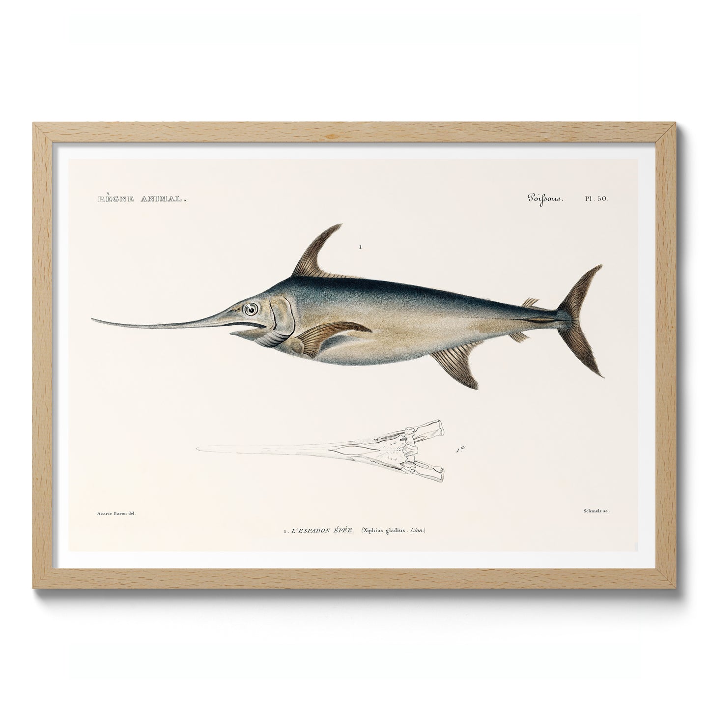 This vintage style "Swordfish" poster by renowned naturalist Georges Cuvier depicts an intricately detailed illustration of the majestic swordfish. The artwork features precise anatomical details, highlighted by the swordfish's elongated body and characteristic sword-like bill. Ideal for nature and marine life enthusiasts, this piece combines scientific accuracy with artistic elegance. Perfect for adding a touch of sophistication to any space.