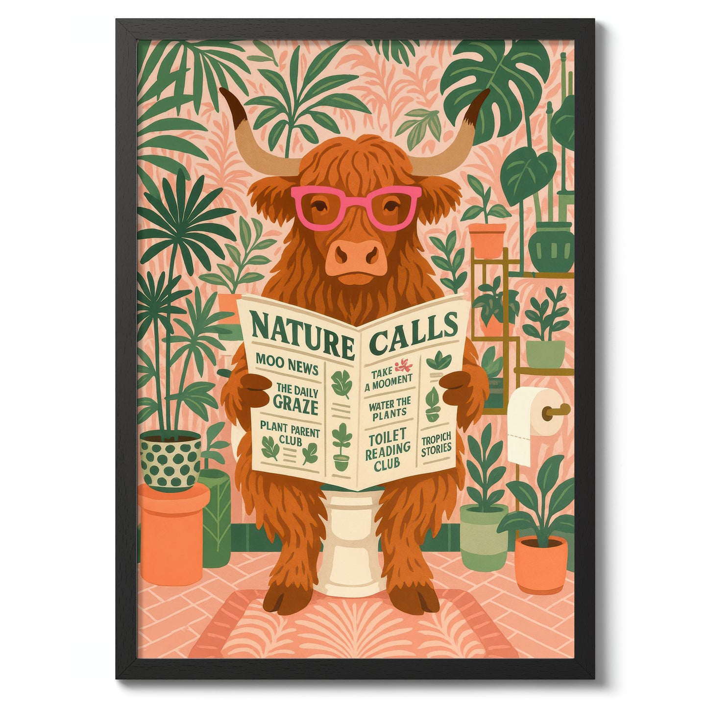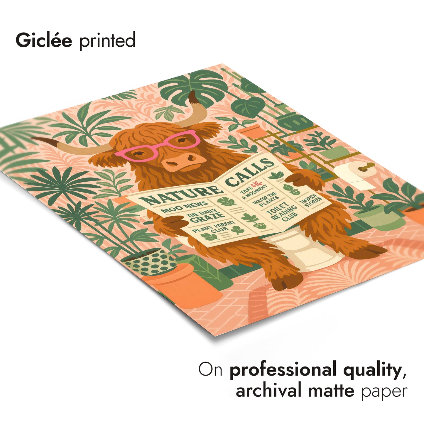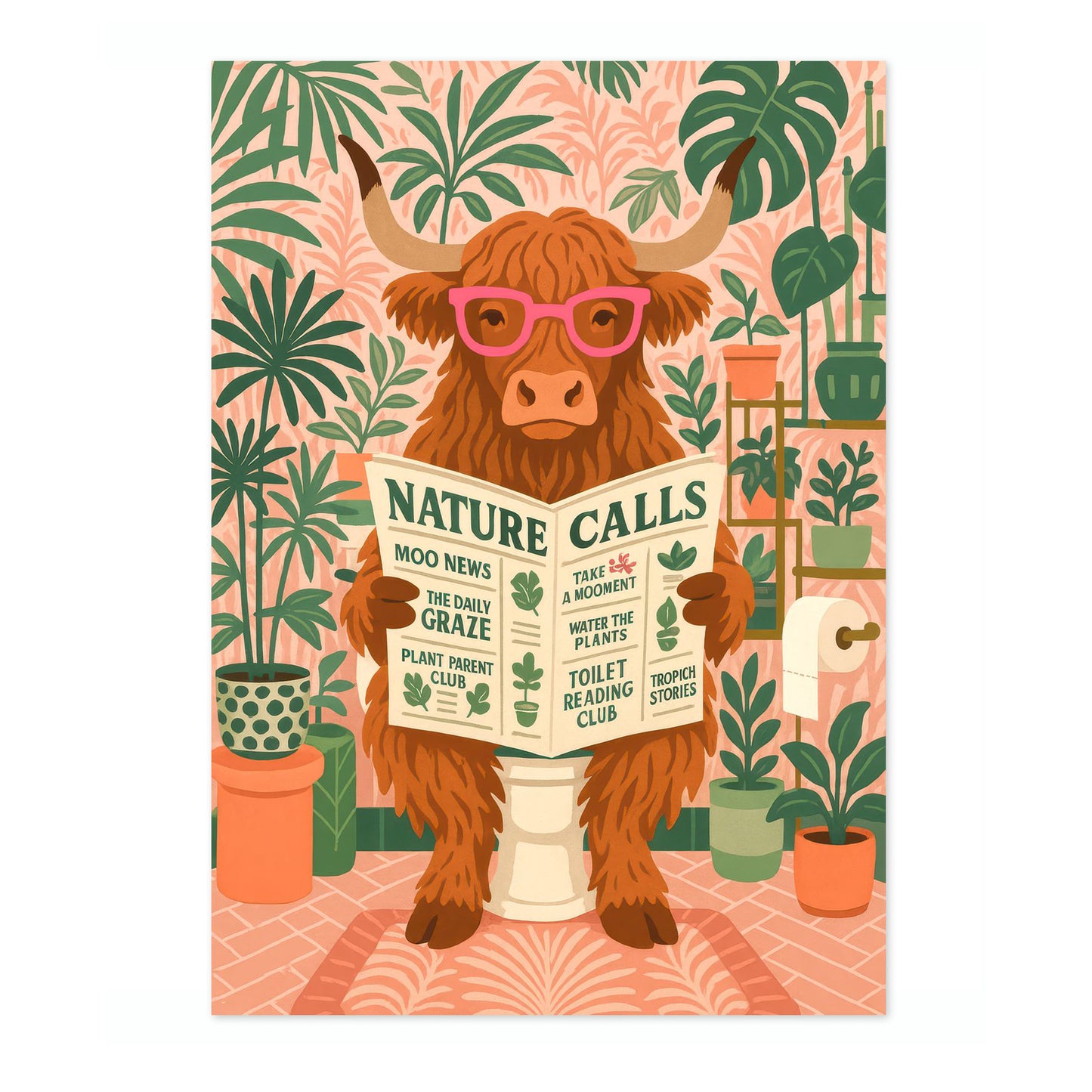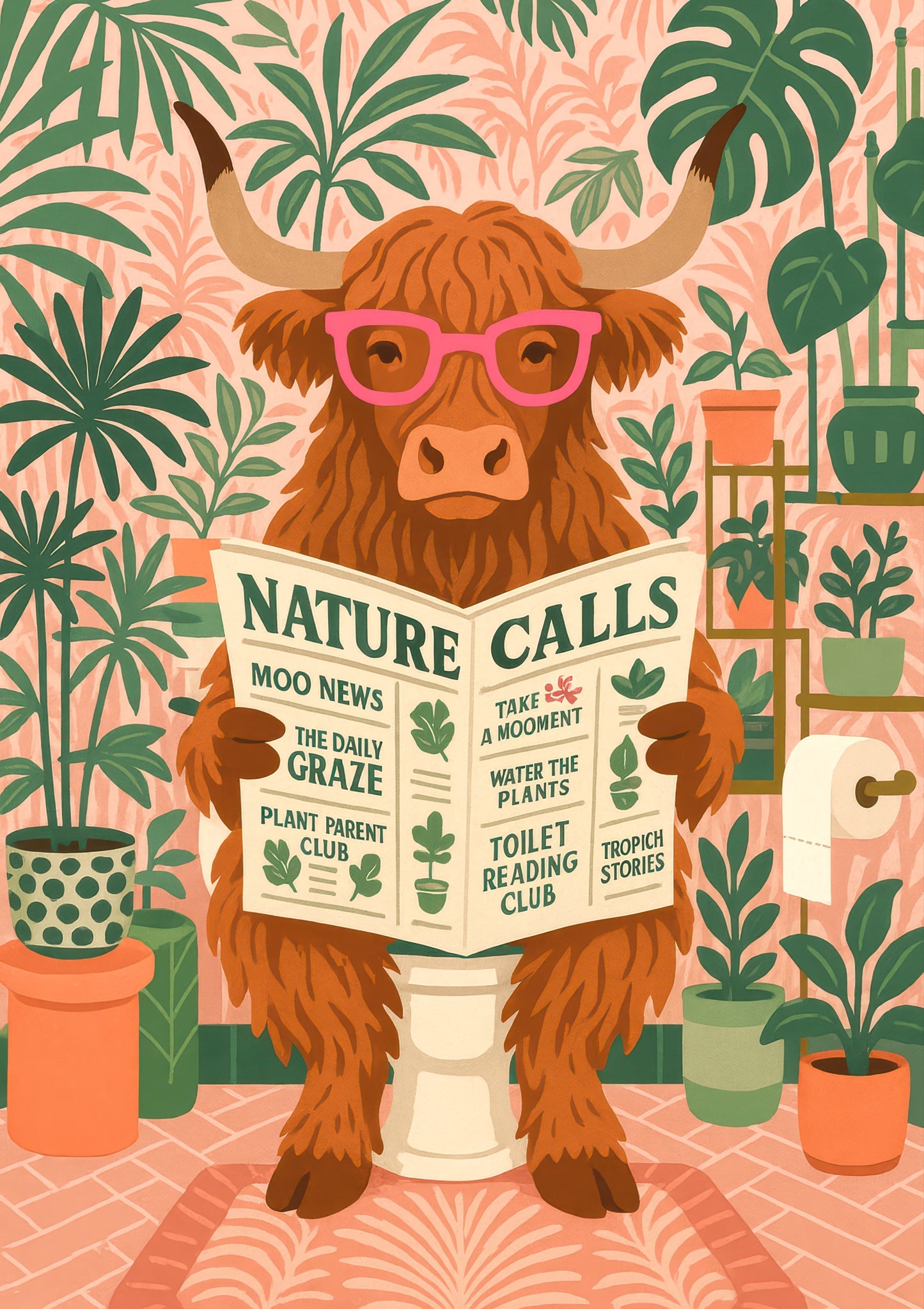 This whimsical poster, titled "Take a Mooment," features a highland cow sporting pink glasses as it whimsically reads a newspaper titled "Nature Calls." Surrounded by lush green plants in a cozy bathroom setting, this illustration seamlessly blends boho and nature themes, offering a playful touch to your space. Ideal for adding a humorous, nature-inspired vibe to any room.