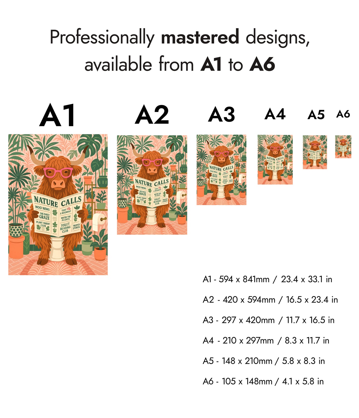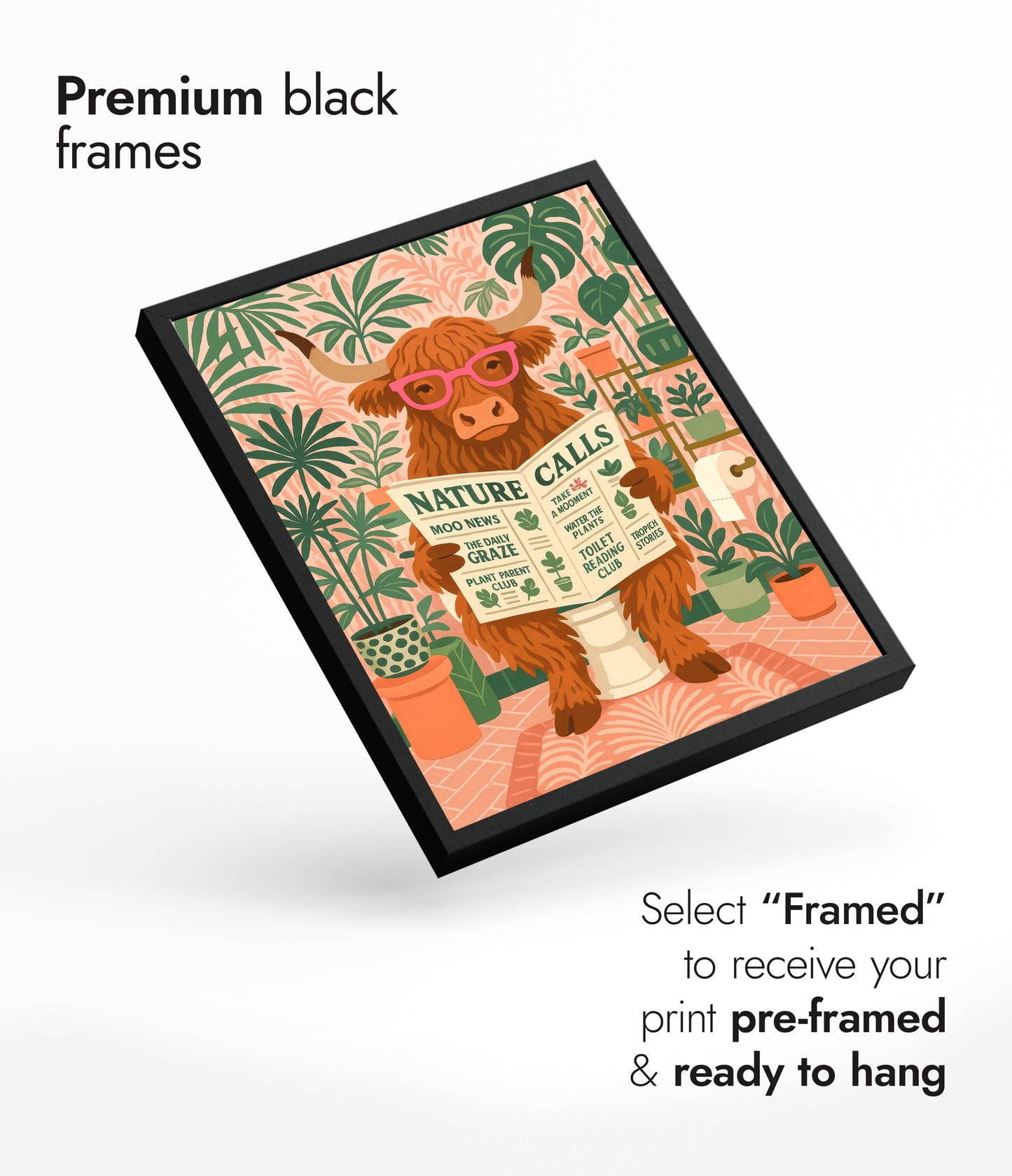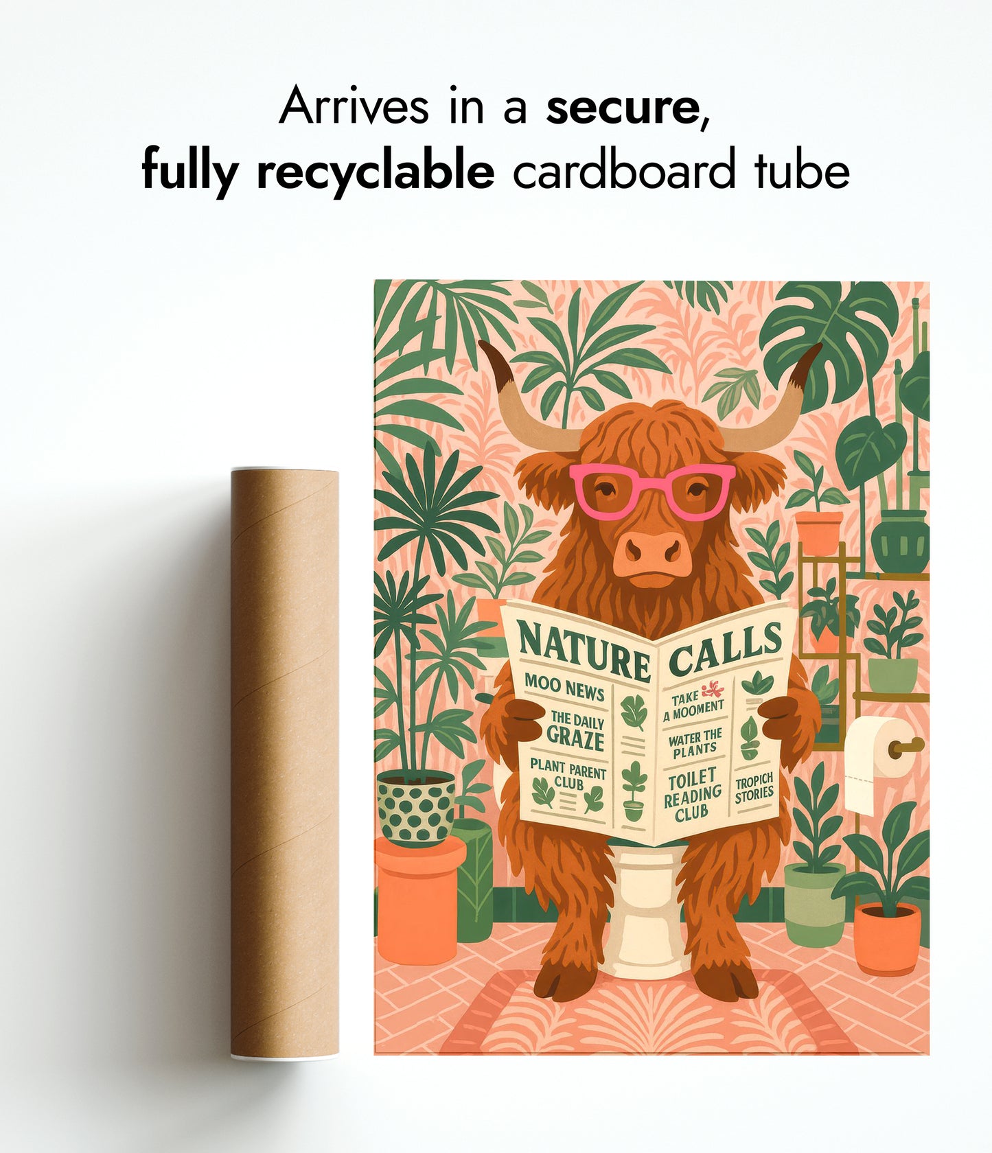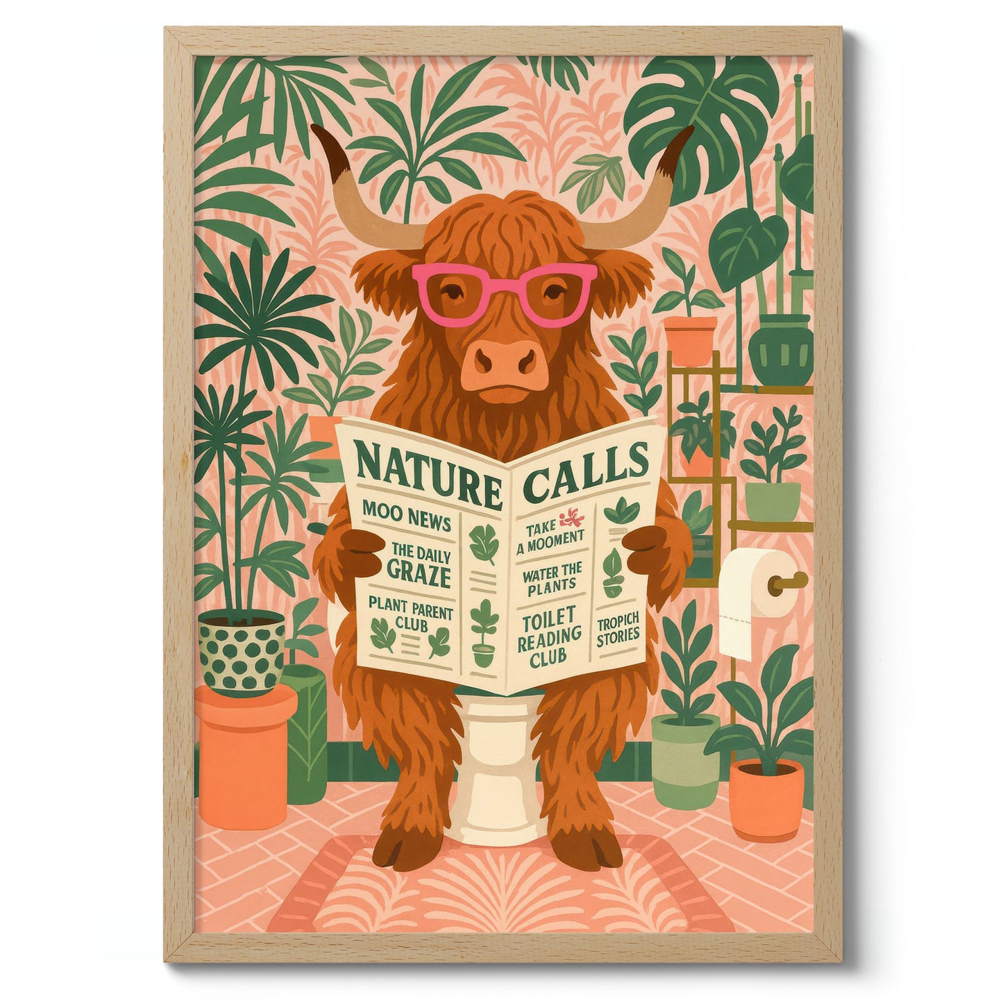 This whimsical poster, titled "Take a Mooment," features a highland cow sporting pink glasses as it whimsically reads a newspaper titled "Nature Calls." Surrounded by lush green plants in a cozy bathroom setting, this illustration seamlessly blends boho and nature themes, offering a playful touch to your space. Ideal for adding a humorous, nature-inspired vibe to any room.