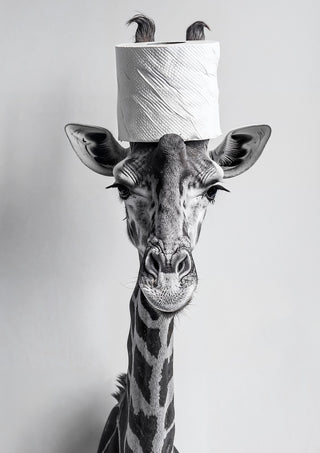 This playful "Tall Order" poster captures a black and white photograph of a giraffe humorously crowned with a roll of toilet paper. Combining elements of nature and humor, this striking image brings a whimsical touch to bathroom decor. Its monochrome palette enhances the giraffe's graceful textures, making it an eye-catching addition to any space.