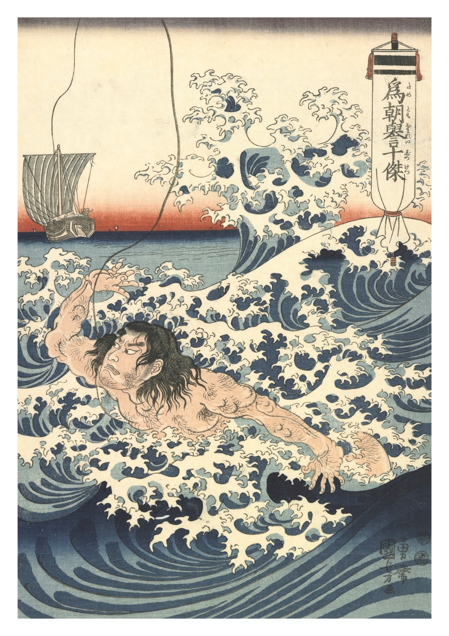 This stunning woodblock poster, "Tametomo's Ten Heroic Deeds" by Utagawa Kuniyoshi, captures the legendary warrior amidst turbulent waves, symbolizing his mythical strength. The traditional ukiyo-e illustration vividly depicts Tametomo's defiance against a stormy sea, with a distant boat adding depth and drama to the scene. Ideal for fans of Japanese art and historical heroism.