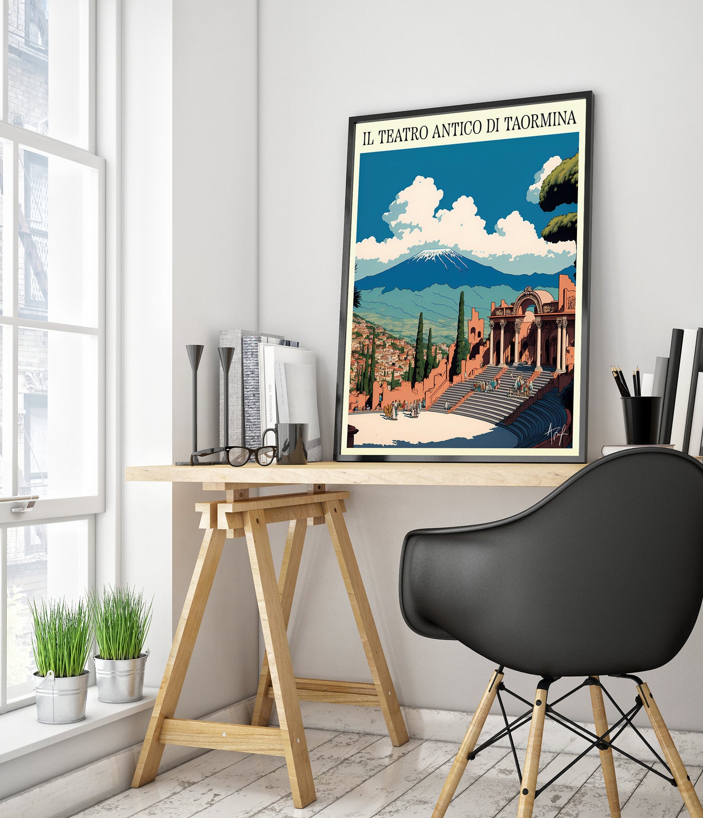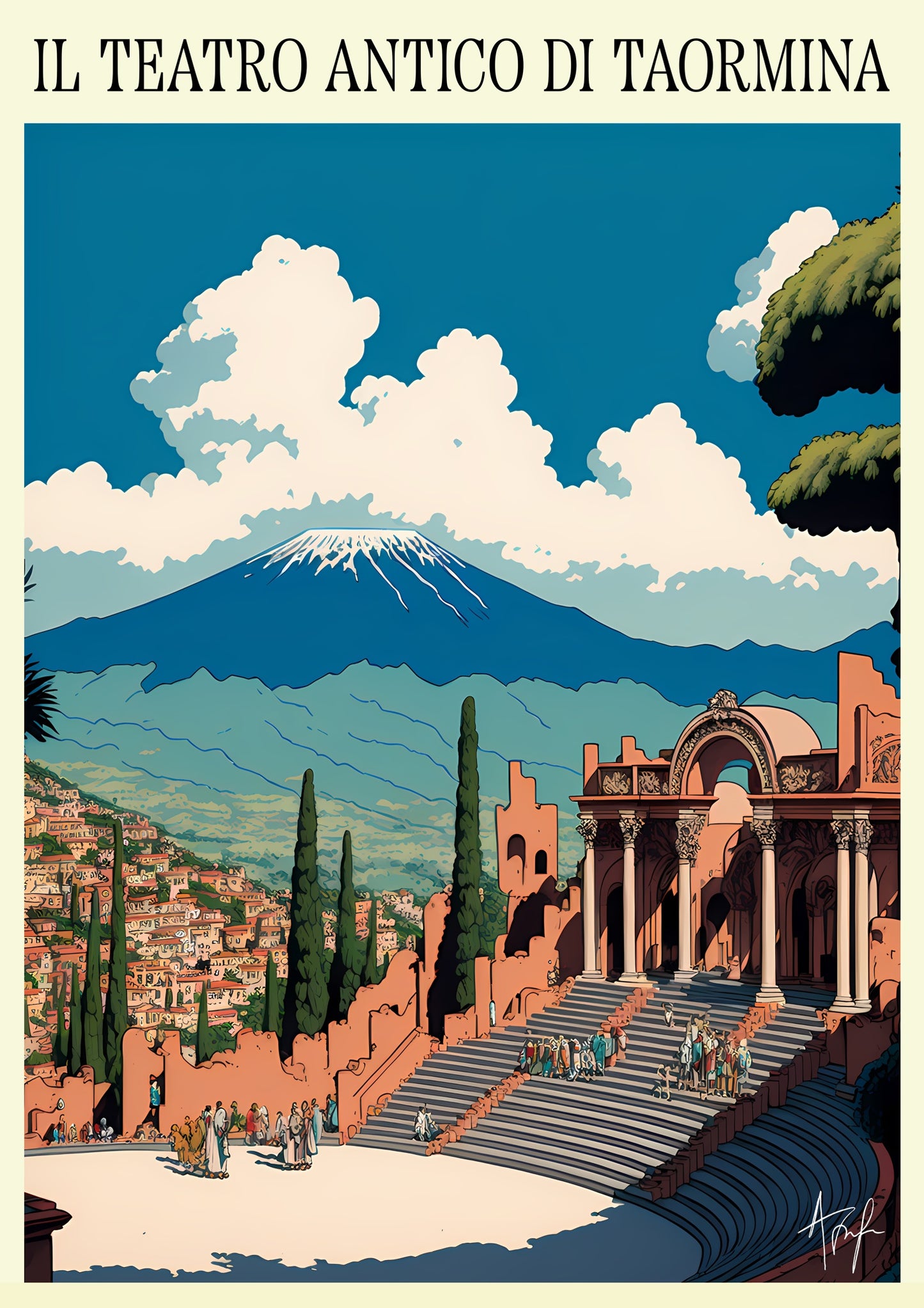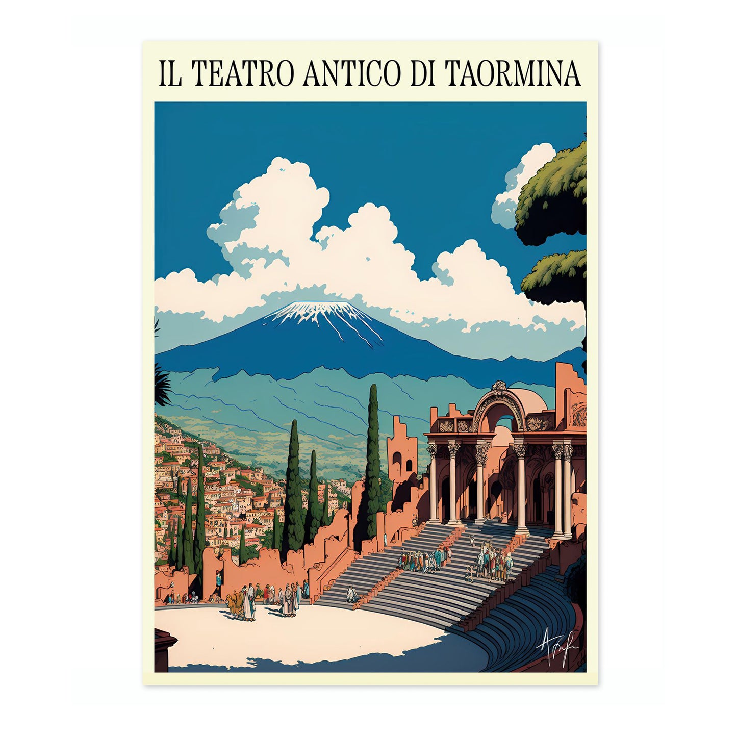 This vintage-style illustration poster depicts the stunning Teatro Antico di Taormina. The artwork highlights the theater's classic architecture against a backdrop of a majestic mountain and scenic skies filled with fluffy clouds. The vibrant orange and blue hues capture the charm of this historical Italian viewpoint, perfect for those seeking travel-inspired art prints.