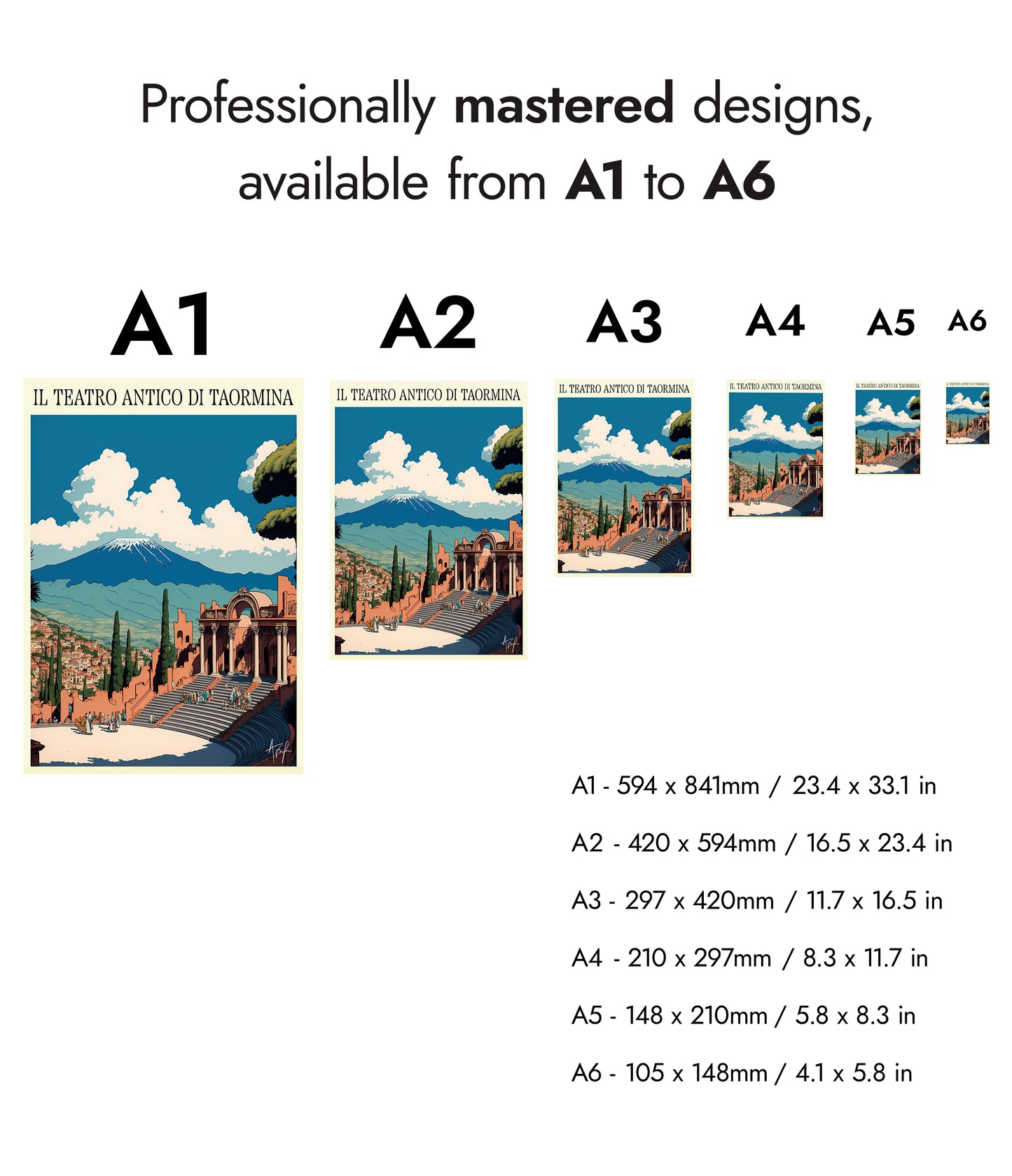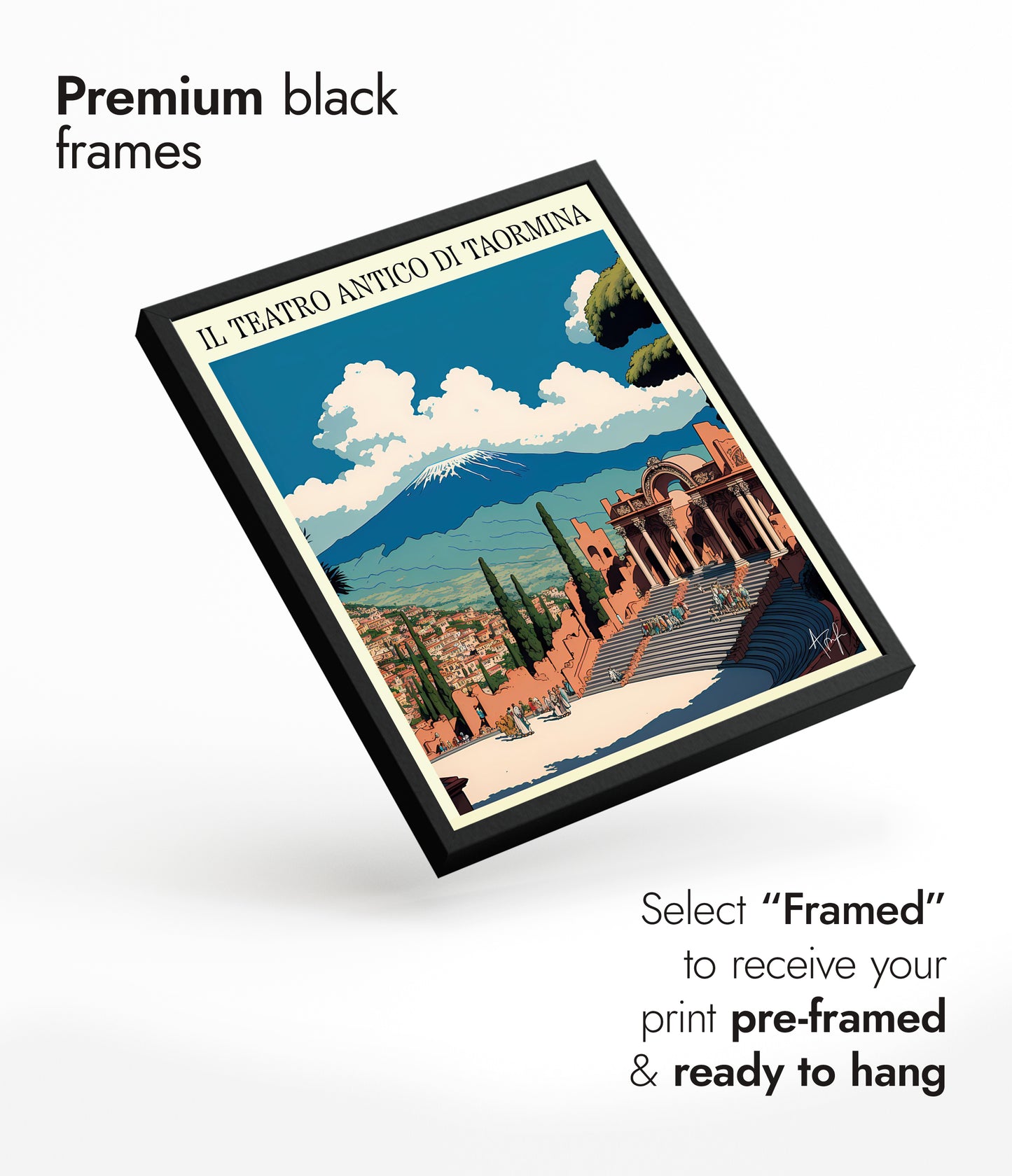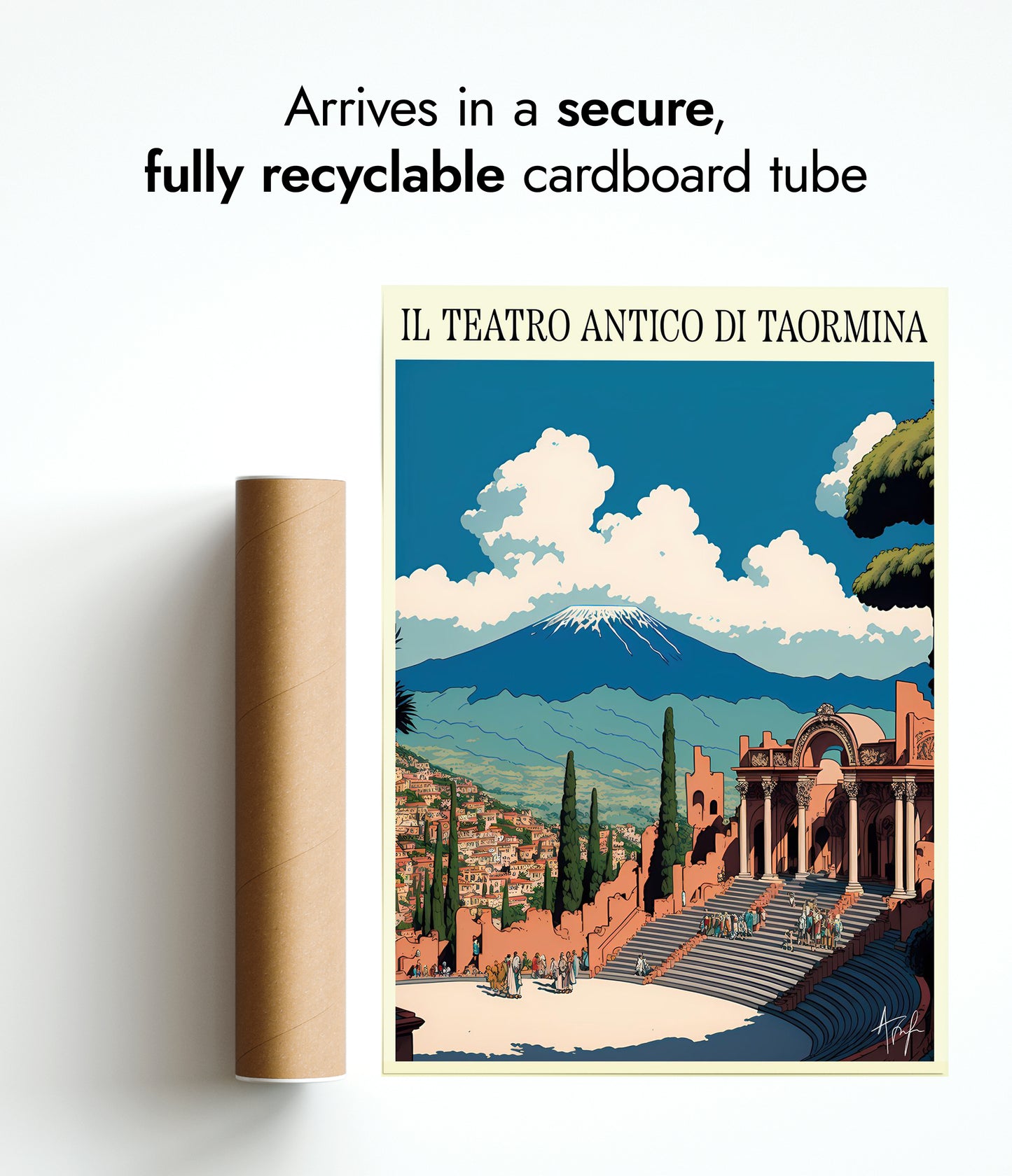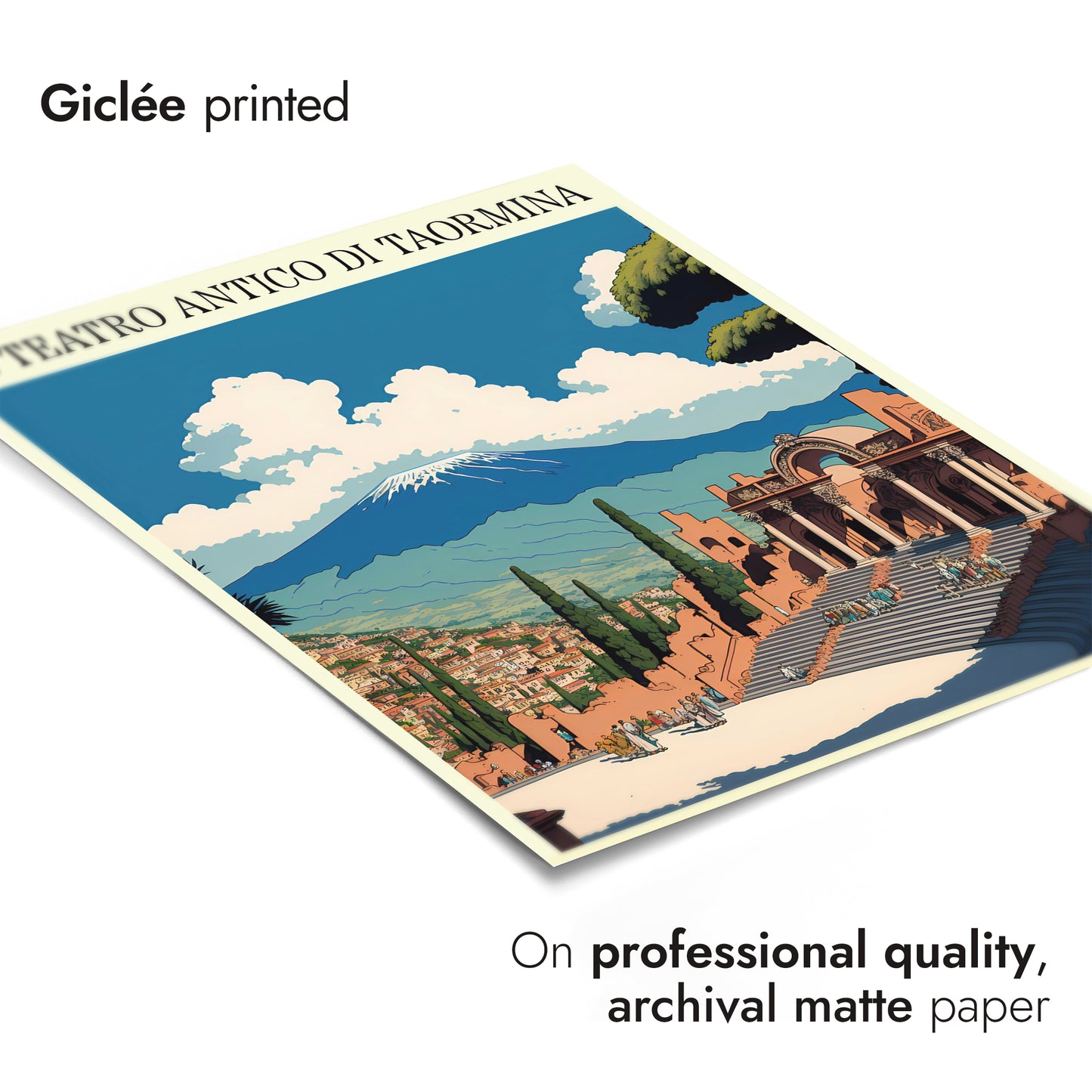 This vintage-style illustration poster depicts the stunning Teatro Antico di Taormina. The artwork highlights the theater's classic architecture against a backdrop of a majestic mountain and scenic skies filled with fluffy clouds. The vibrant orange and blue hues capture the charm of this historical Italian viewpoint, perfect for those seeking travel-inspired art prints.