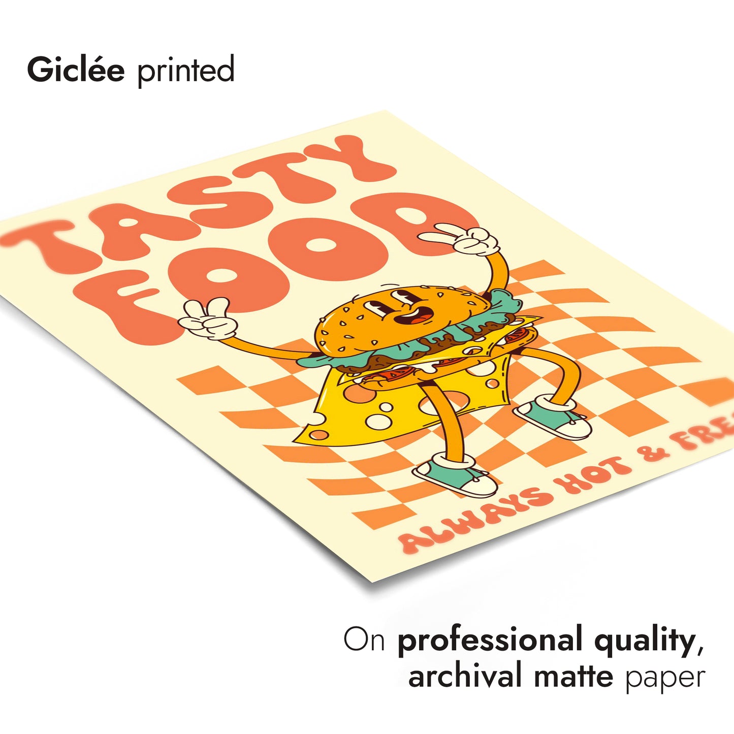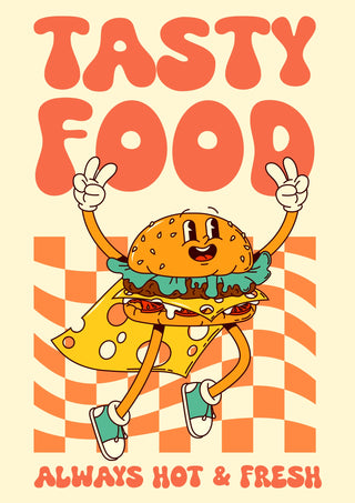 This vibrant retro poster features a cheerful cartoon burger mascot, exuding playful energy with peace-sign gestures. Set against a checkered backdrop, the bold "Tasty Food" typography headlines the design, while "Always Hot & Fresh" adds a promise of quality. This graphic art print, perfect for food enthusiasts, captures the essence of fun dining experiences in a vintage style.