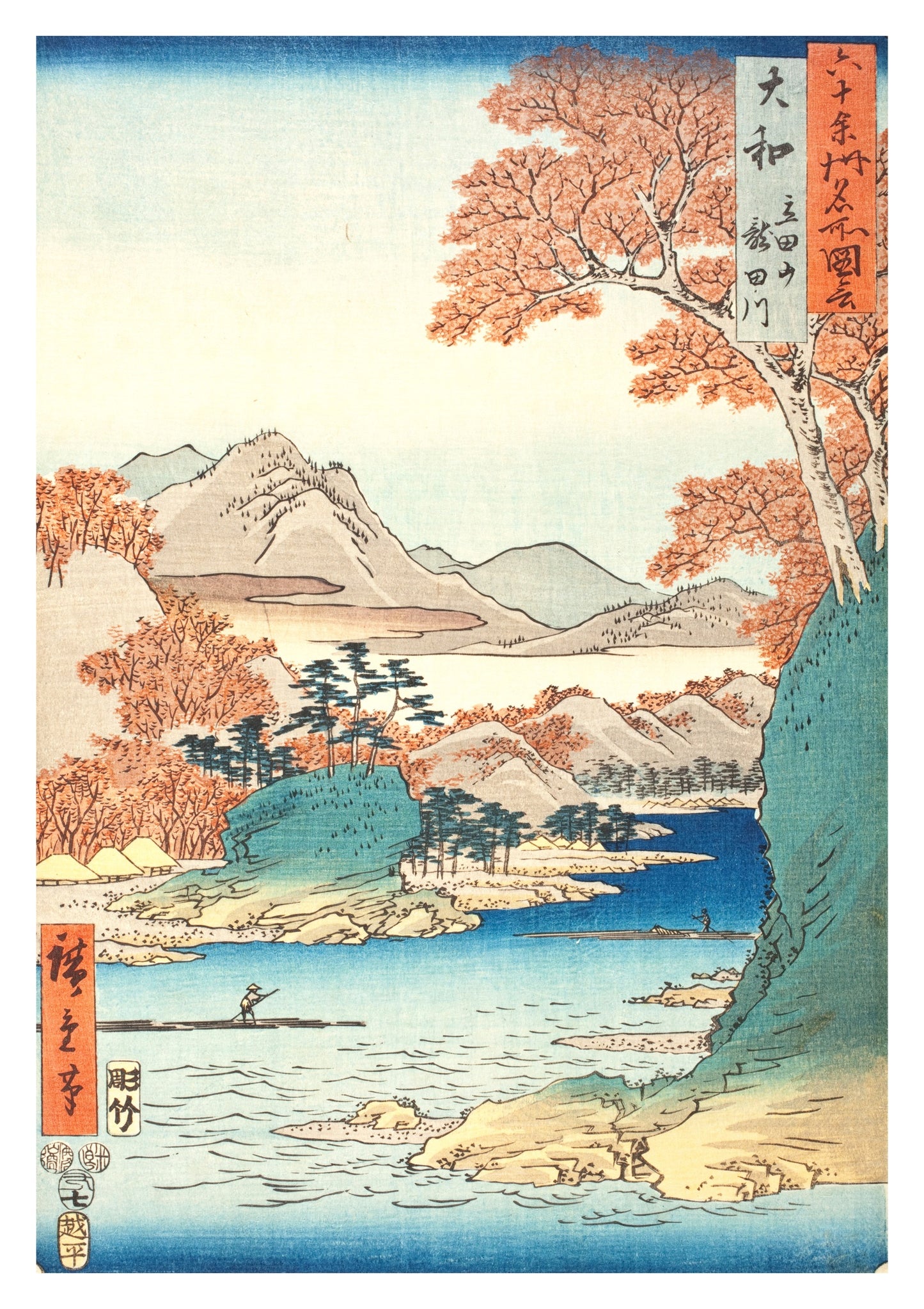 Introducing the "Tatsuta Mountain & Tatsuta River" poster, showcasing Utagawa Hiroshige's traditional woodblock artistry. This illustration captures a serene landscape of flowing rivers, autumnal trees, and distant mountains. A lone boatman enhances the peaceful atmosphere of this iconic ukiyo-e style piece, perfect for adding a touch of Japanese culture to your space.
