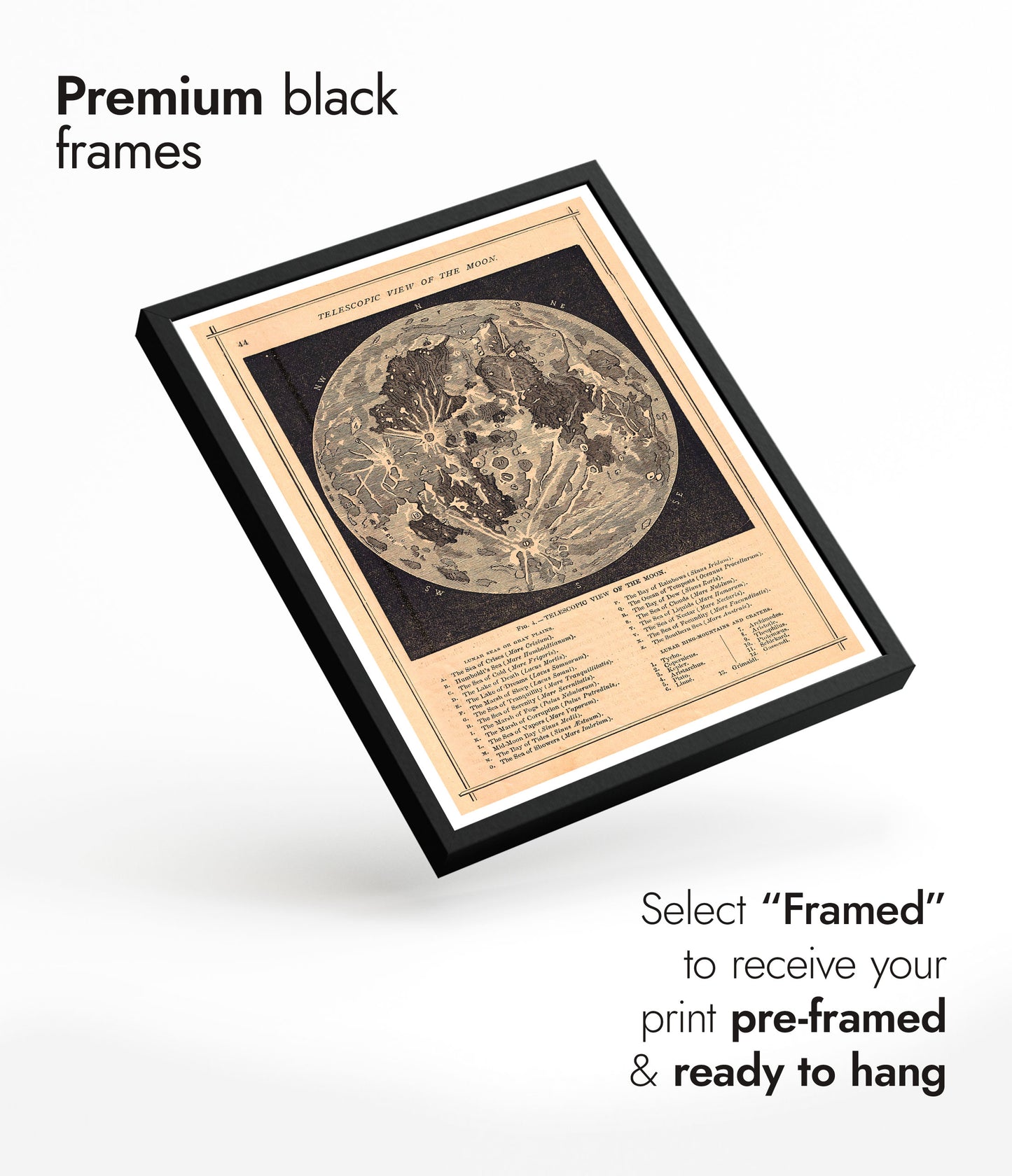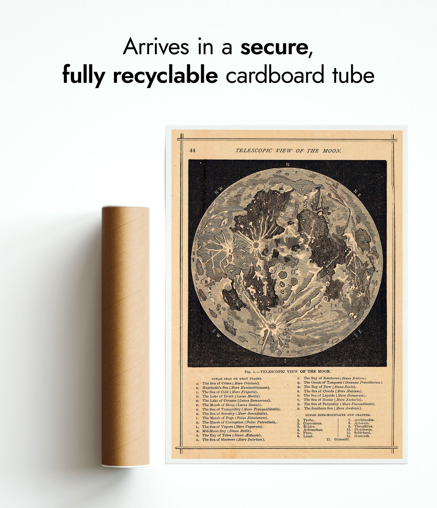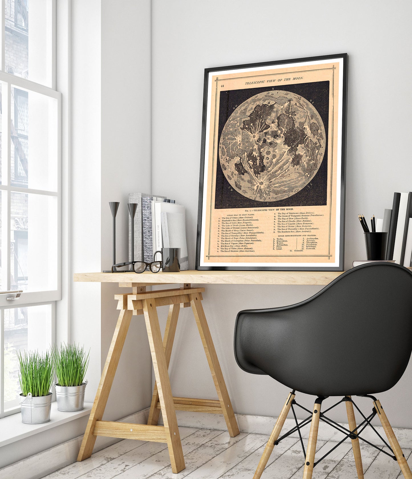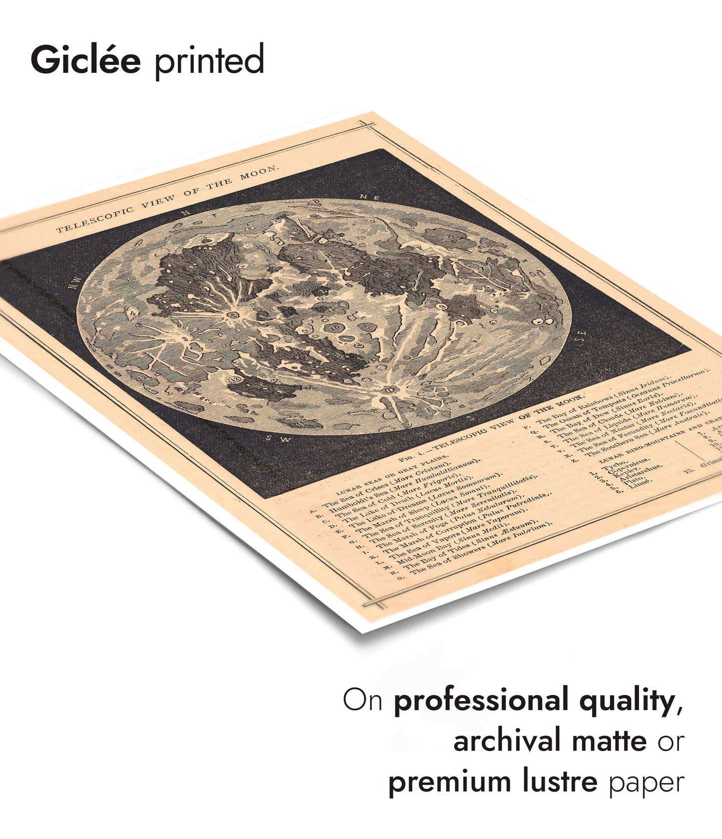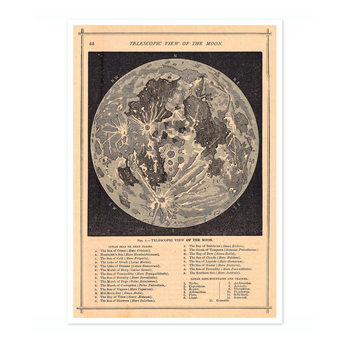 This vintage poster titled "Telescopic View of the Moon" presents a detailed, illustrated map of the moon from a telescopic perspective. Perfect for space enthusiasts, it captures the intricate lunar surface with labeled features, offering a rich glimpse into celestial cartography. Ideal for adding a classic, astronomical touch to any room.