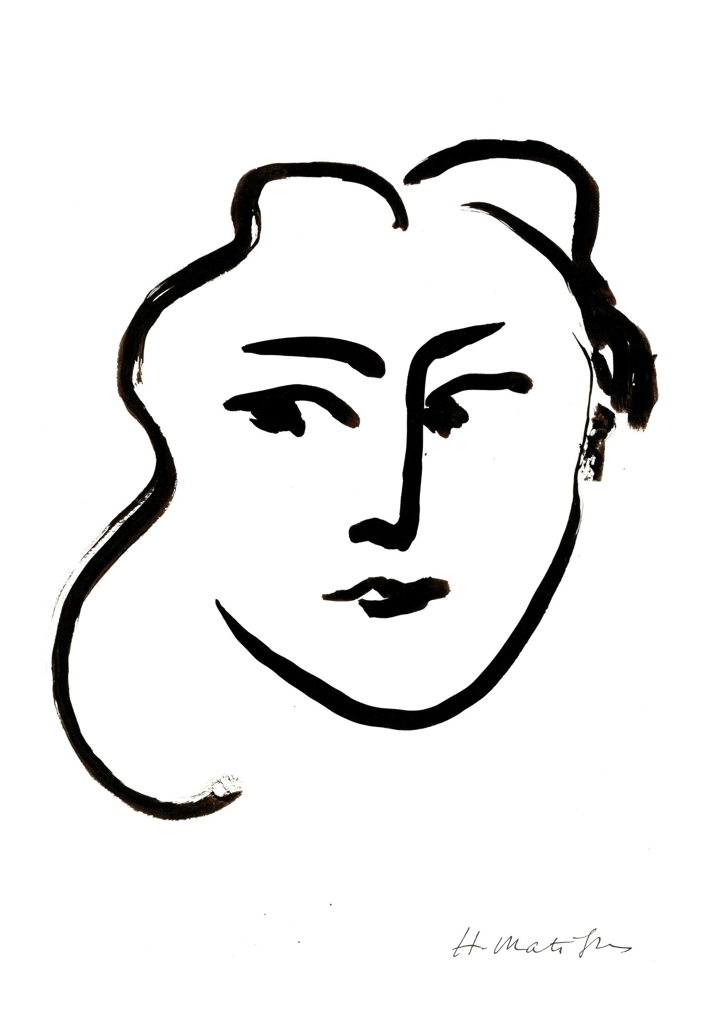 “Tete de Femme III” by Henri Matisse is a minimalist portrait poster featuring fluid, expressive black lines forming a woman's head. Evoking elements of Fauvism, the artwork captures serene facial features with striking simplicity. Ideal for those appreciating minimalistic and modern art, this poster highlights Matisse’s masterful use of bold, sweeping strokes to convey emotion and elegance.