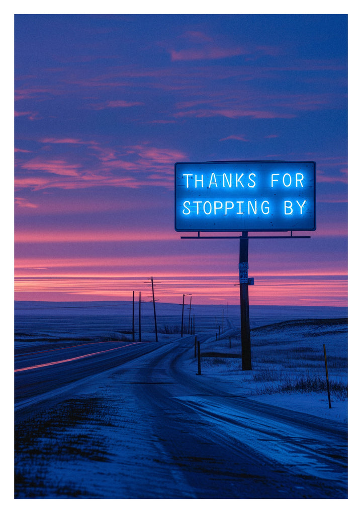 This modern photographic poster titled "Thanks for Stopping By" features a glowing neon sign against a wintery, snow-covered landscape. The vivid blue neon text contrasts with the stunning pink and purple sunset sky, creating a captivating visual appeal. Perfect for enthusiasts of neon photography and striking winter scenes, this portrait captures roadside Americana with a contemporary twist.