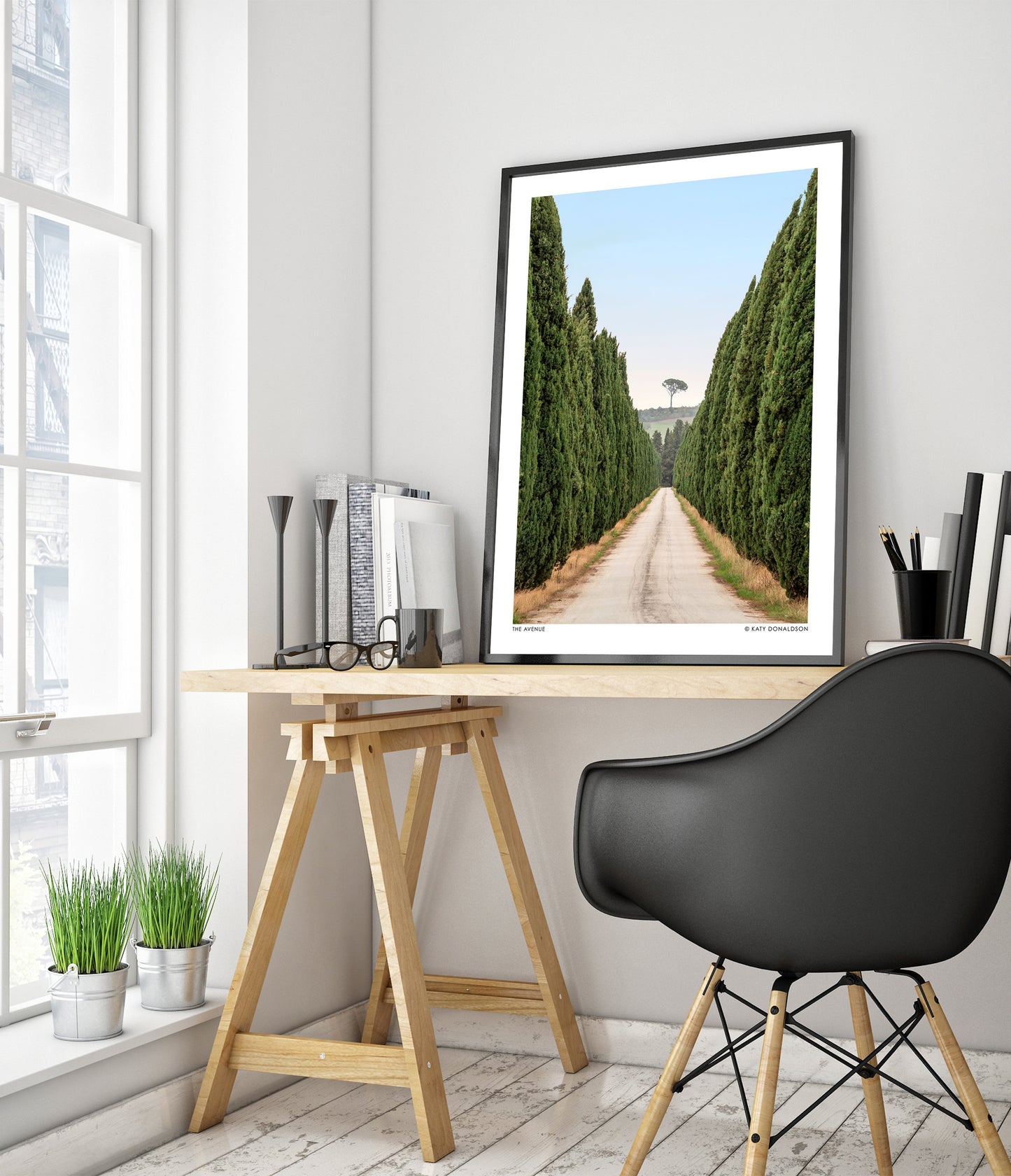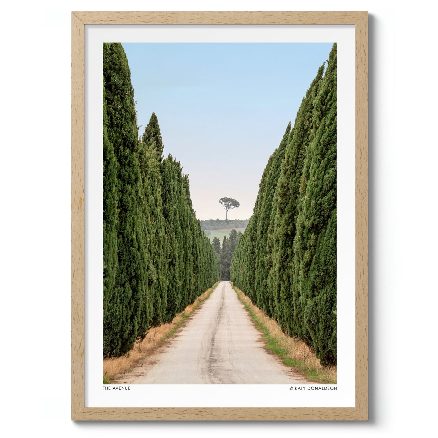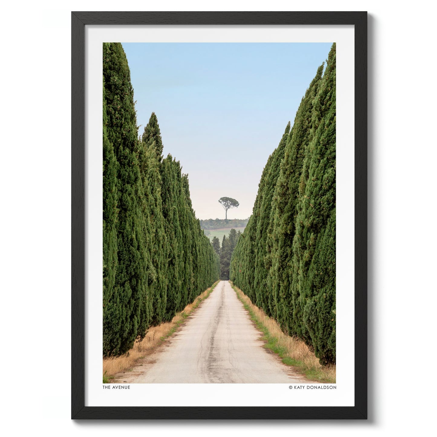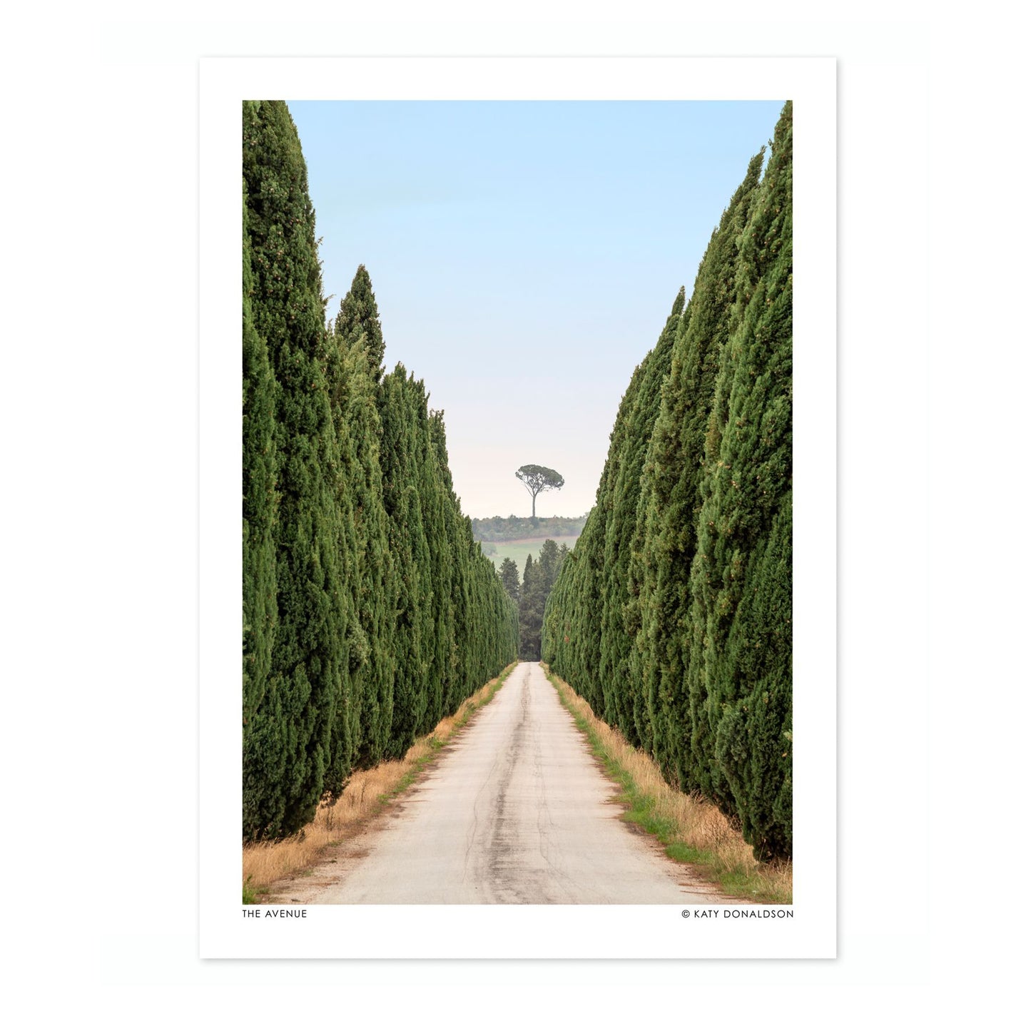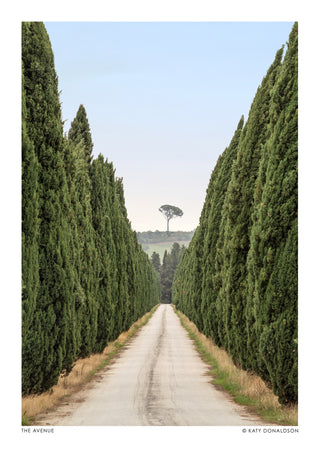 This captivating poster, "The Avenue Portrait" by Katy Donaldson, features a serene Italian landscape marked by a tree-lined path. Tall cypress trees border the pathway, leading the gaze towards a solitary distant tree against an expansive sky. Ideal for lovers of photography and travel, this art print beautifully encapsulates the essence of Italian tranquility.