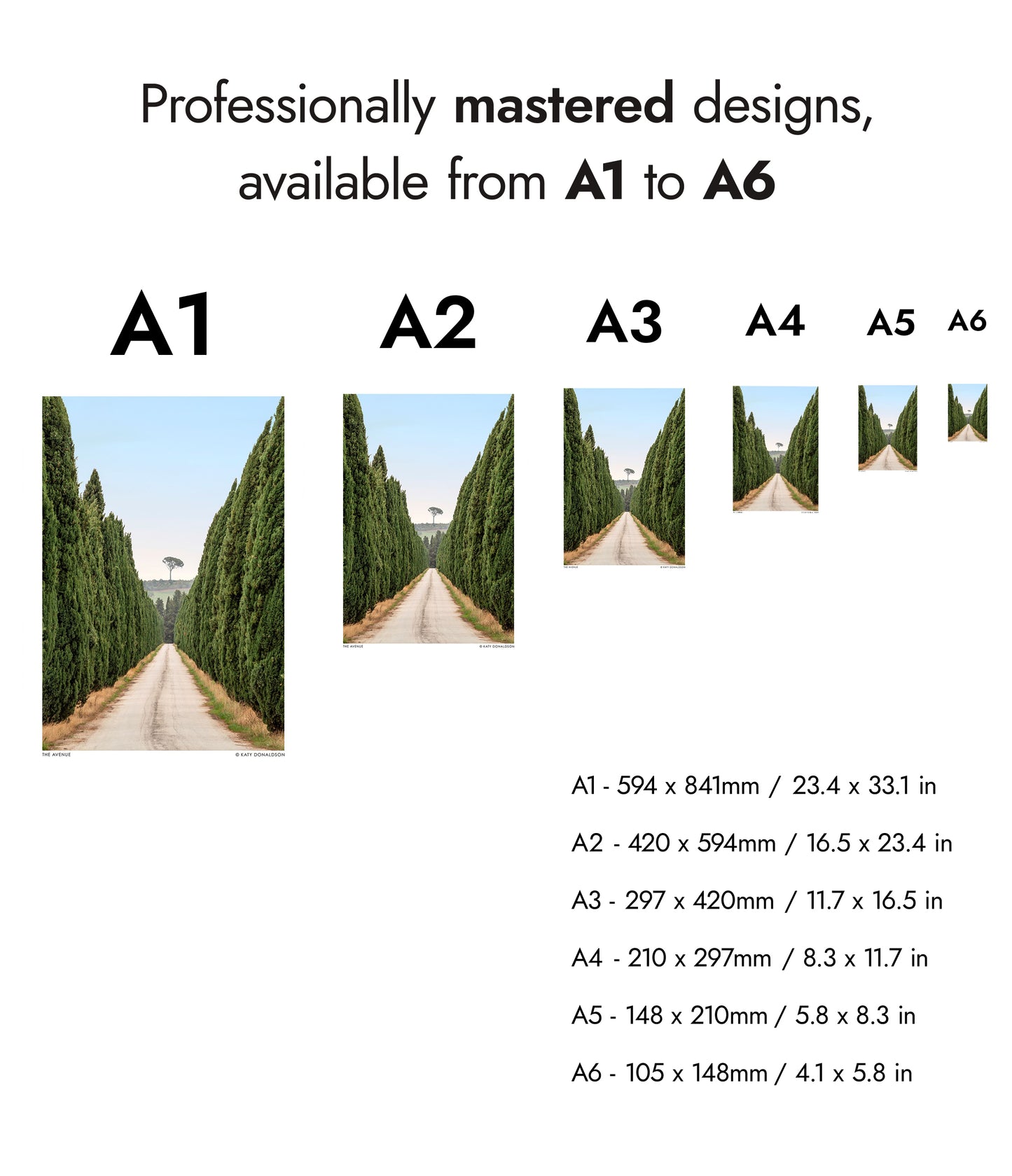 8 colour giclée print process on high-quality 230gsm archival matte paper. All our paper is FSC Certified and prints come with a lifetime fade-resistance guarantee.
