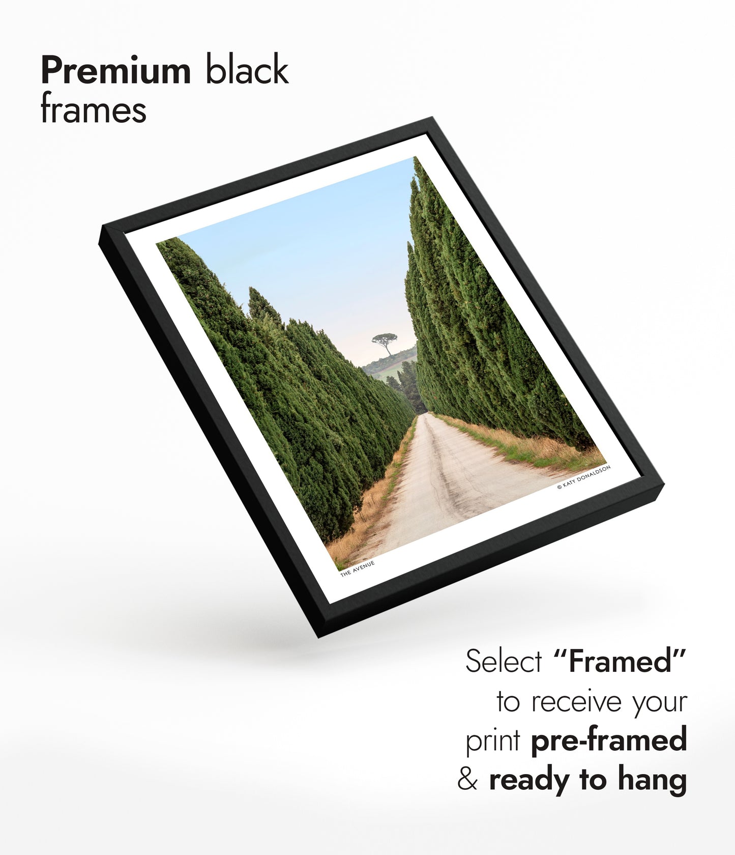 Solid wood frames available in black stained or natural finishes, with UV resistant acrylic glass. Framed orders arrive pre-installed with your choice of print, ready to hang. Available in all print sizes.