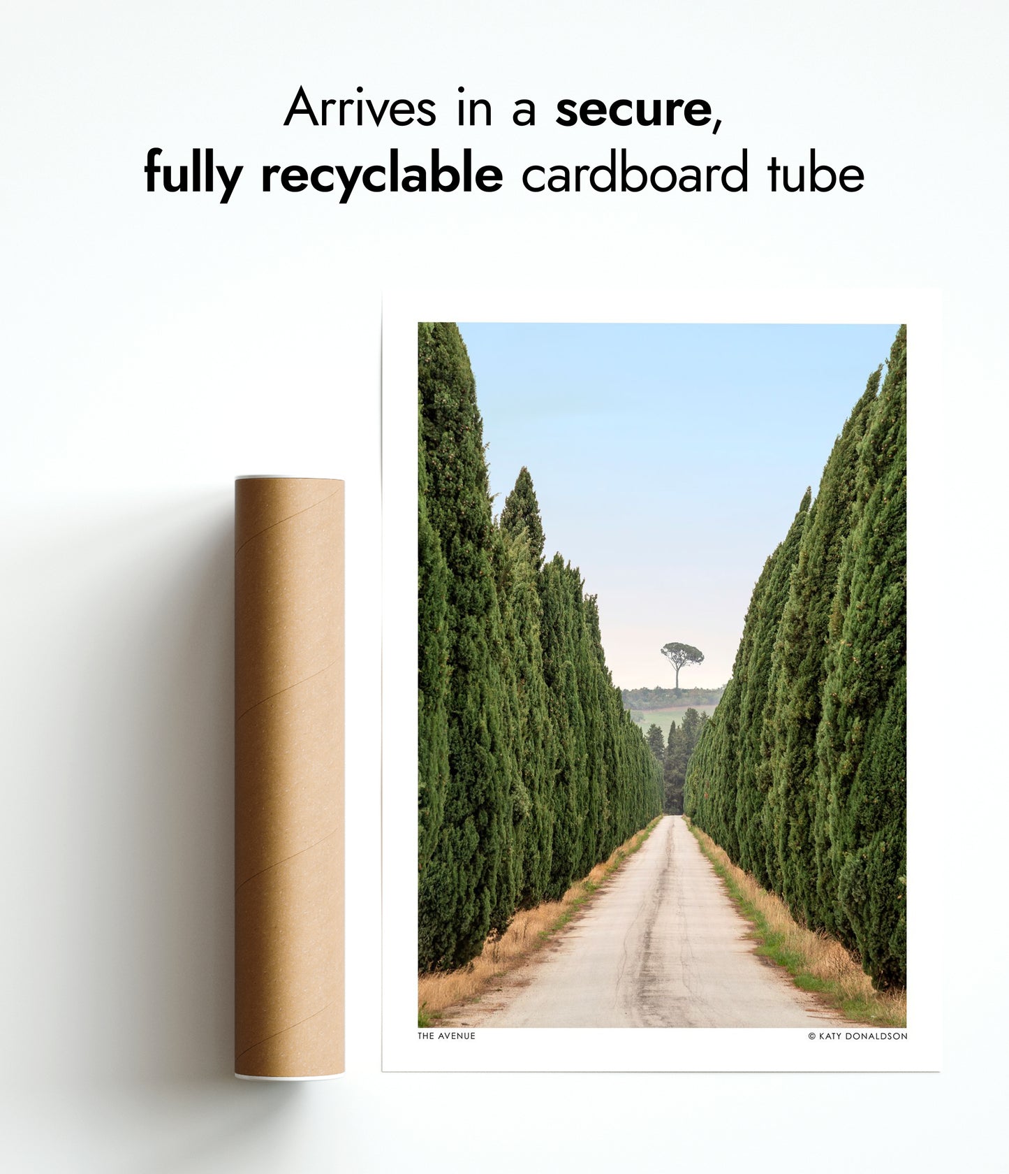 All orders are securely packed in recyclable, eco-friendly solutions. Frames are protected with sustainable bubble wrap alternatives inside thick boxes. Print only orders are shipped in heavy-duty cardboard tubes or protective hard-backed envelopes.