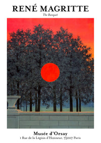 This poster features René Magritte's surrealist painting "The Banquet," depicting a fantastical forest scene. A vivid red sun stands out against the dusky twilight sky, while the uniform trees evoke a sense of mystery and tranquility. Ideal for fans of surrealism and art enthusiasts, this landscape captures Magritte's unique vision and evokes a dreamlike atmosphere.
