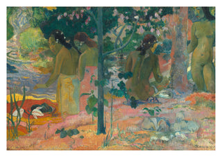This poster of Paul Gauguin's "The Bathers" captures an idyllic scene set in a lush forest near a tranquil lake. Women are depicted bathing and relaxing in vibrant hues, with an emphasis on nature and the human form. Characterized by Gauguin's Primitivism and Post-Impressionism styles, this piece highlights serene beauty and the simplicity of life immersed in nature.