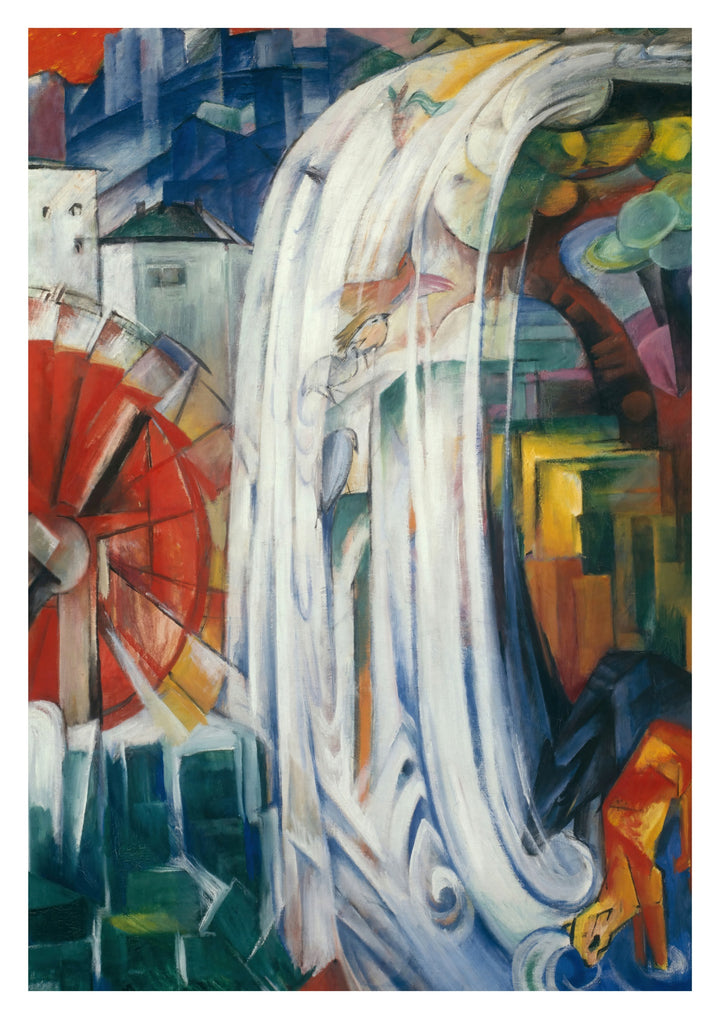 "The Bewitched Mill" poster showcases Franz Marc's cubist and abstract style. Featuring a dynamic waterfall cascading beside a village mill, vibrant geometric forms, and a serene river, this artwork captures nature's energy and beauty. Ideal for lovers of expressive landscapes and cubist abstraction.