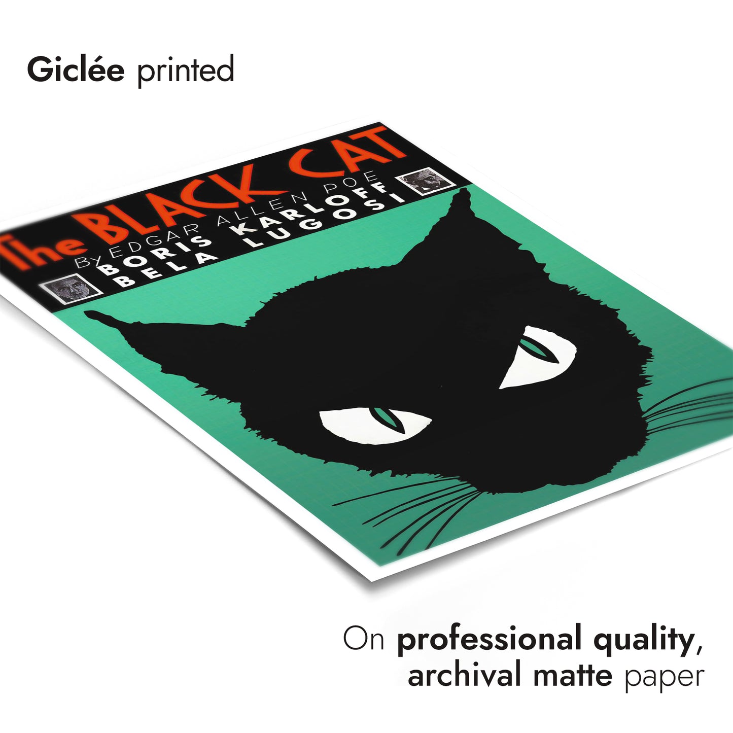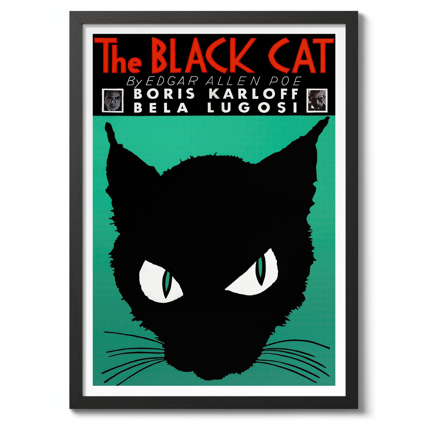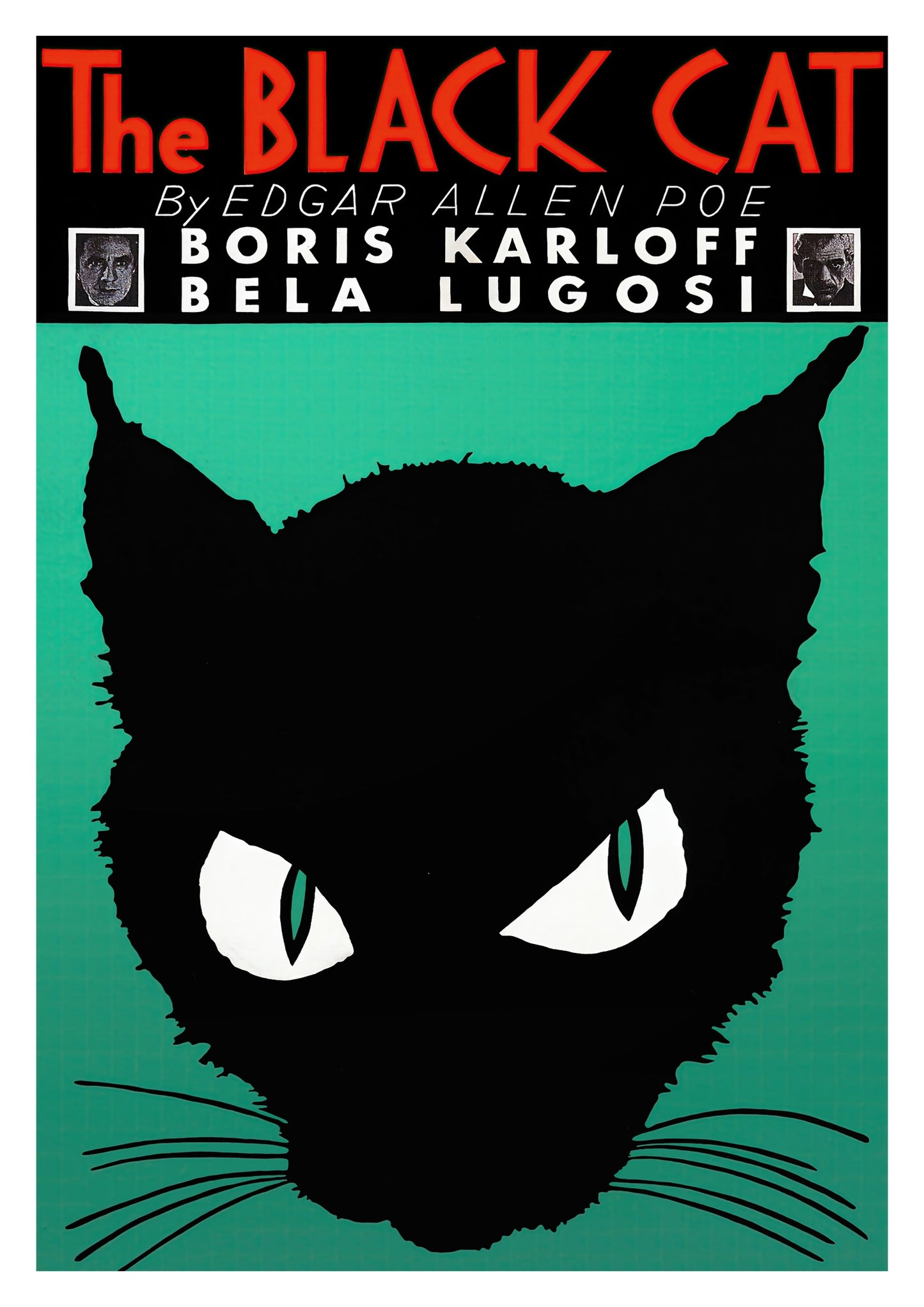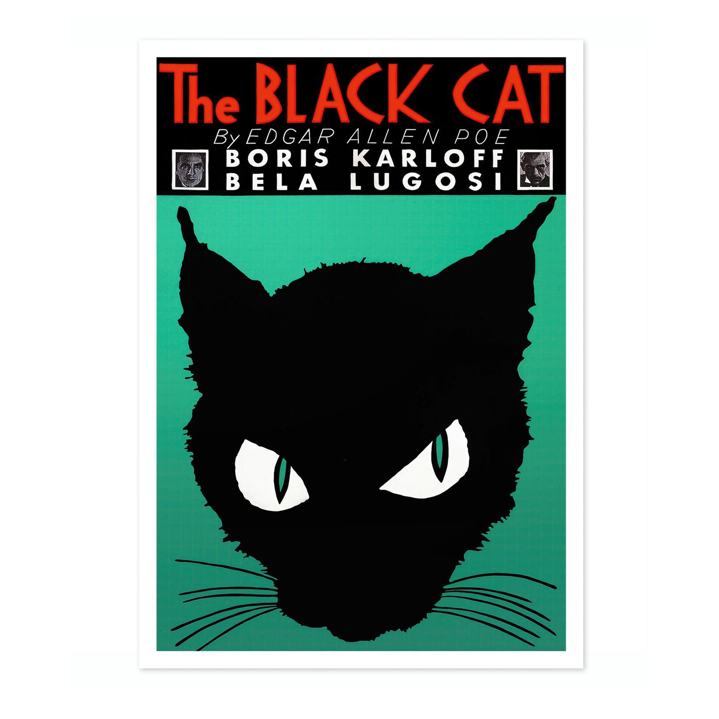 This vintage poster of "The Black Cat" features a striking silhouette of a black cat with piercing eyes set against a green background. Inspired by Edgar Allen Poe's work, it includes prominent typography displaying the title and names of iconic actors Boris Karloff and Bela Lugosi. Ideal for lovers of classic literature and vintage illustrations, this poster adds dramatic flair to any space.