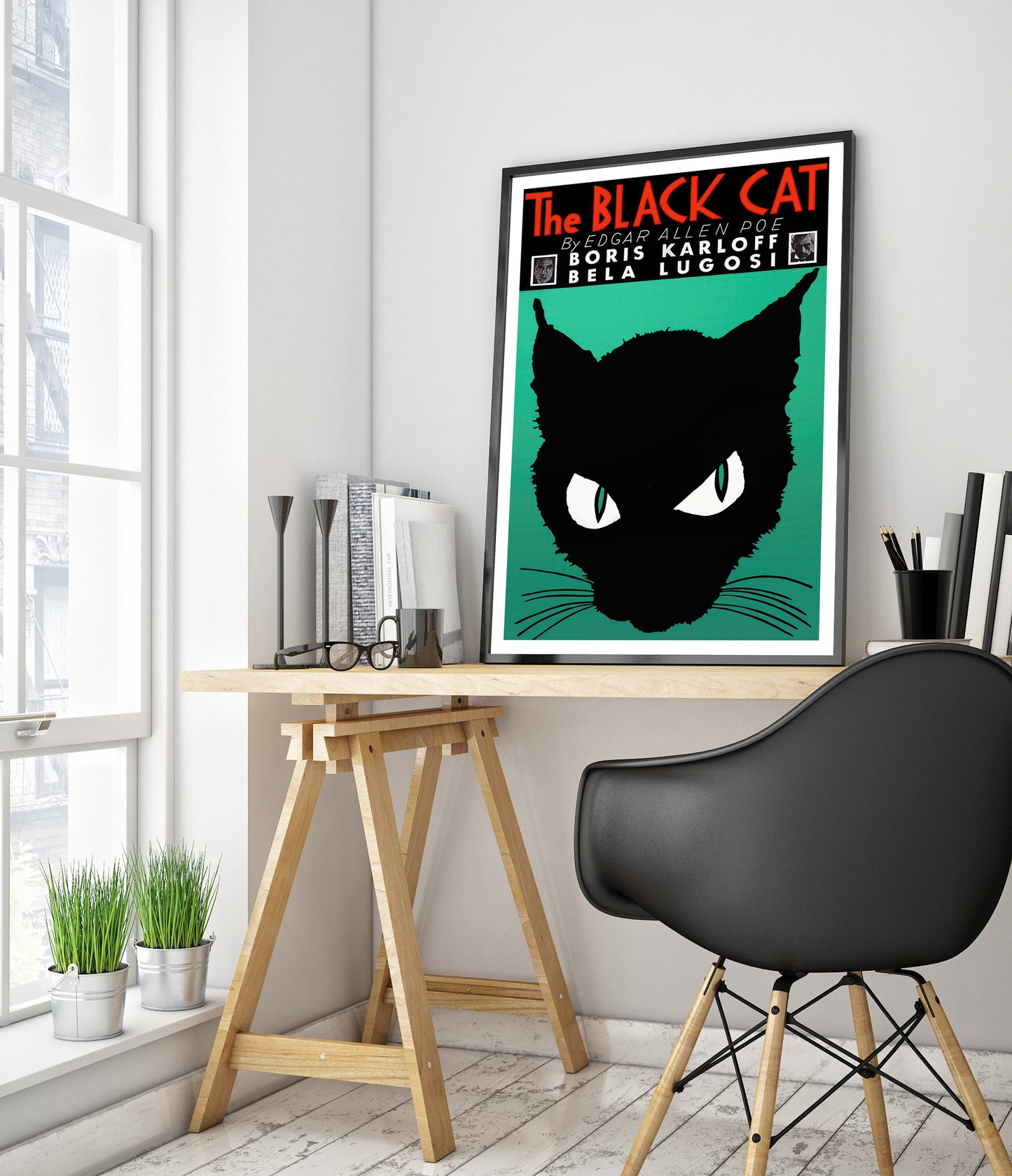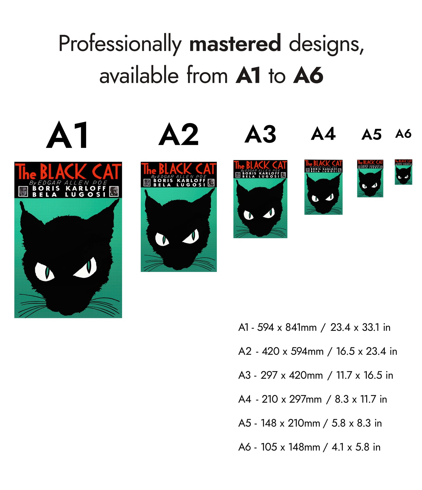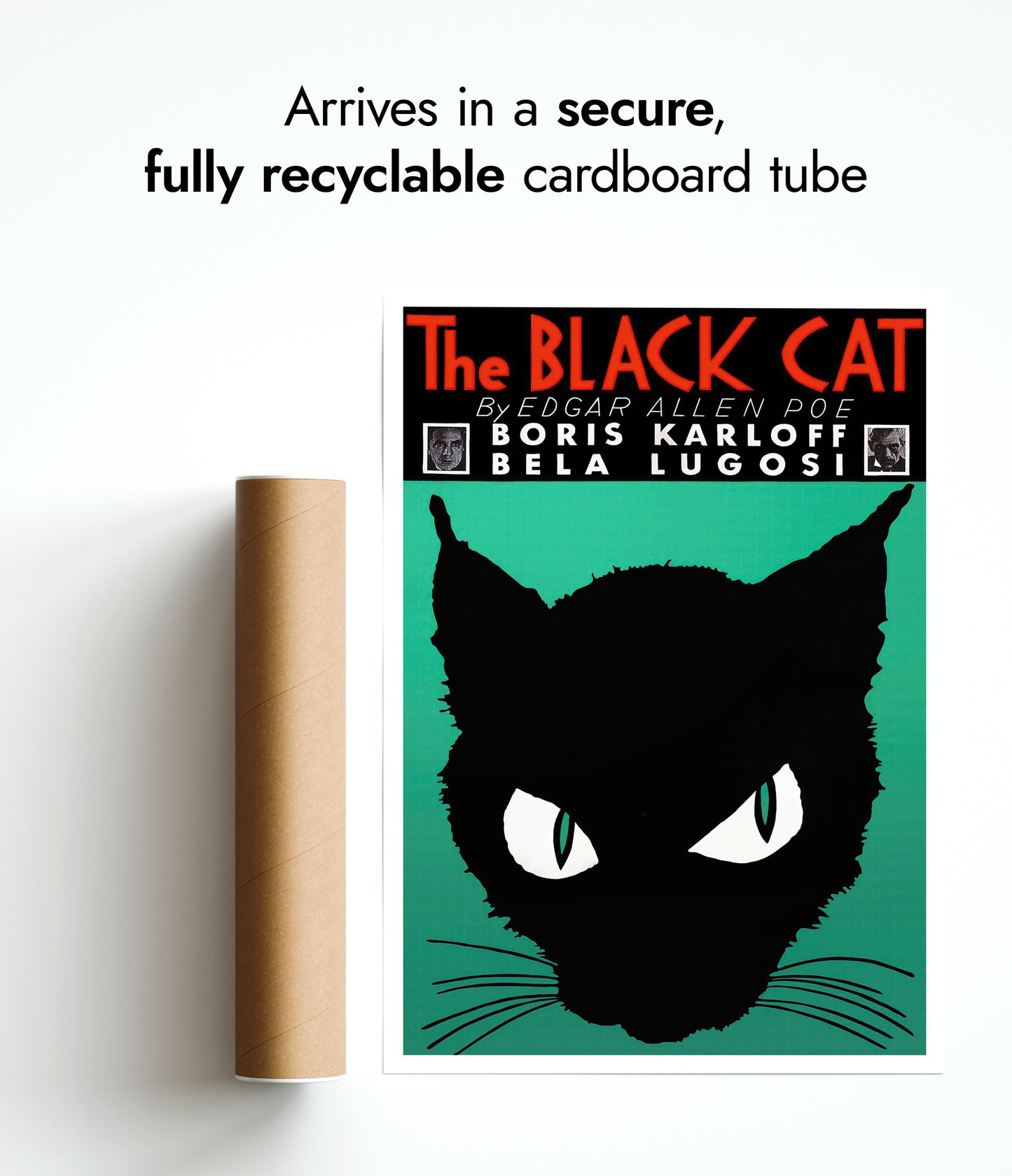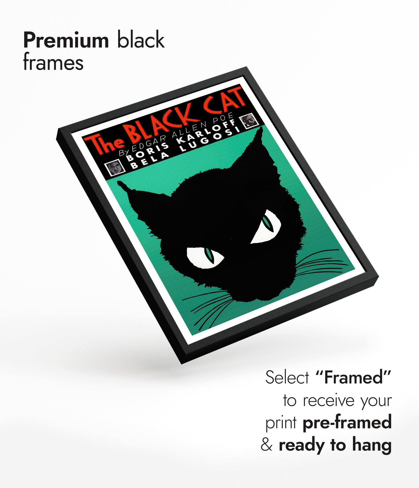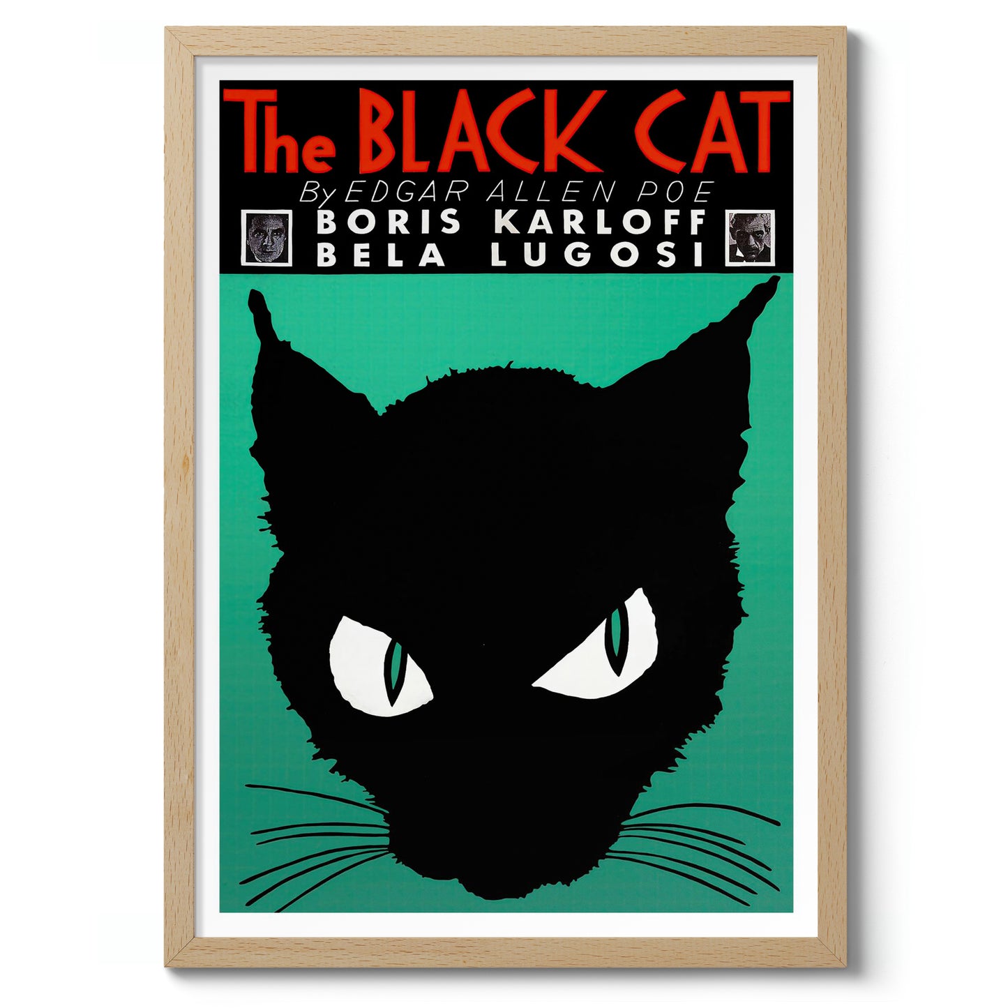 This vintage poster of "The Black Cat" features a striking silhouette of a black cat with piercing eyes set against a green background. Inspired by Edgar Allen Poe's work, it includes prominent typography displaying the title and names of iconic actors Boris Karloff and Bela Lugosi. Ideal for lovers of classic literature and vintage illustrations, this poster adds dramatic flair to any space.