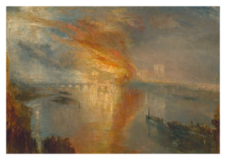 Capture the dramatic essence of "The Burning of the Houses of Lords and Commons" poster by J.M.W. Turner. This Romanticism masterpiece from 1834 depicts the historic London blaze, with vibrant yellow, brown, and orange hues reflecting on the river, emphasizing the fire's intensity. The scene showcases the contrast between the fiery sky and the serene water, illustrating the city's dynamic landscape.