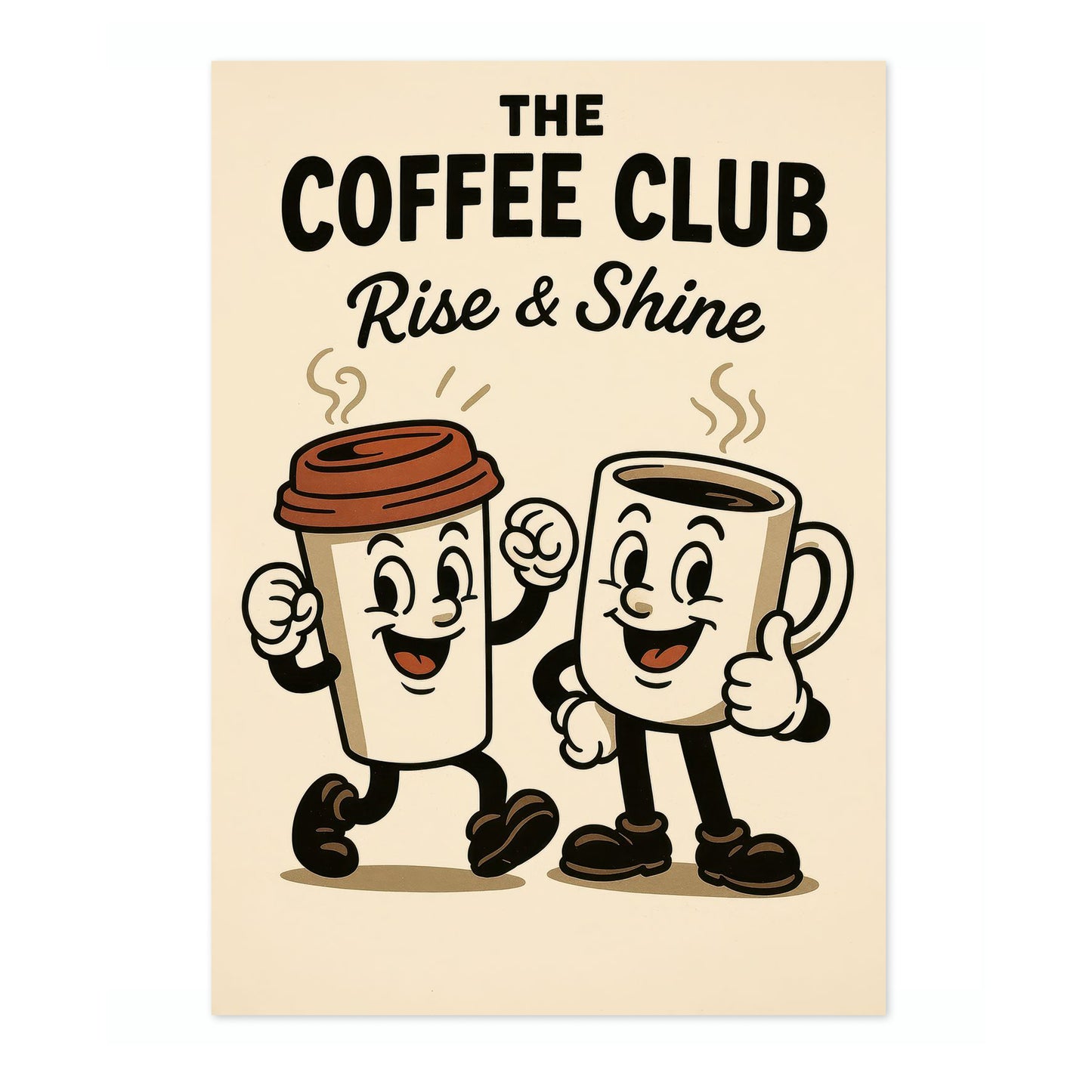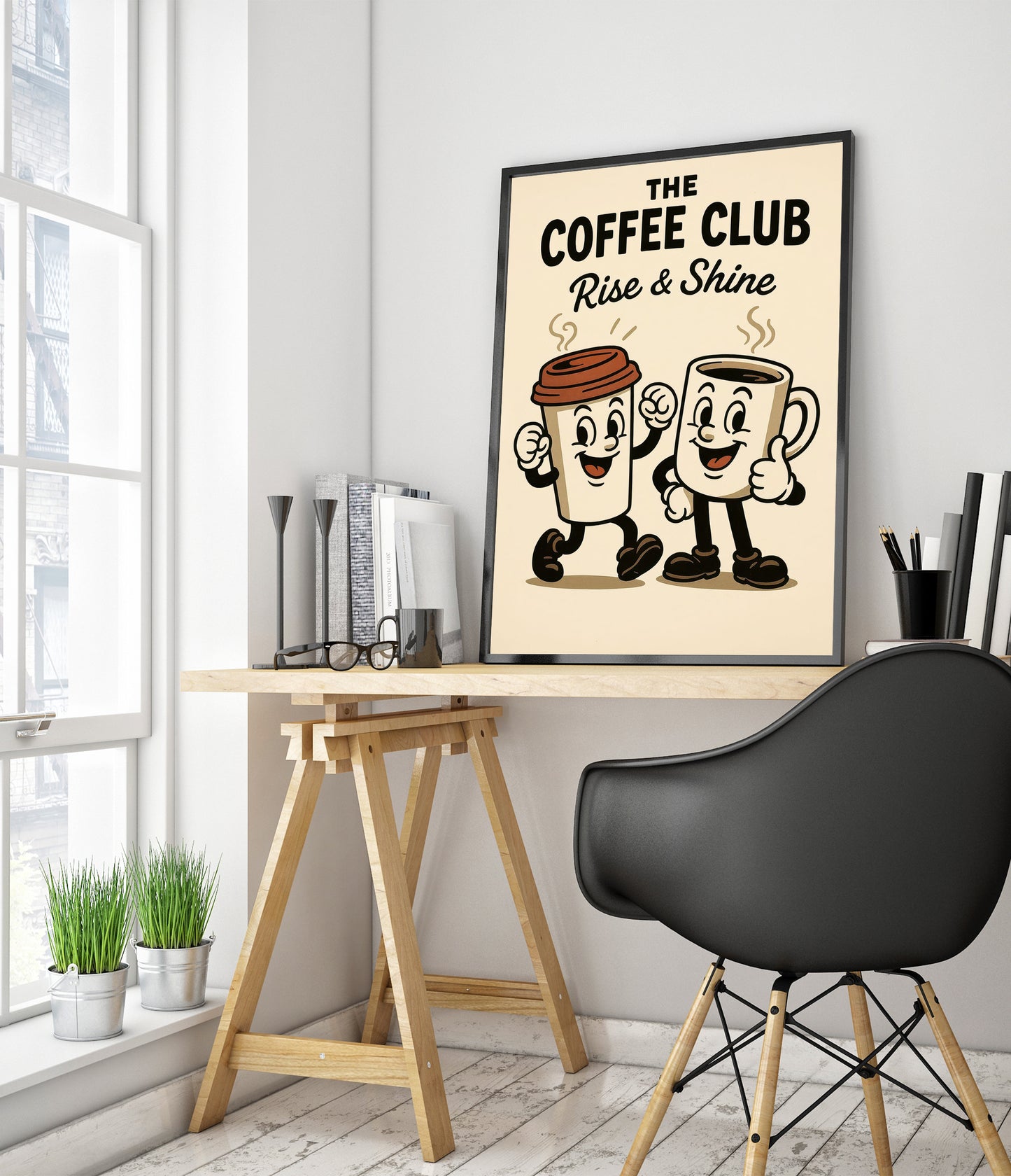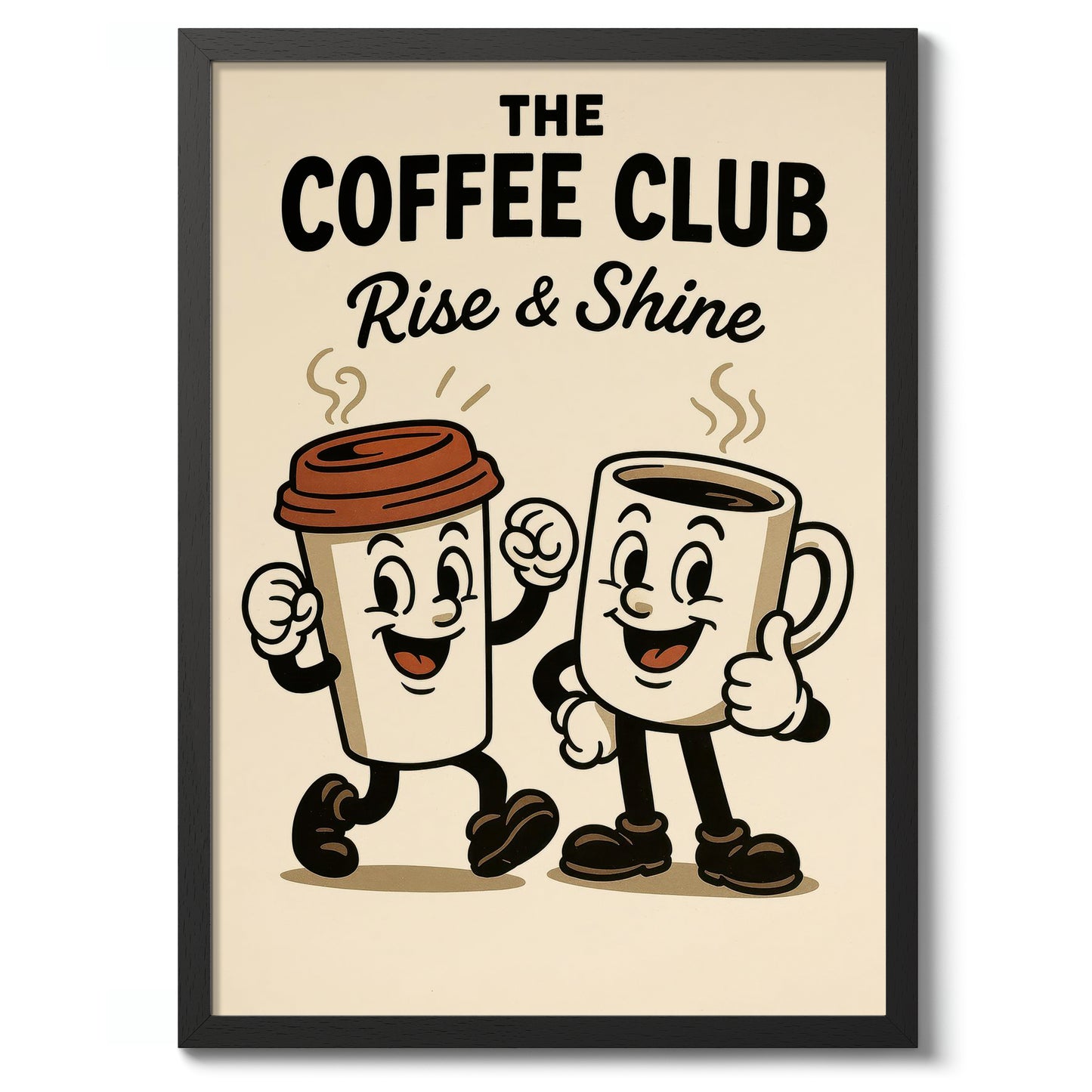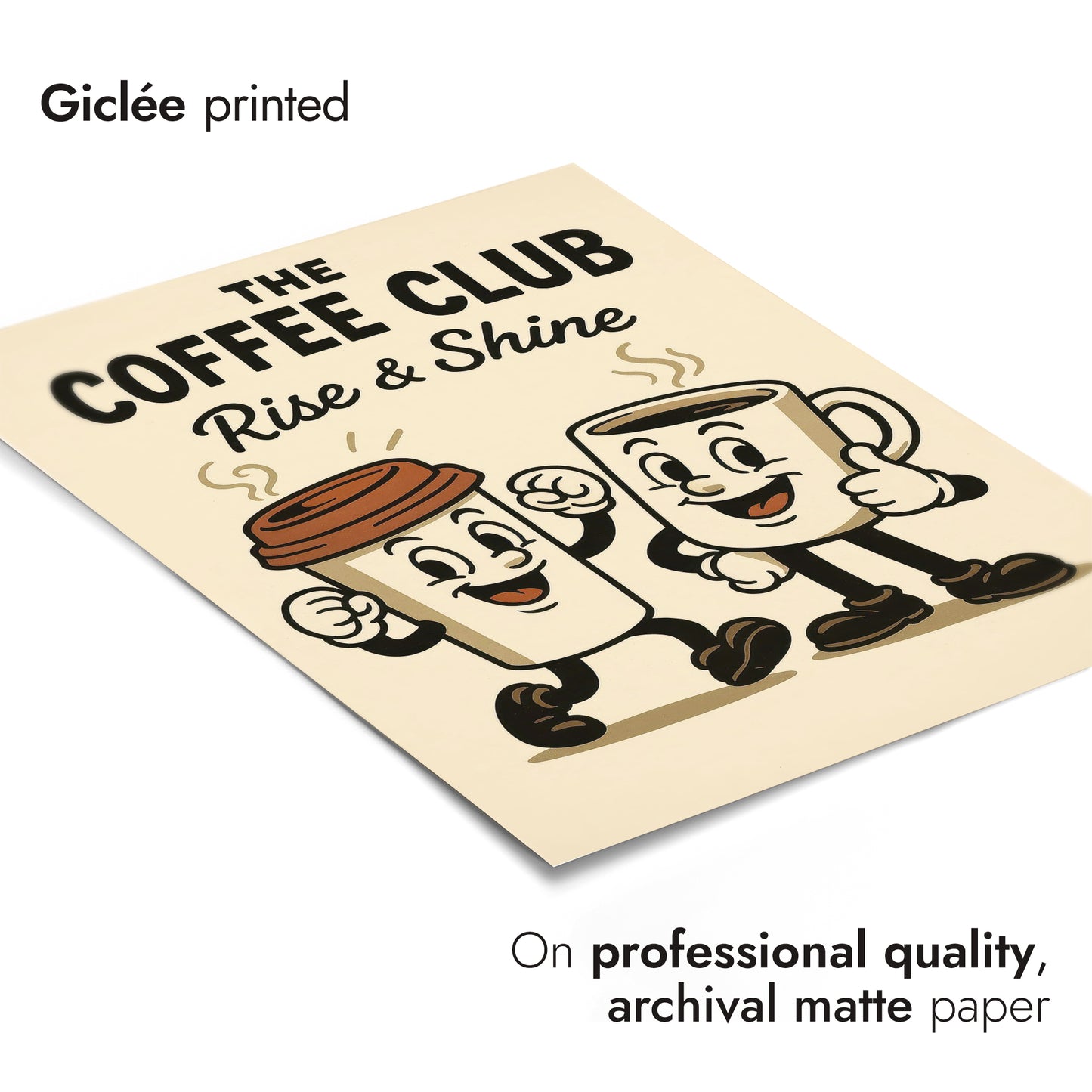 This vintage-style poster, "The Coffee Club," features cheerful cartoon coffee mascots against a beige backdrop. With bold typography declaring "Rise & Shine," it embodies a spirited morning vibe. Ideal for coffee enthusiasts, this artwork is perfect for kitchen décor, evoking a nostalgic café atmosphere. A playful illustration that captures the joy of morning coffee rituals.