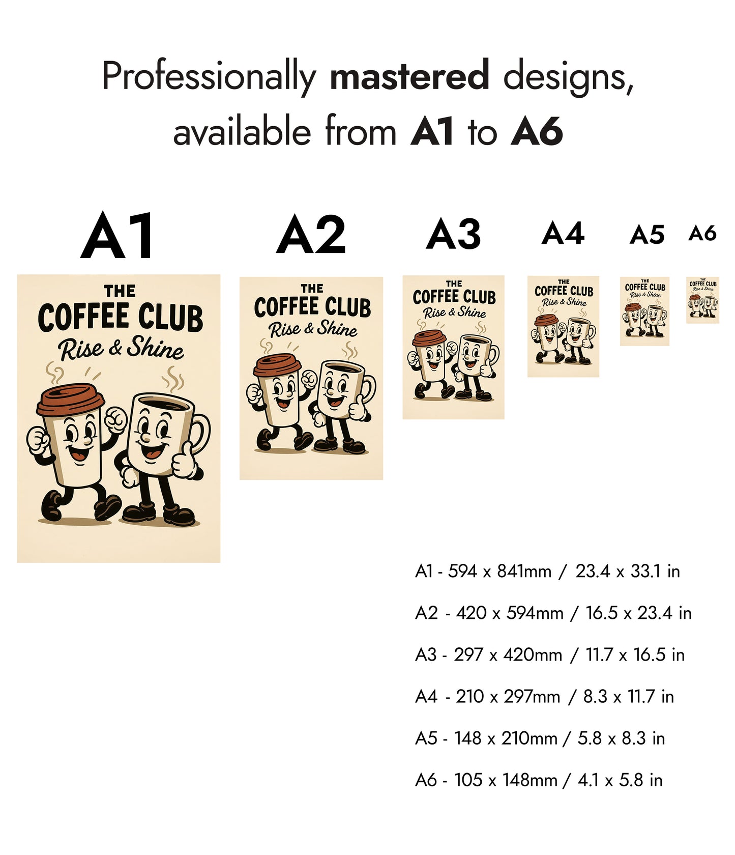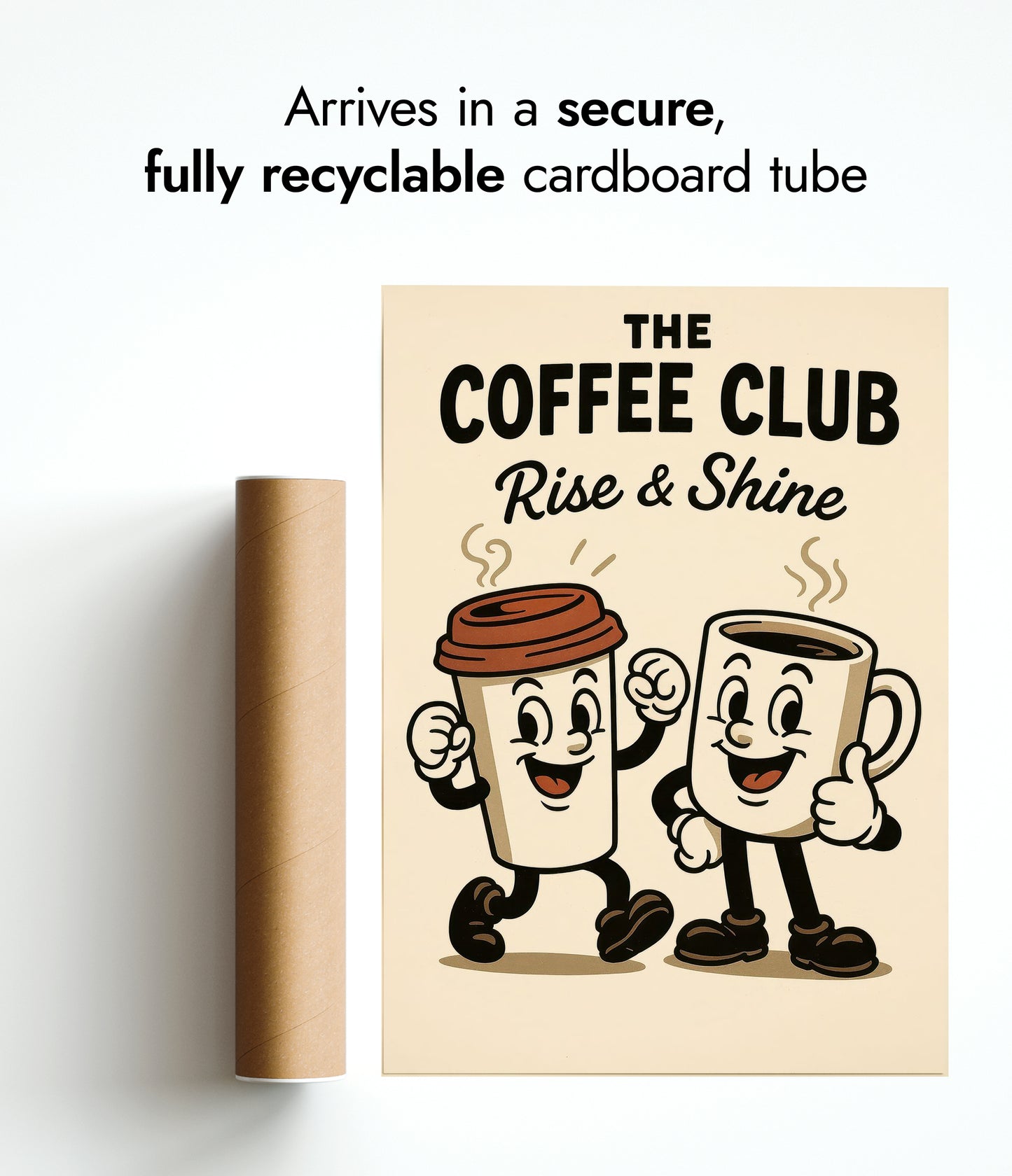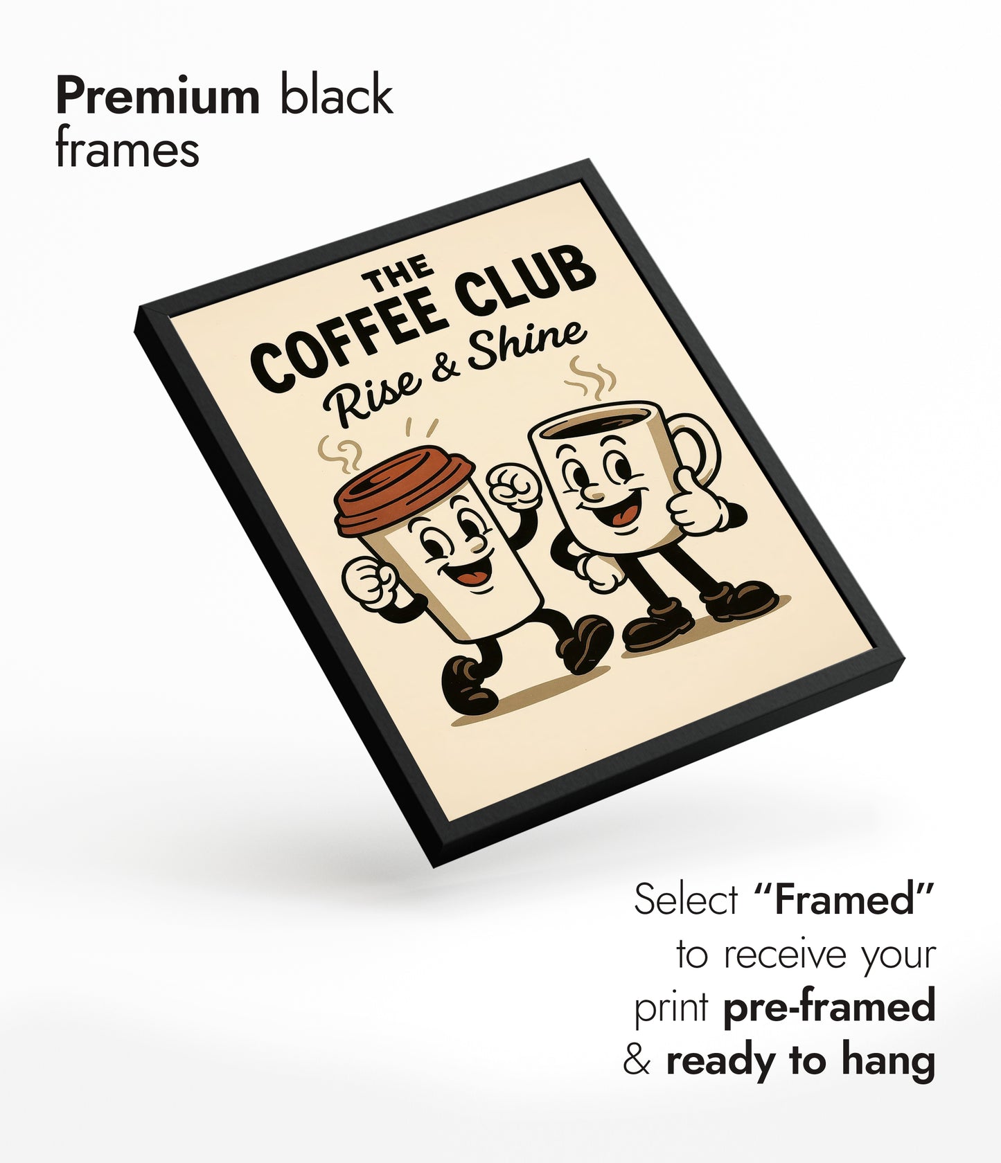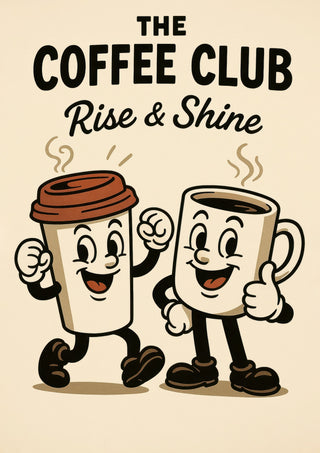 This vintage-style poster, "The Coffee Club," features cheerful cartoon coffee mascots against a beige backdrop. With bold typography declaring "Rise & Shine," it embodies a spirited morning vibe. Ideal for coffee enthusiasts, this artwork is perfect for kitchen décor, evoking a nostalgic café atmosphere. A playful illustration that captures the joy of morning coffee rituals.