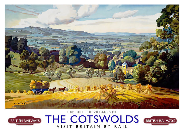 This vintage illustration poster captures the serene beauty of The Cotswolds' rolling hills and valleys. A harmonious blend of fields, forests, and distant mountains, it offers a picturesque view of the English countryside. Cows graze in the fields while haystacks dot the landscape, evoking a sense of pastoral tranquility. Perfect for fans of classic travel-themed art and British landscapes.