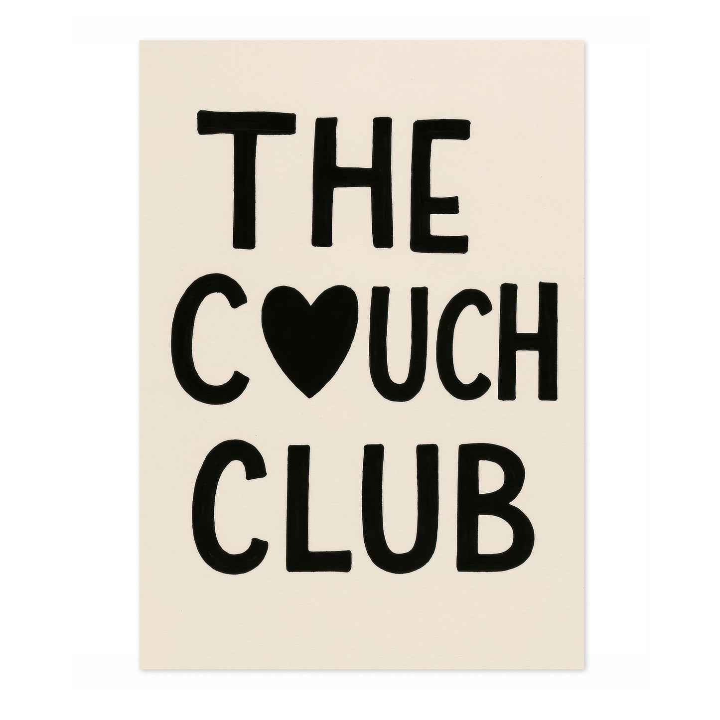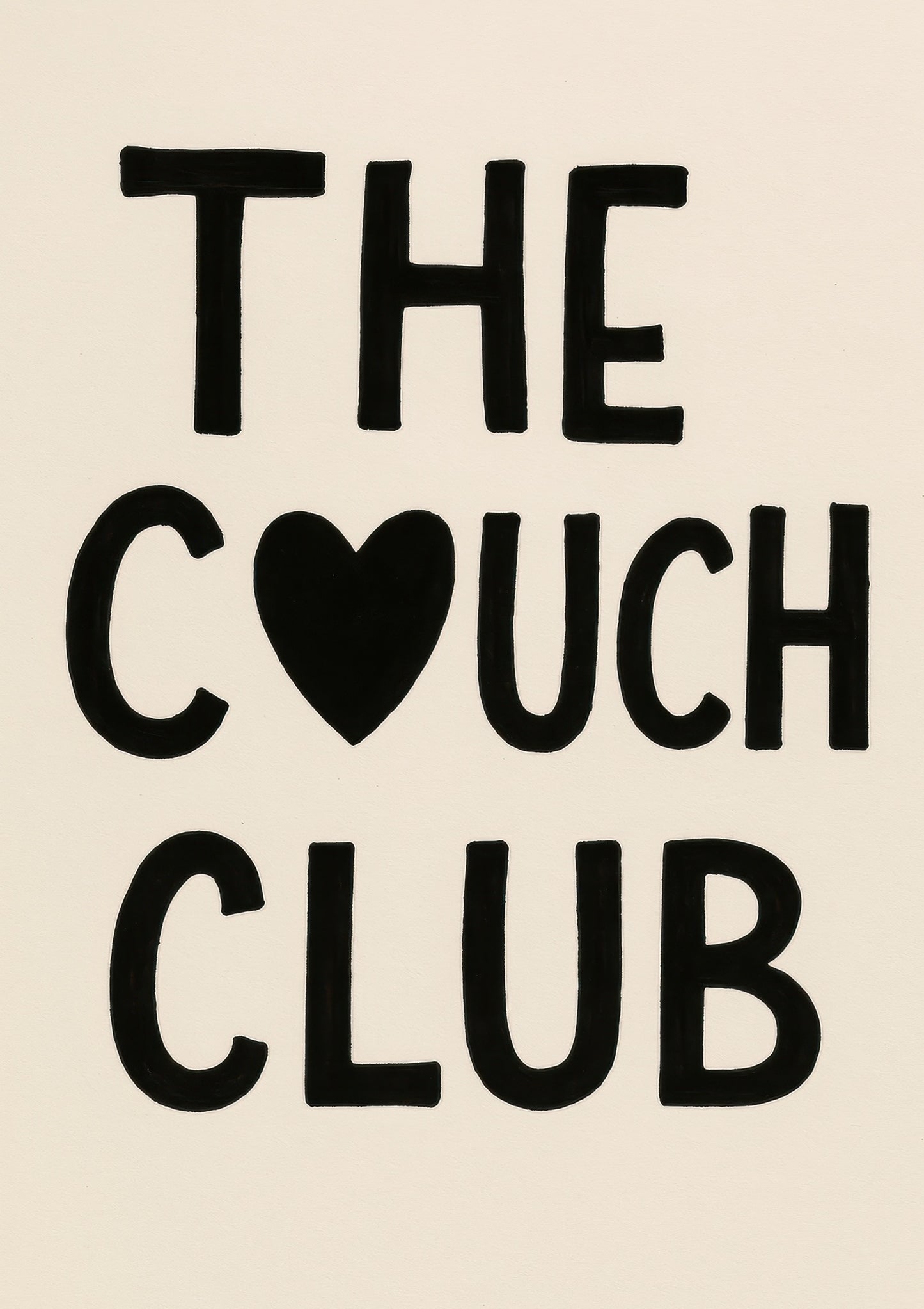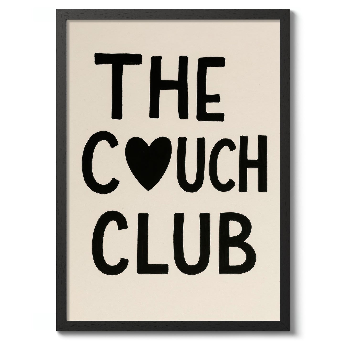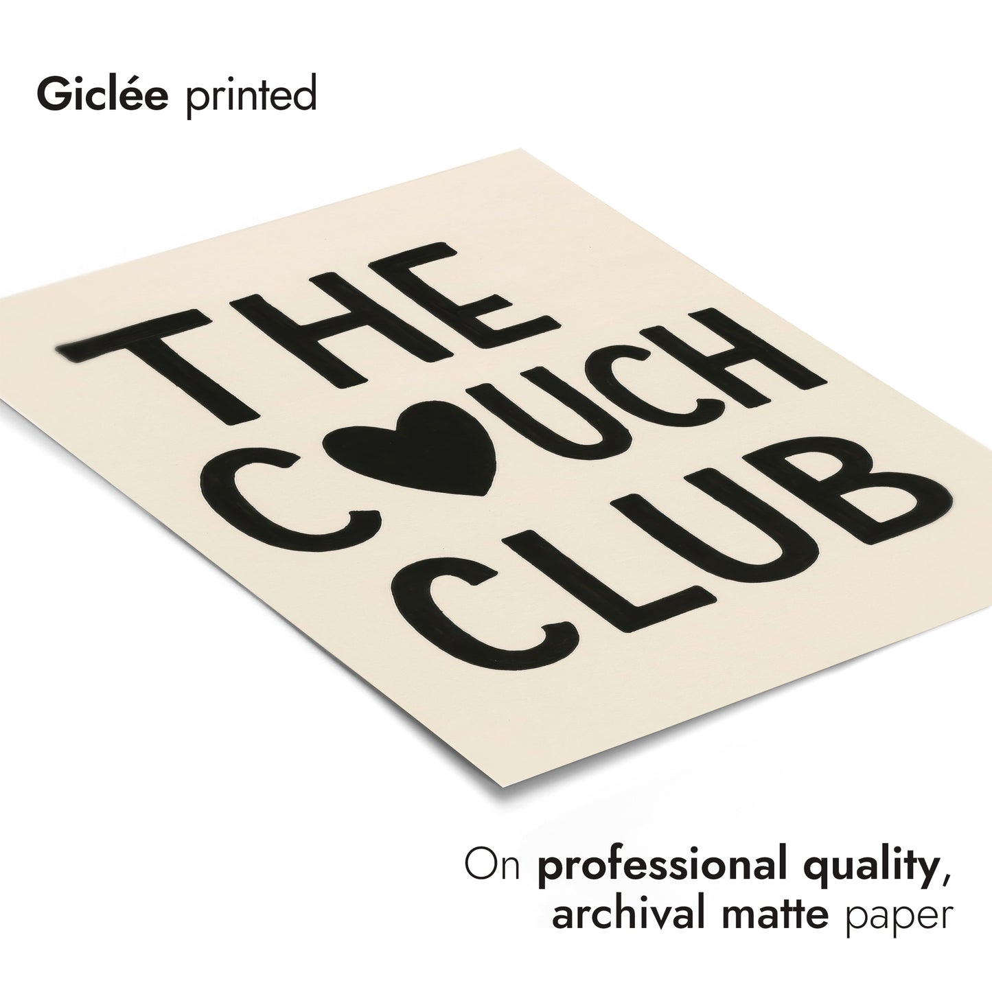This black and white typographic poster features bold, playful lettering that spells out "The Couch Club," with a heart symbol artistically replacing the letter "A." The simplistic design and graphic style capture a fun, cozy theme perfect for adding a touch of whimsy to any living space. Ideal for lovers of minimalist and typography-inspired decor.