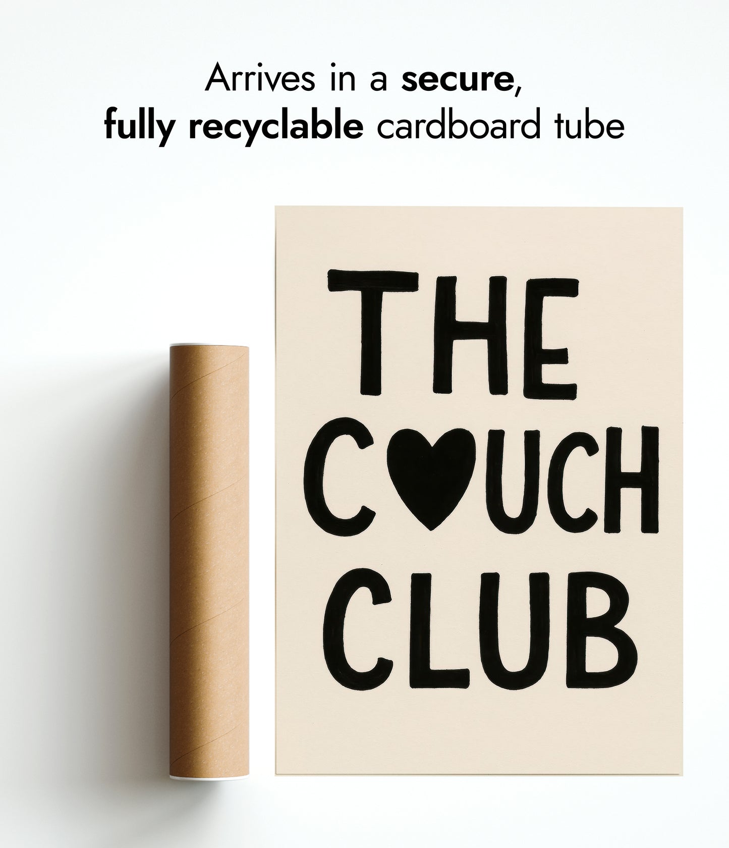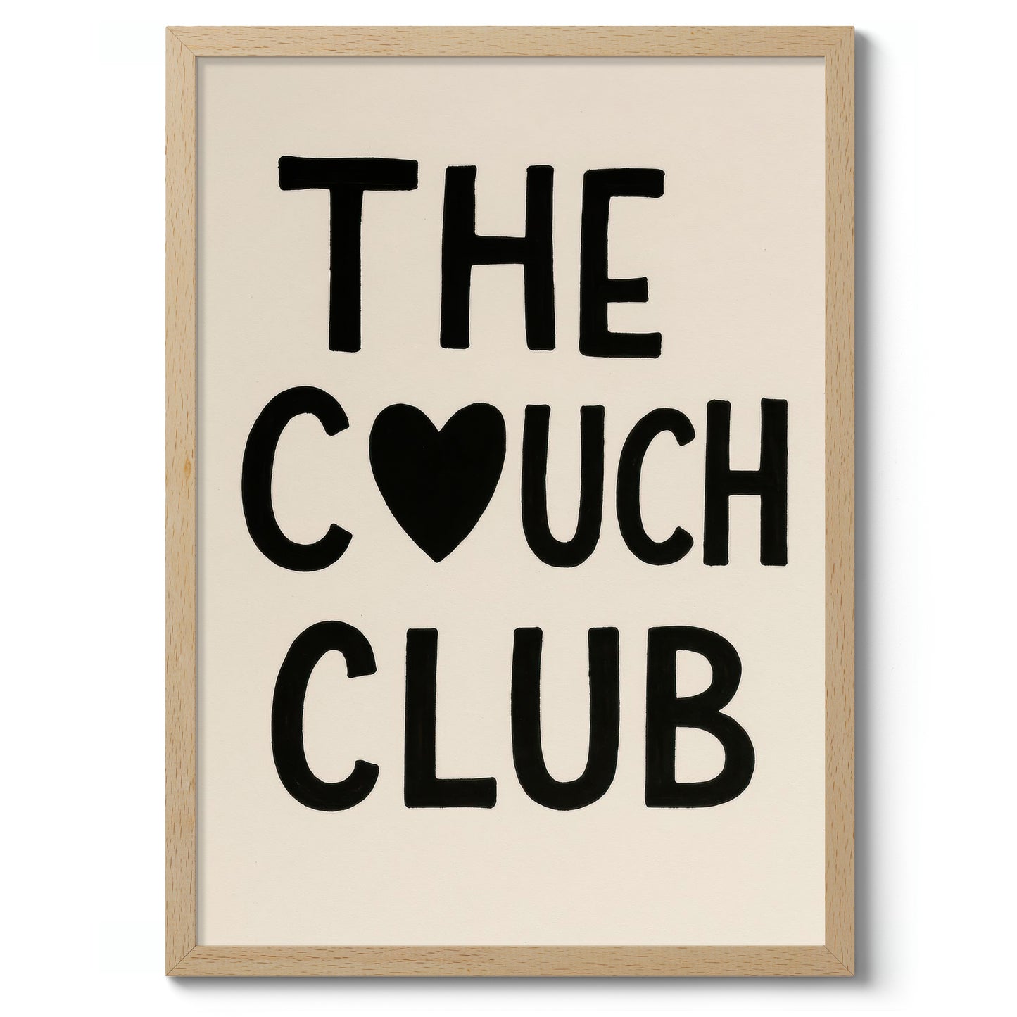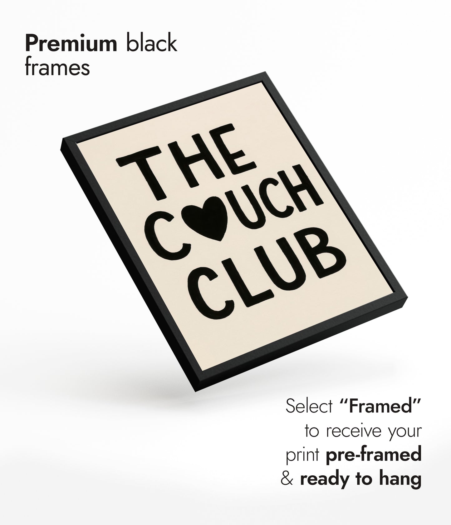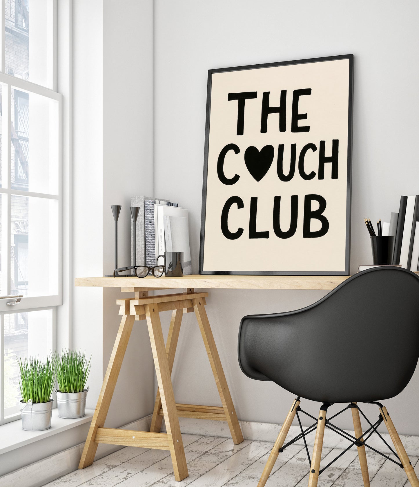This black and white typographic poster features bold, playful lettering that spells out "The Couch Club," with a heart symbol artistically replacing the letter "A." The simplistic design and graphic style capture a fun, cozy theme perfect for adding a touch of whimsy to any living space. Ideal for lovers of minimalist and typography-inspired decor.