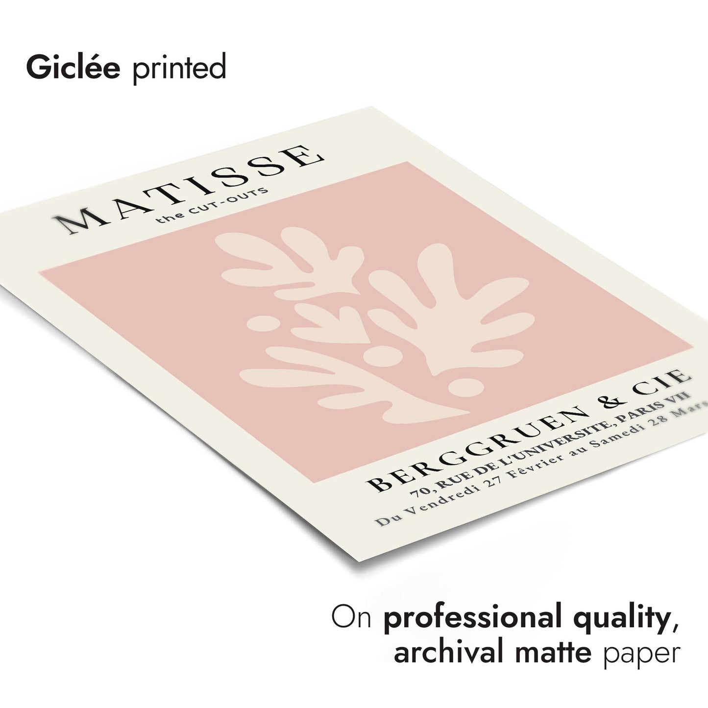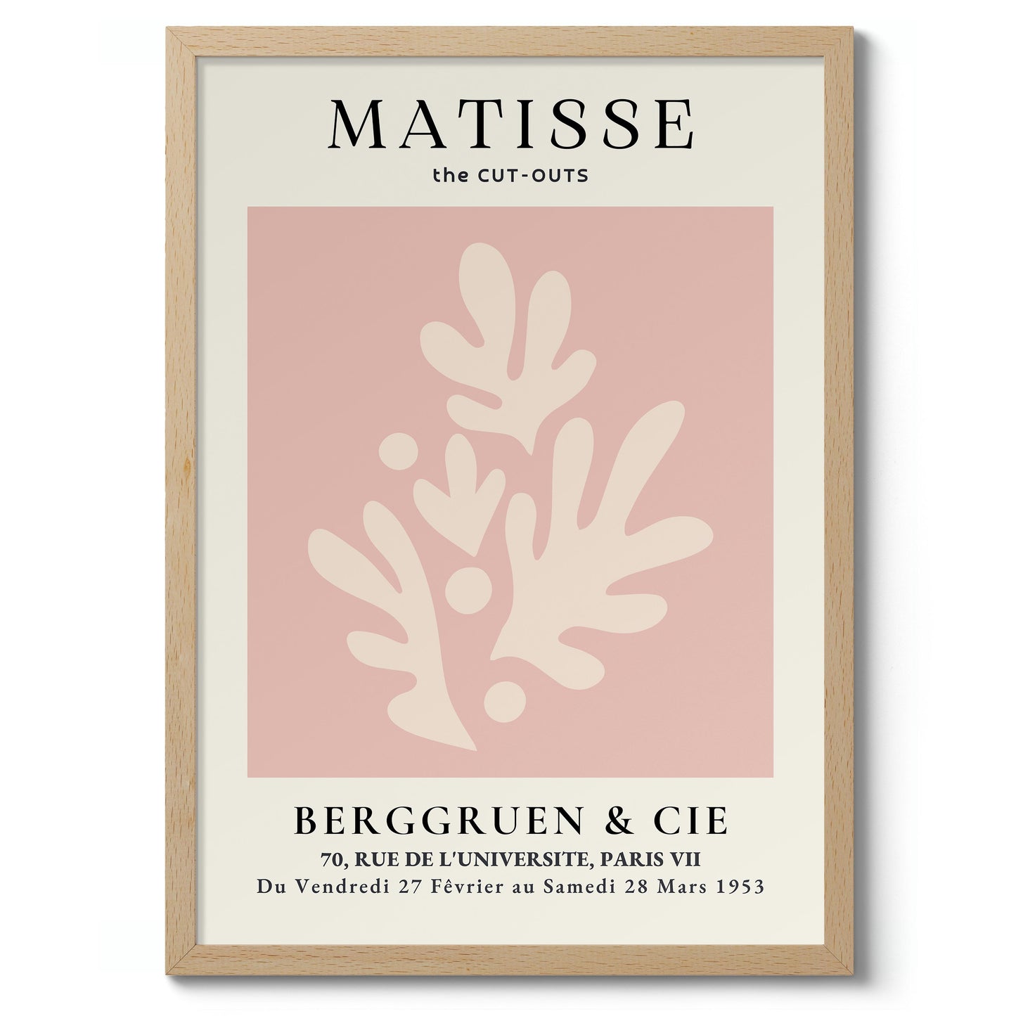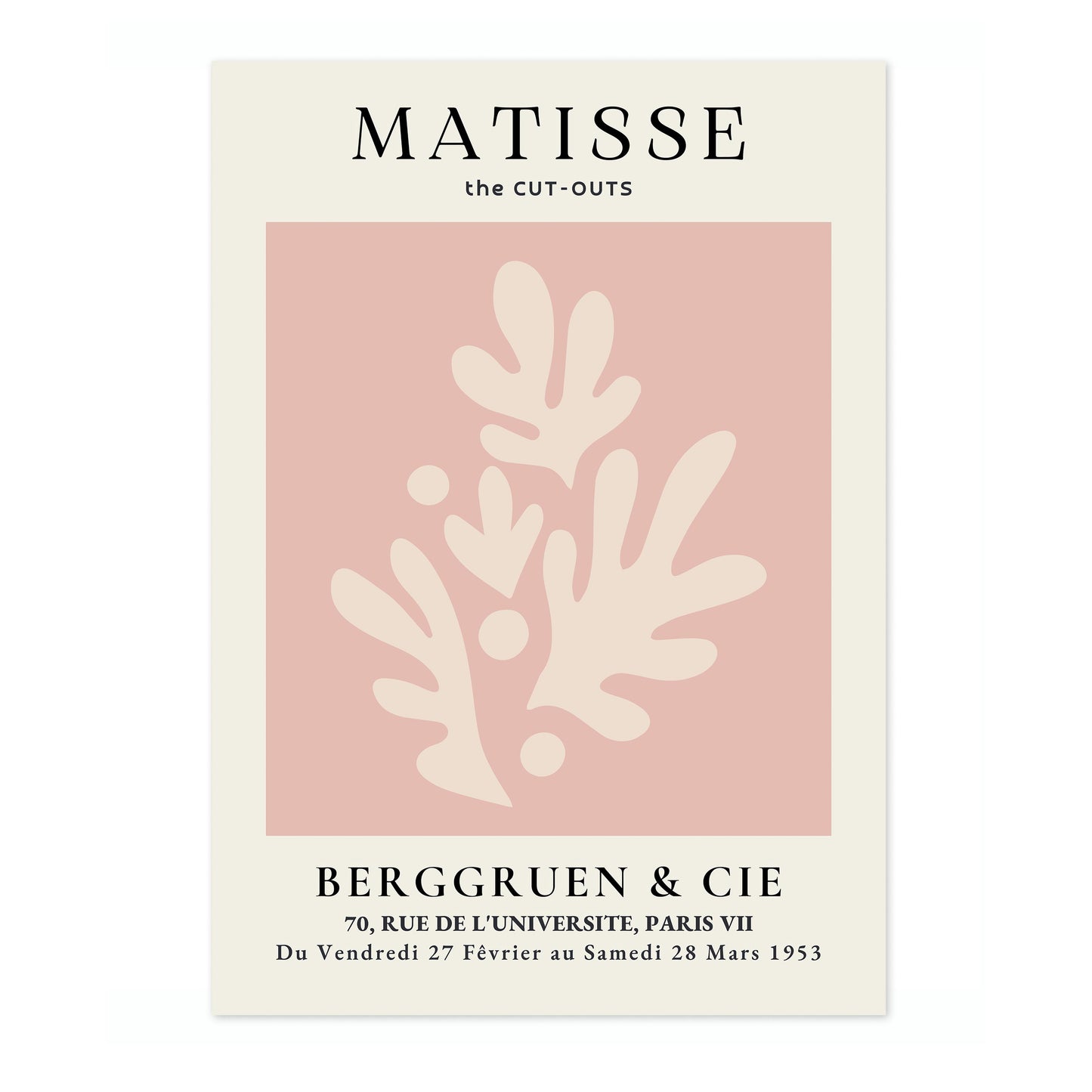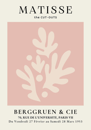 This poster, titled "The Cut-Outs, Papier Découpés," features Henri Matisse's iconic abstract leaf shapes. Set against a soft pink background, the minimalist, graphic style highlights Matisse's mastery of colour and form. The exhibition details at the bottom add a vintage touch, making it ideal for lovers of abstract and modern art. Perfect for adding a sophisticated aesthetic to any space.