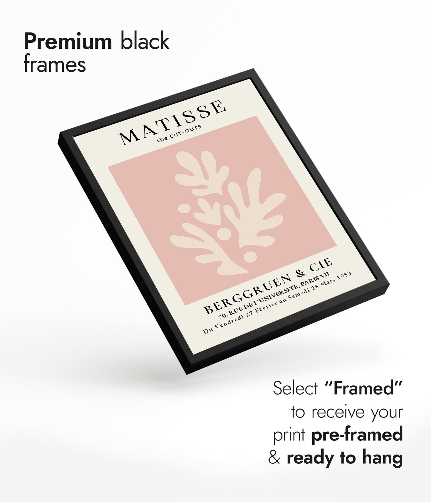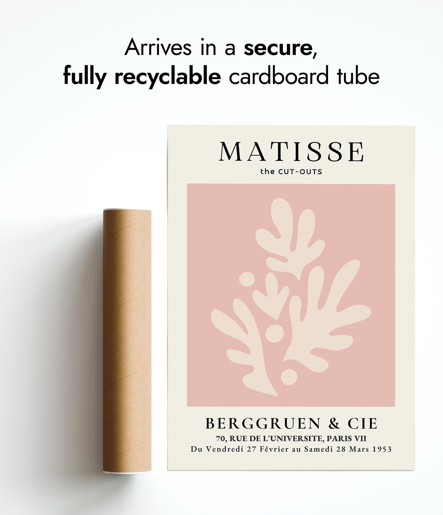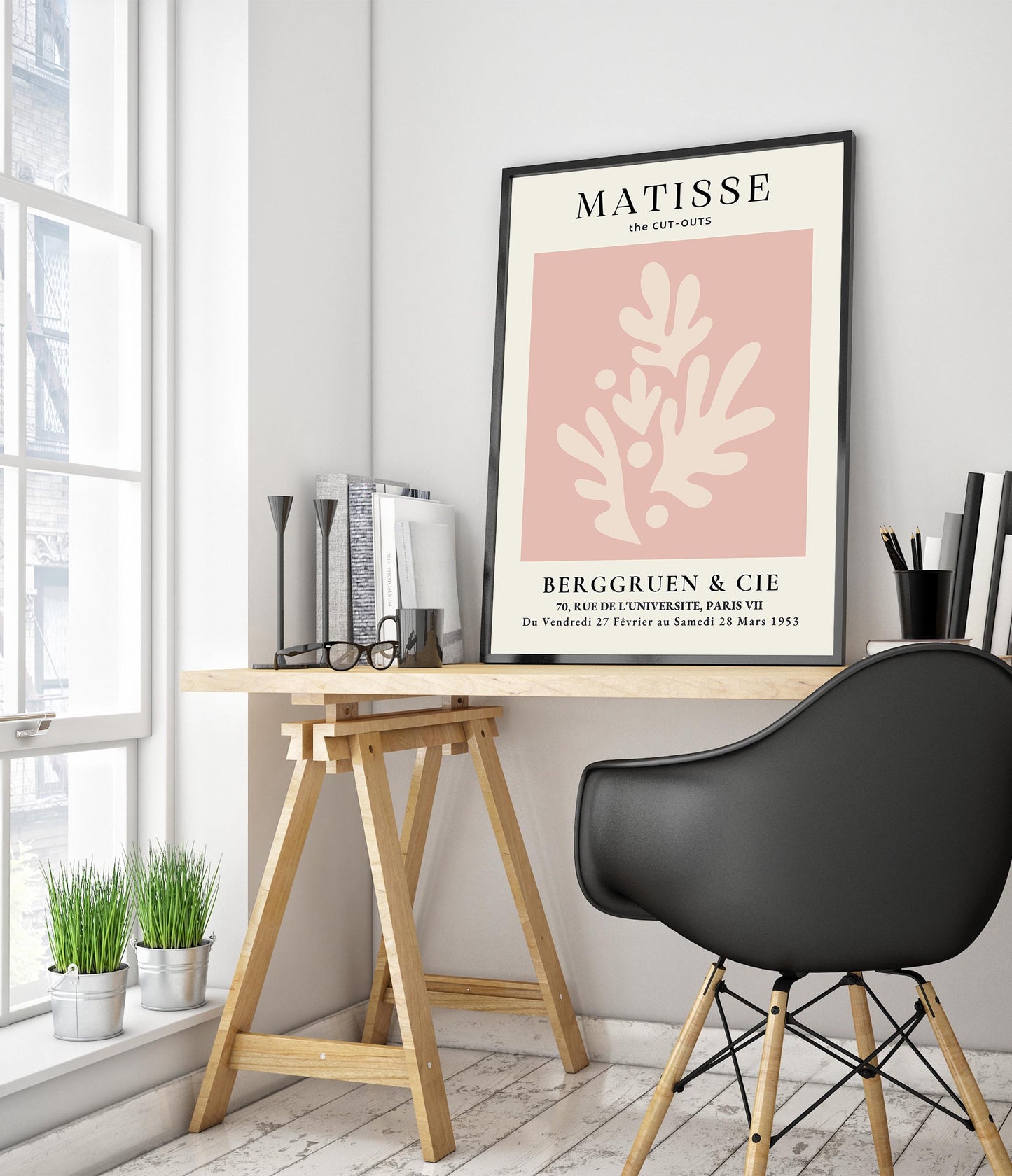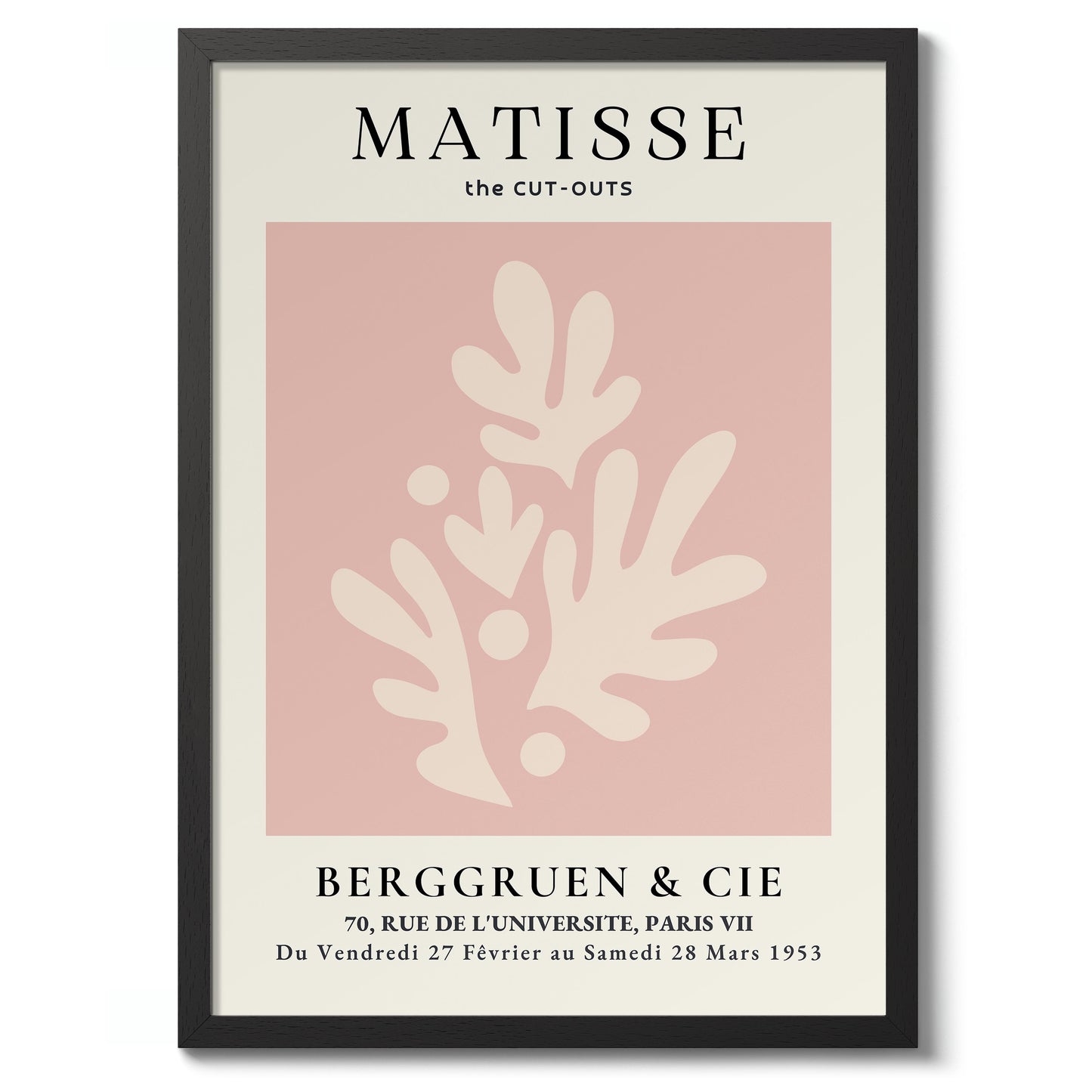 This poster, titled "The Cut-Outs, Papier Découpés," features Henri Matisse's iconic abstract leaf shapes. Set against a soft pink background, the minimalist, graphic style highlights Matisse's mastery of colour and form. The exhibition details at the bottom add a vintage touch, making it ideal for lovers of abstract and modern art. Perfect for adding a sophisticated aesthetic to any space.
