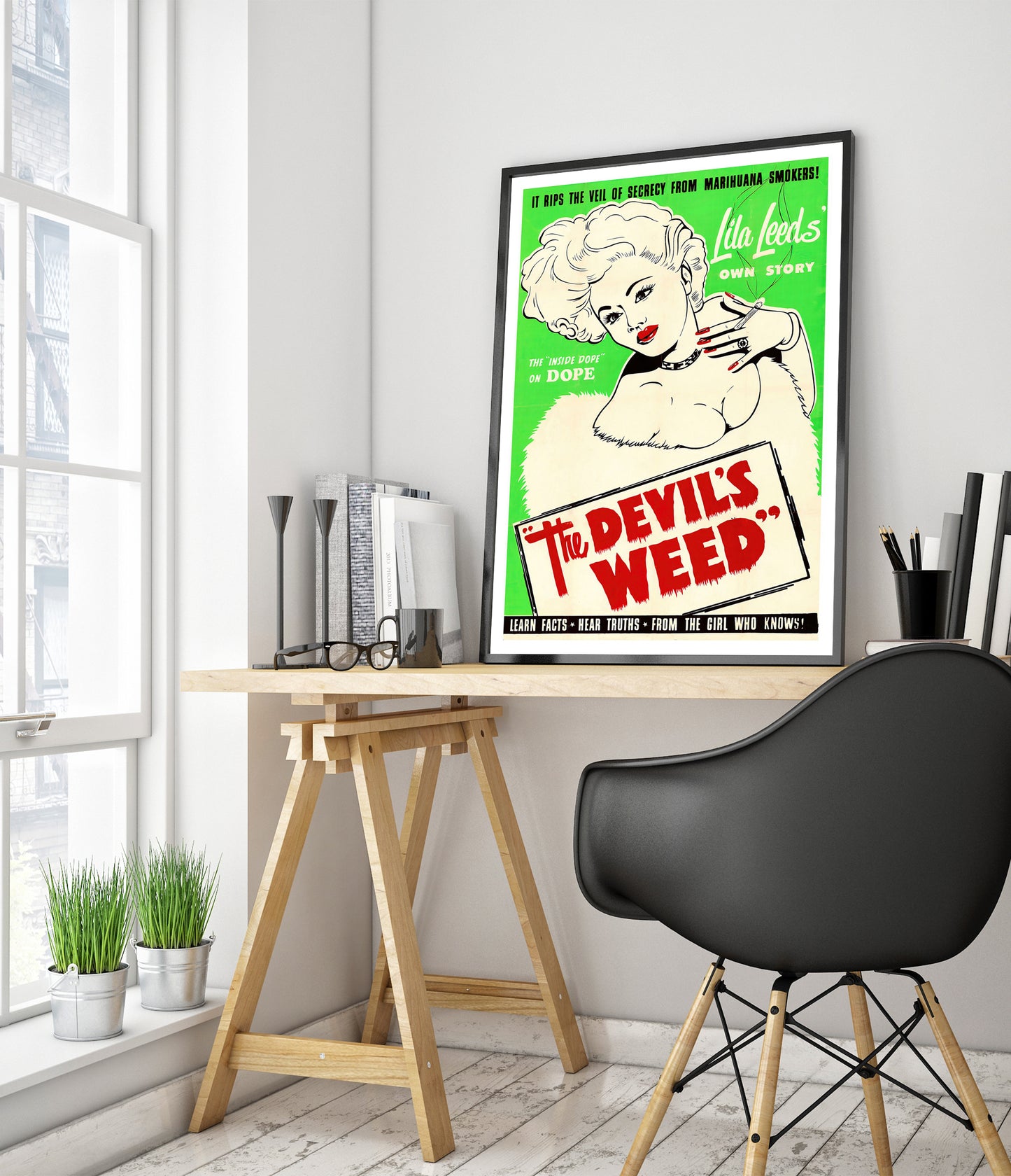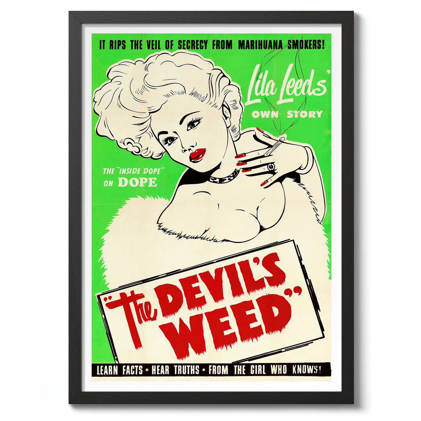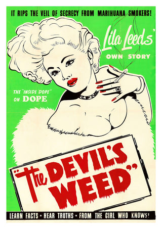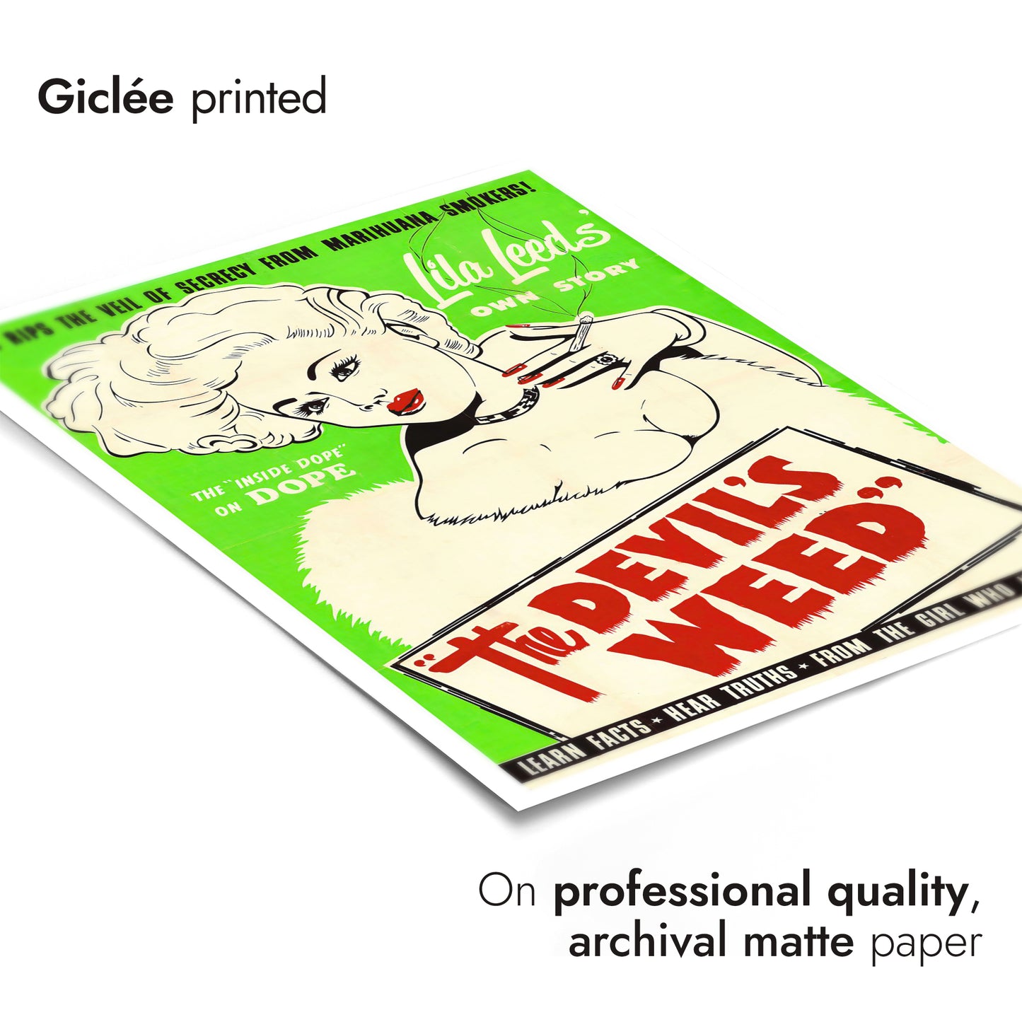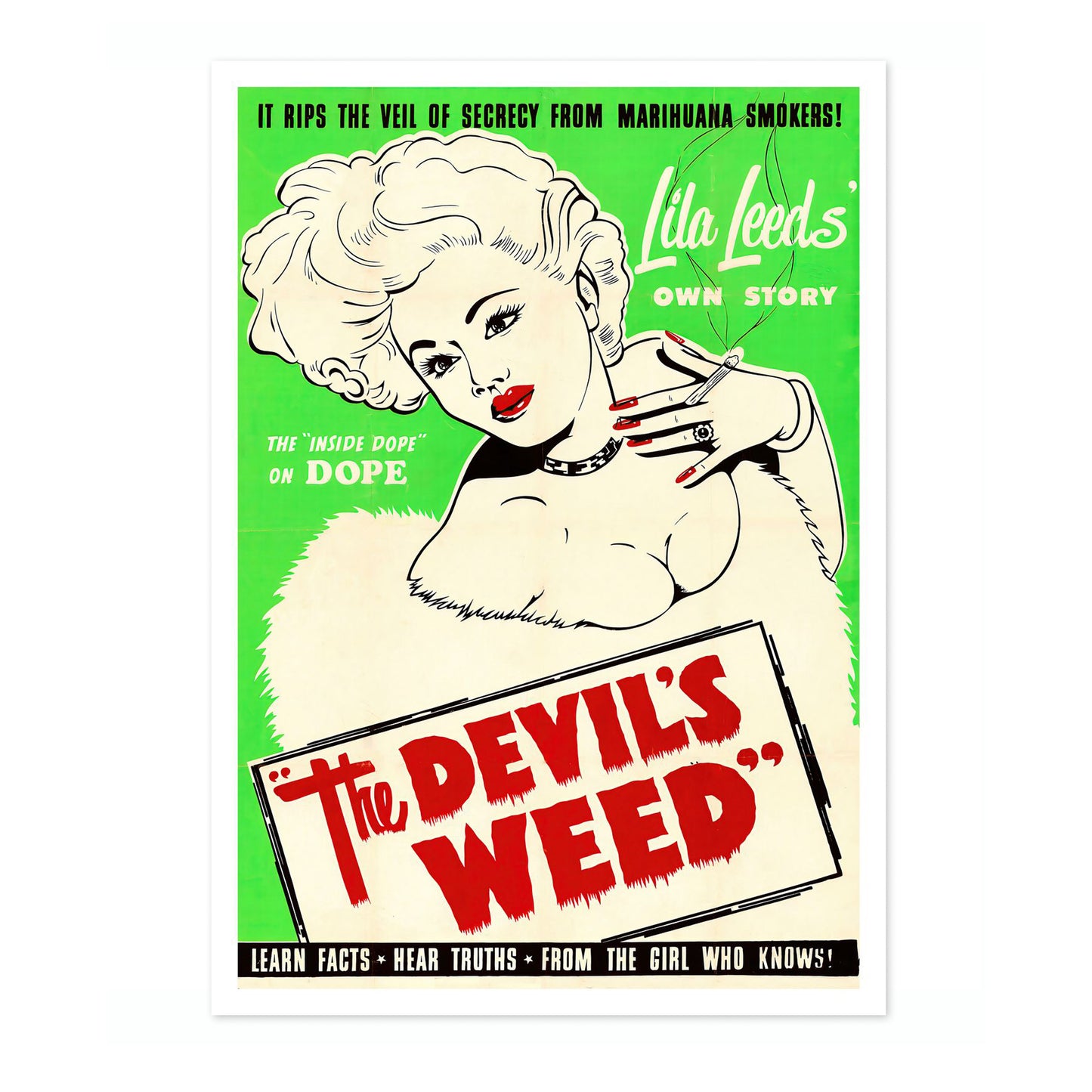 This vintage "The Devil's Weed" poster features a striking illustration of a glamorous woman with bold makeup and a fur stole. Set against a vibrant green background, the artwork uses provocative text and imagery to create an impactful propaganda piece focusing on the theme of marijuana. This eye-catching poster highlights mid-century graphic design styles. Perfect for fans of retro art.