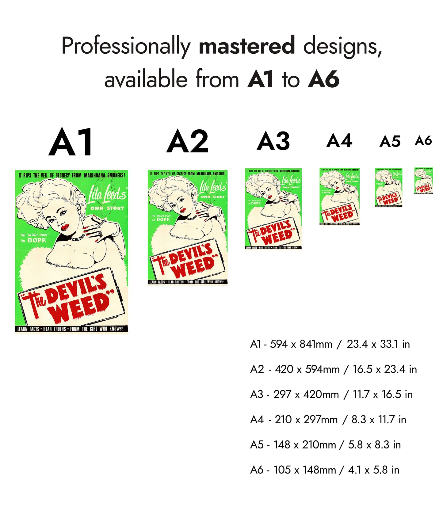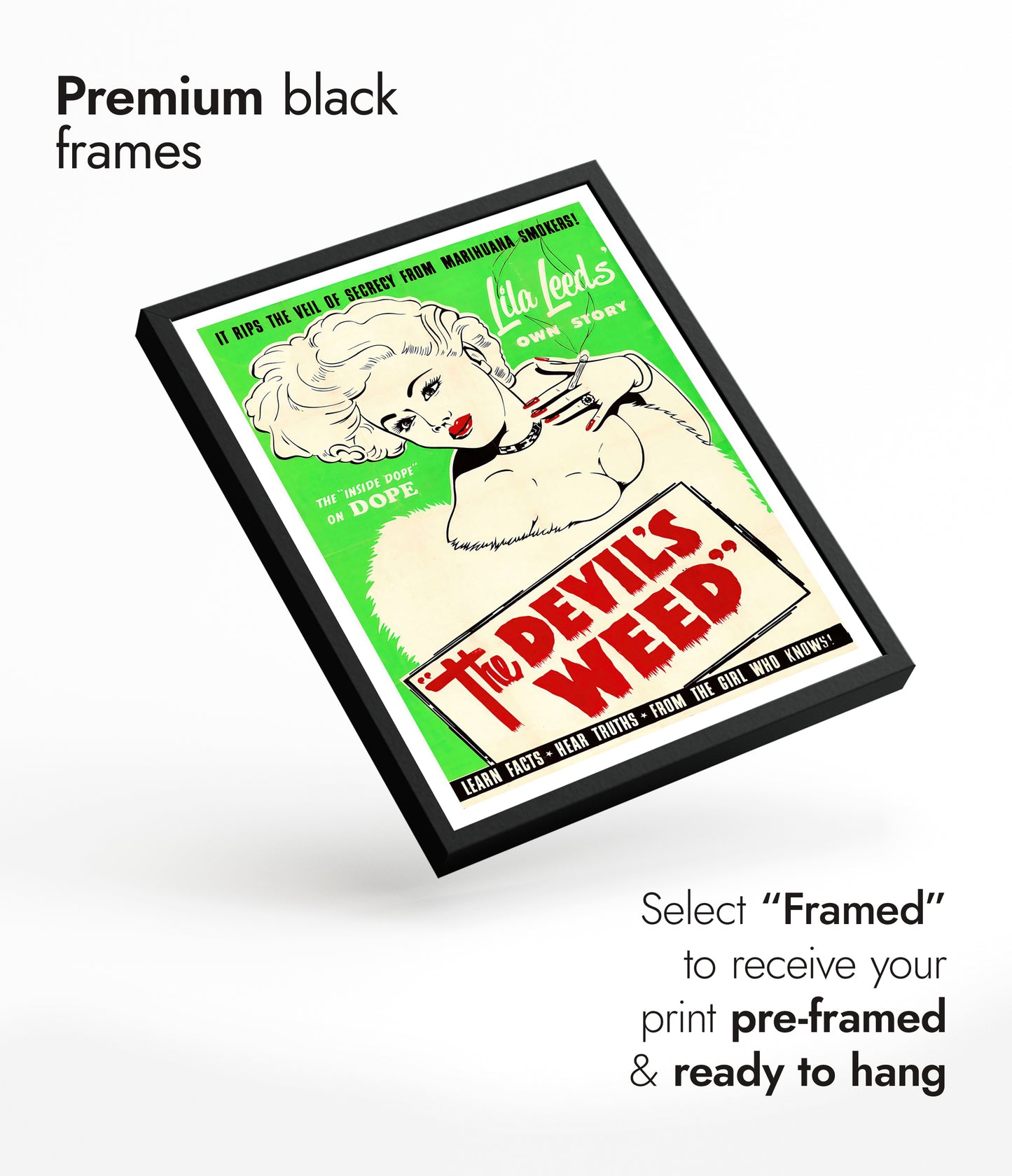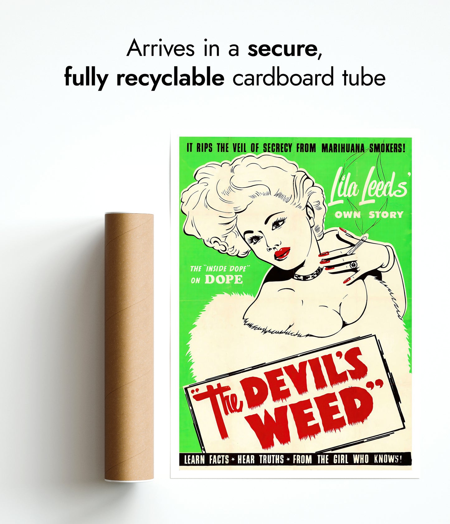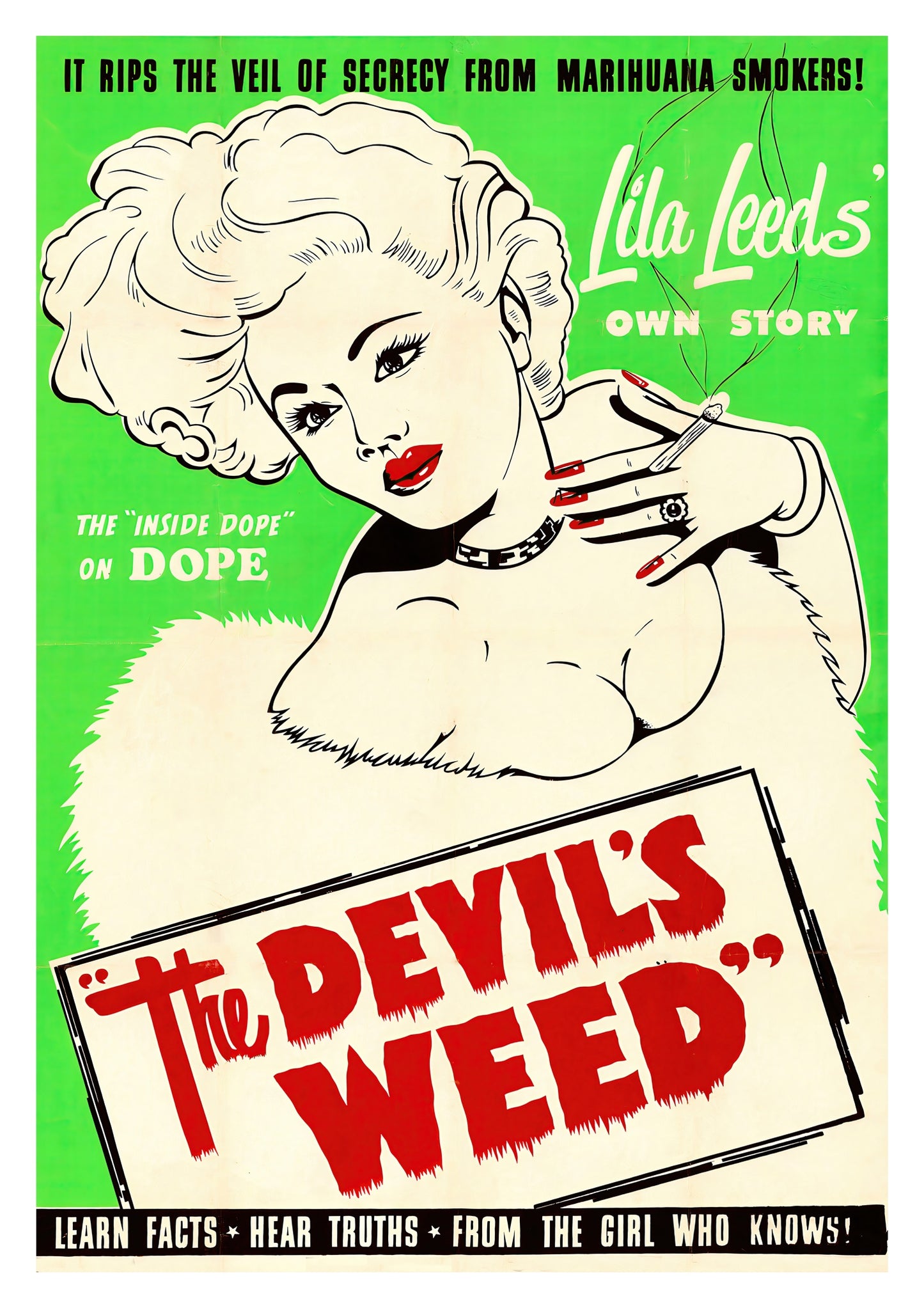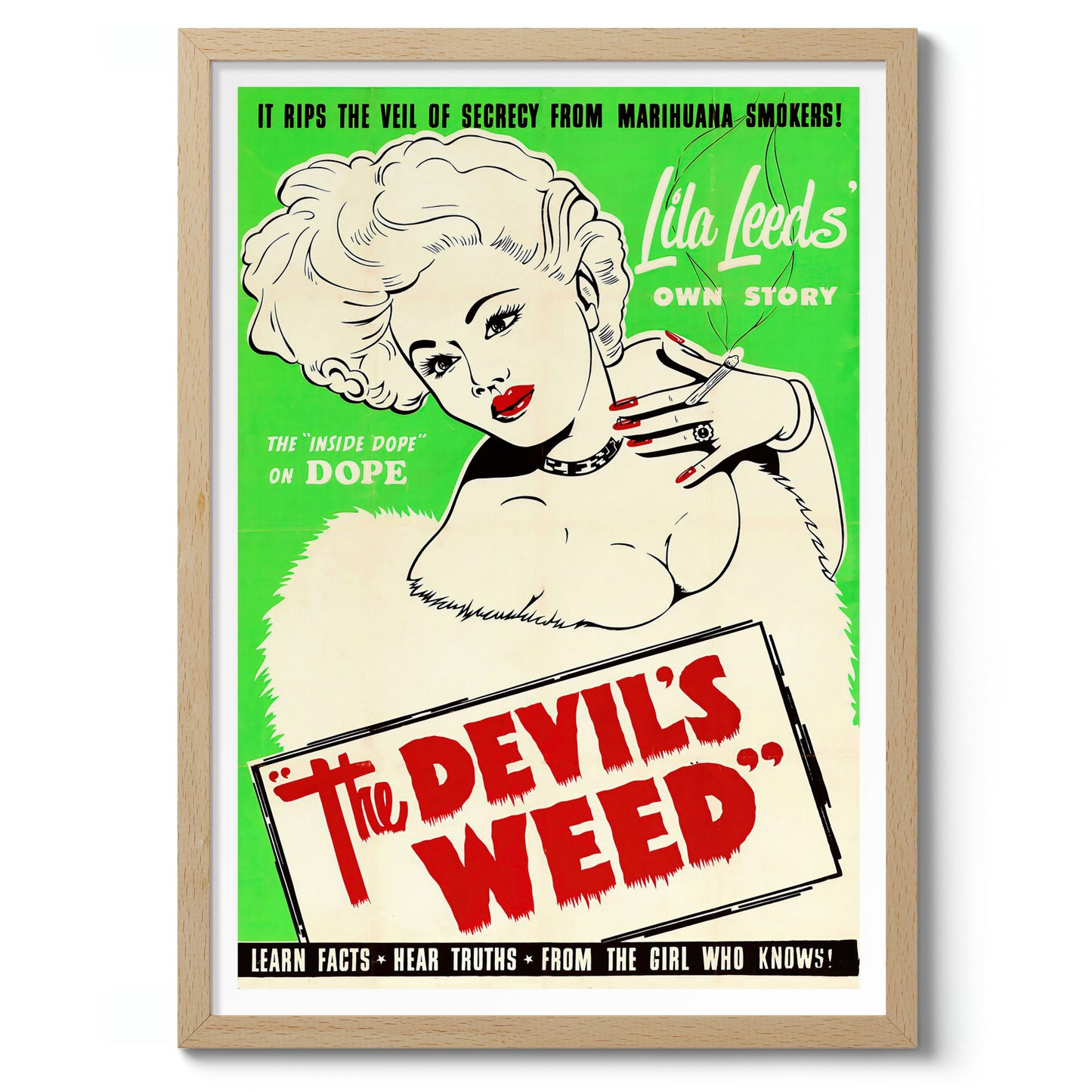 This vintage "The Devil's Weed" poster features a striking illustration of a glamorous woman with bold makeup and a fur stole. Set against a vibrant green background, the artwork uses provocative text and imagery to create an impactful propaganda piece focusing on the theme of marijuana. This eye-catching poster highlights mid-century graphic design styles. Perfect for fans of retro art.