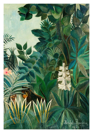 This art print poster features Henri Rousseau's "The Equatorial Jungle." The painting showcases a lush tropical forest with dense foliage in vibrant greens and a hint of animal life peeking through. Tall trees and exotic plants dominate the scene, capturing the essence of a pristine jungle environment. It’s a beautiful portrayal of nature's depth and diversity.