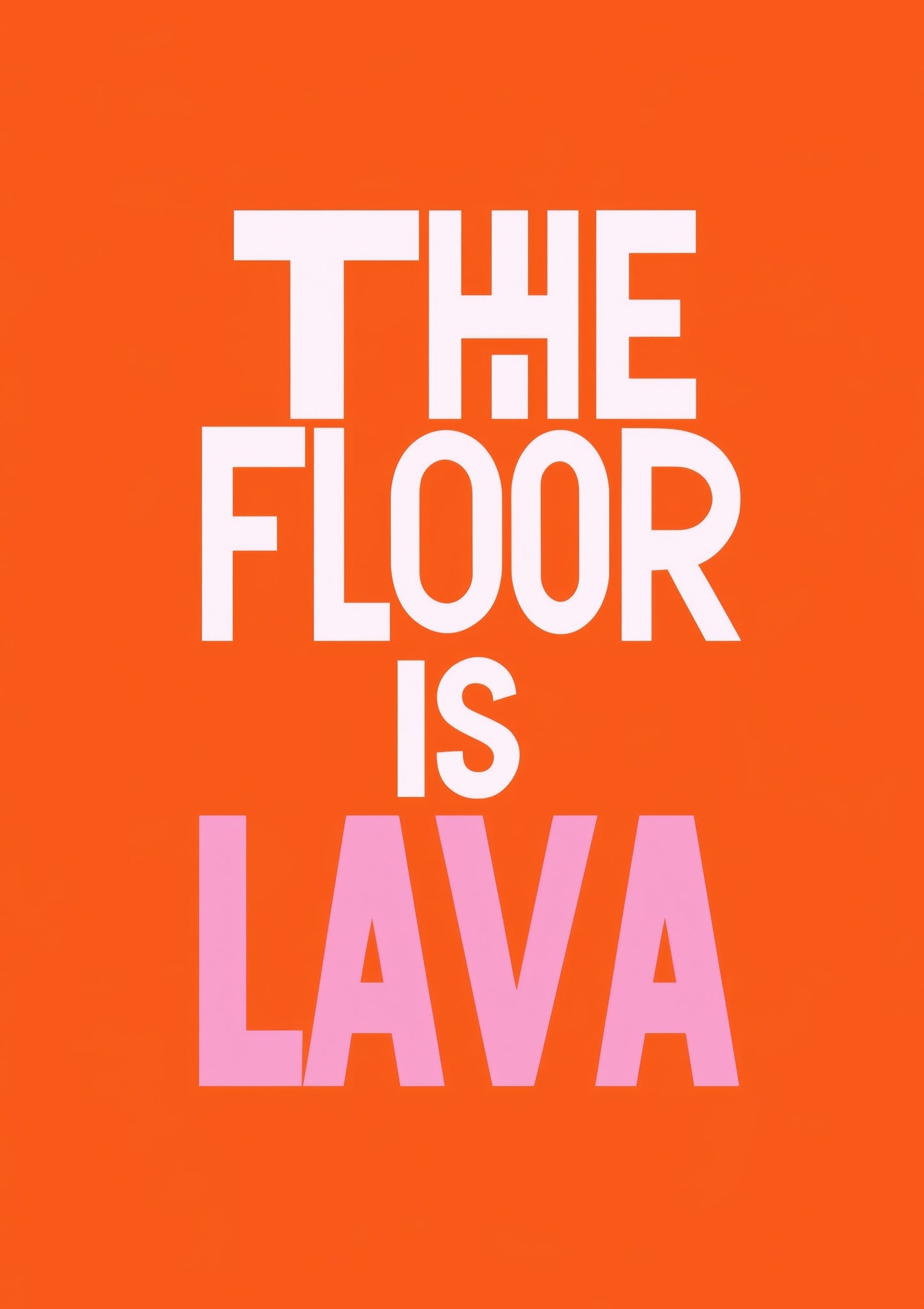 This vibrant poster titled "The Floor is Lava" features bold typography against a striking orange background. The playful and nostalgic phrase is prominently displayed, with "LAVA" highlighted in pink, creating a dynamic visual contrast. Ideal for adding a pop of color and whimsy to any space, this typographic art piece celebrates creativity and youthful imagination. Perfect for typography enthusiasts.
