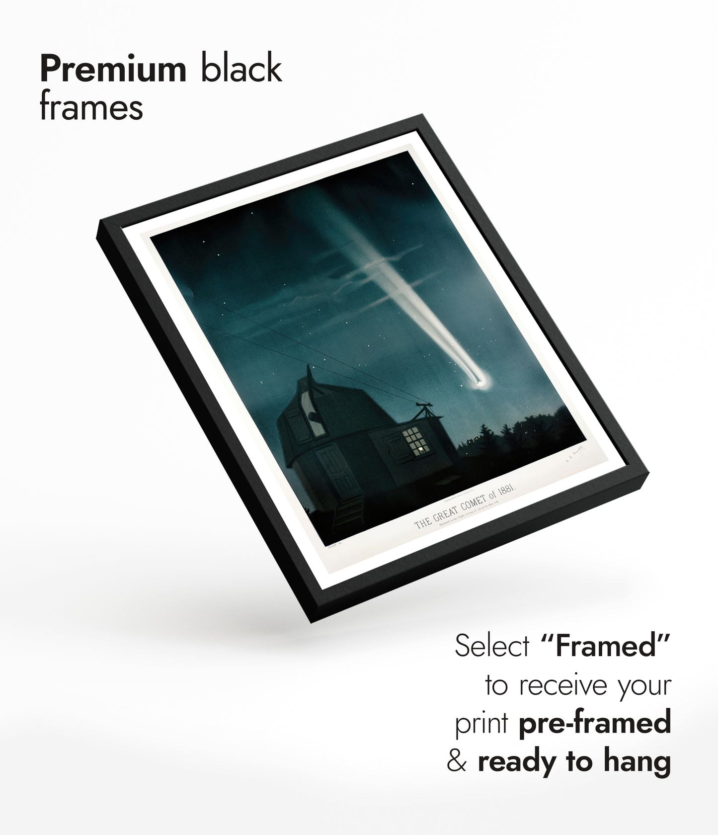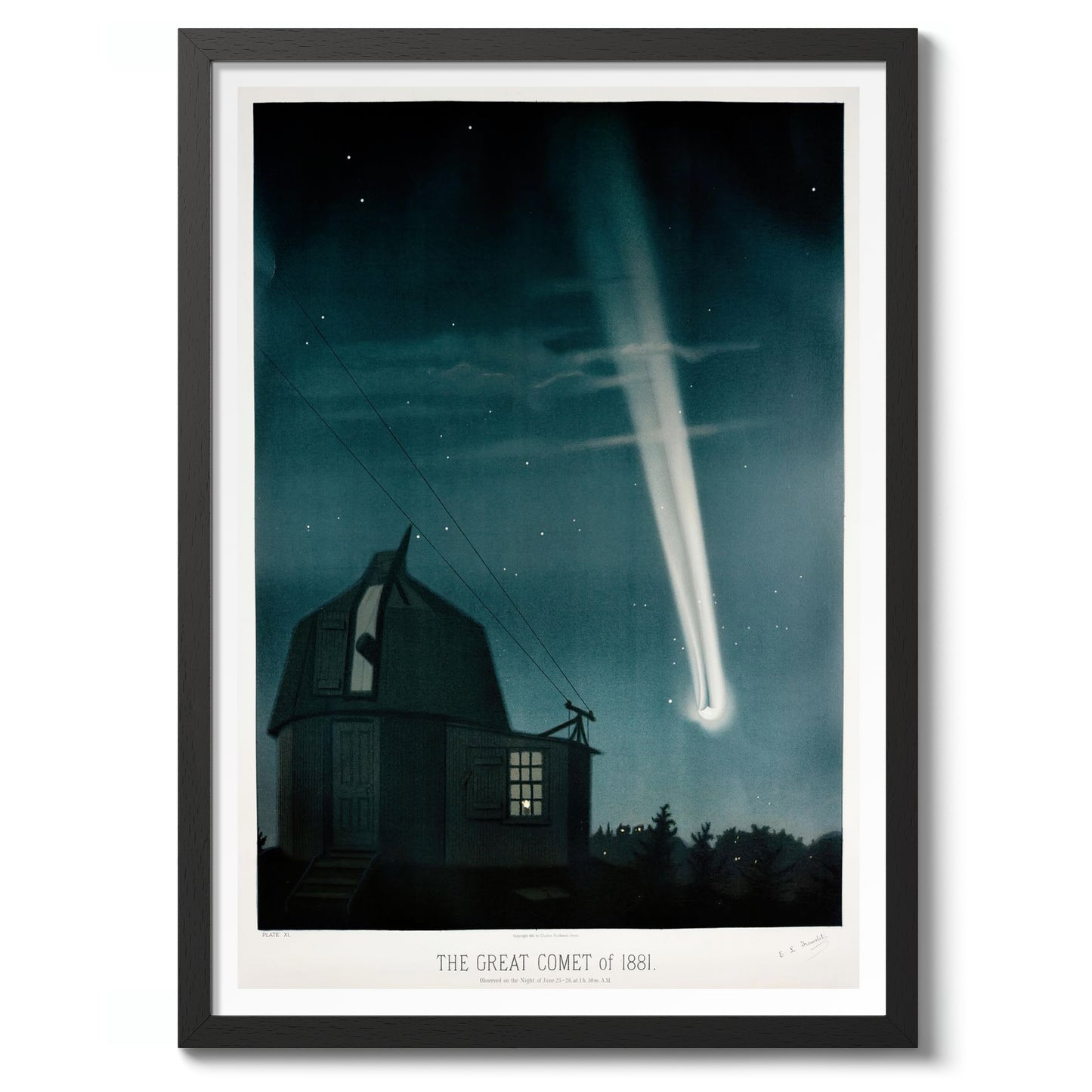 This vintage poster, "The Great Comet of 1881" by E. L. Trouvelot, captures a dramatic celestial event with an illustrative style. The scene features a luminous comet streaking across a deep blue and black night sky above an observatory. Ideal for lovers of astronomy, this artwork combines historical and scientific themes, making it both visually and intellectually captivating.