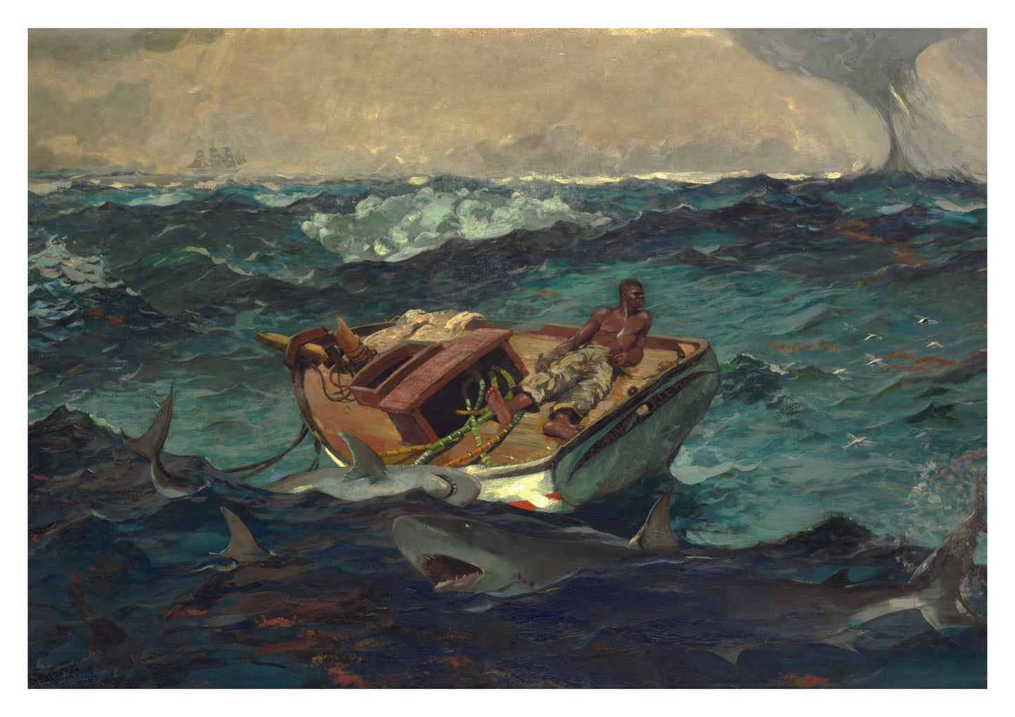 This poster features Winslow Homer's "The Gulf Stream," capturing a dramatic maritime scene. Depicting a lone boat battling tumultuous waves, it showcases a fisherman confronting the peril of circling sharks. The vivid realism and dynamic composition create a sense of urgency and isolation. An evocative choice for those who appreciate the power and beauty of the sea in art.