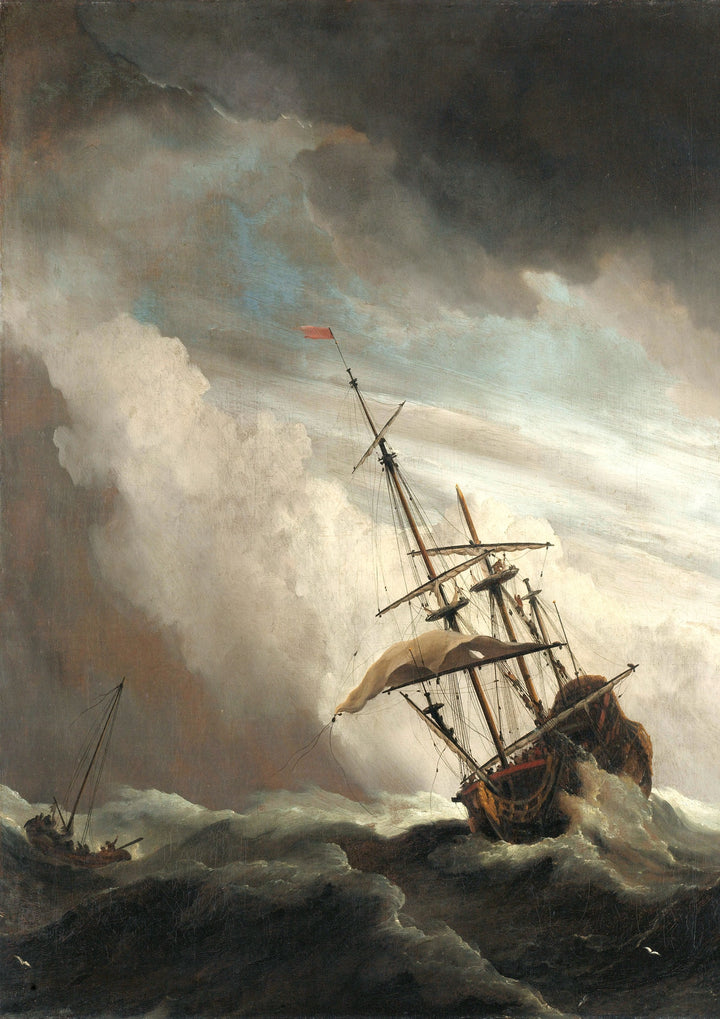 "The Gust" by Willem Van de Velde The Younger captures a dramatic maritime scene. This traditional painting poster portrays two ships battling towering waves under a turbulent sky. Dark clouds loom, contrasting the churning sea, creating a powerful depiction of nature's fury. Ideal for those who appreciate classic sea-themed art.