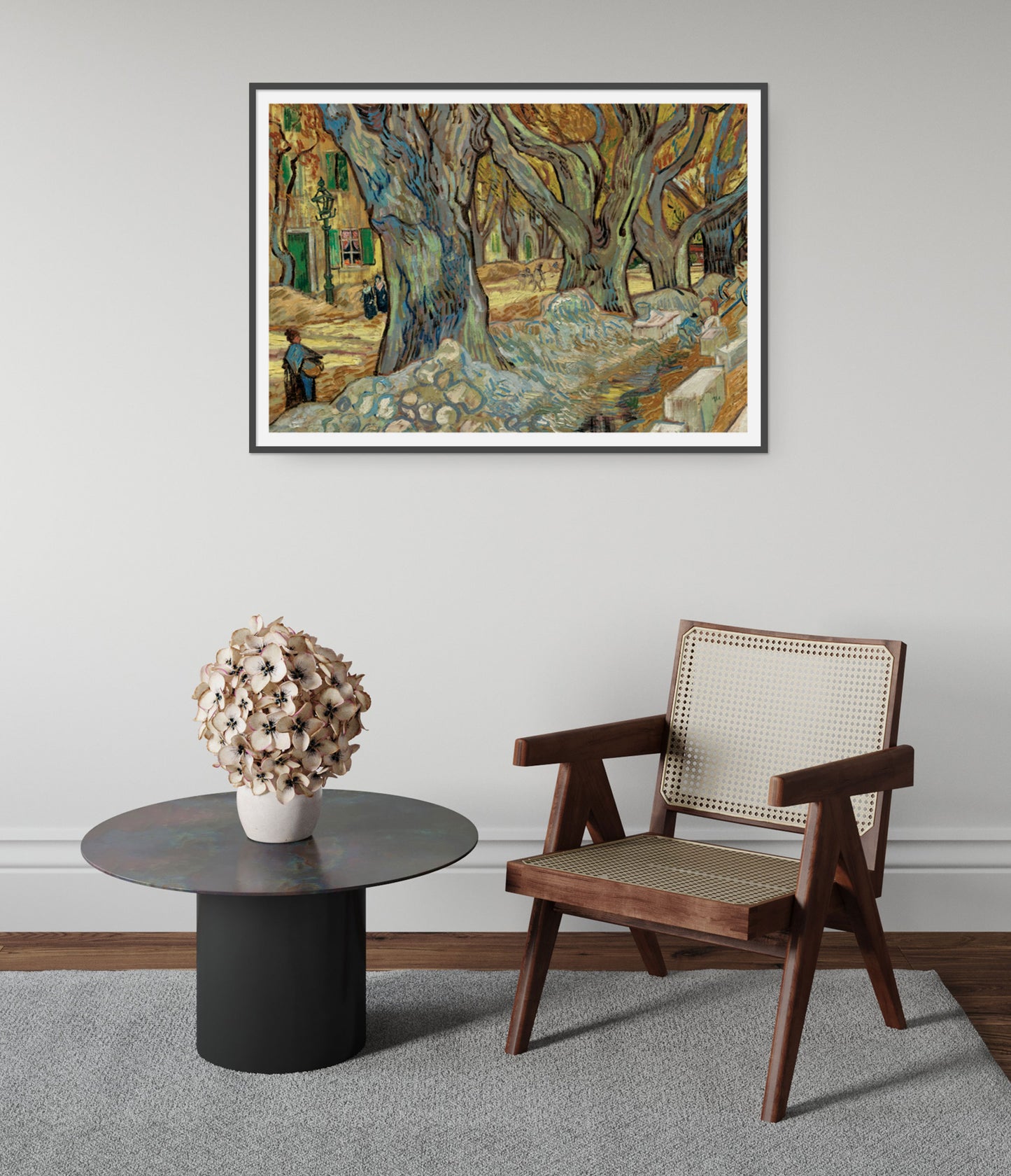 This "The Large Plane Trees" poster by Vincent Van Gogh captures a lively village street lined with towering plane trees. Rendered in vibrant, swirling hues characteristic of Post-Impressionism, this landscape painting exudes vitality and movement. The rural setting, detailed with villagers and rustic elements, enriches the visual narrative, making it an evocative piece for any art enthusiast's collection.