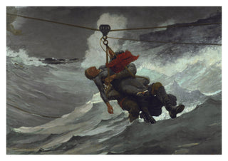 This exquisite poster features Winslow Homer's "The Life Line," capturing a heroic sea rescue amidst powerful waves and rugged cliffs. The realism of this maritime painting highlights the lifeguard's bravery as he's suspended on a rope, steering a rescued individual to safety. The dramatic ocean backdrop and lifelike portrayal make it a striking maritime-themed print. Perfect for art and sea enthusiasts.