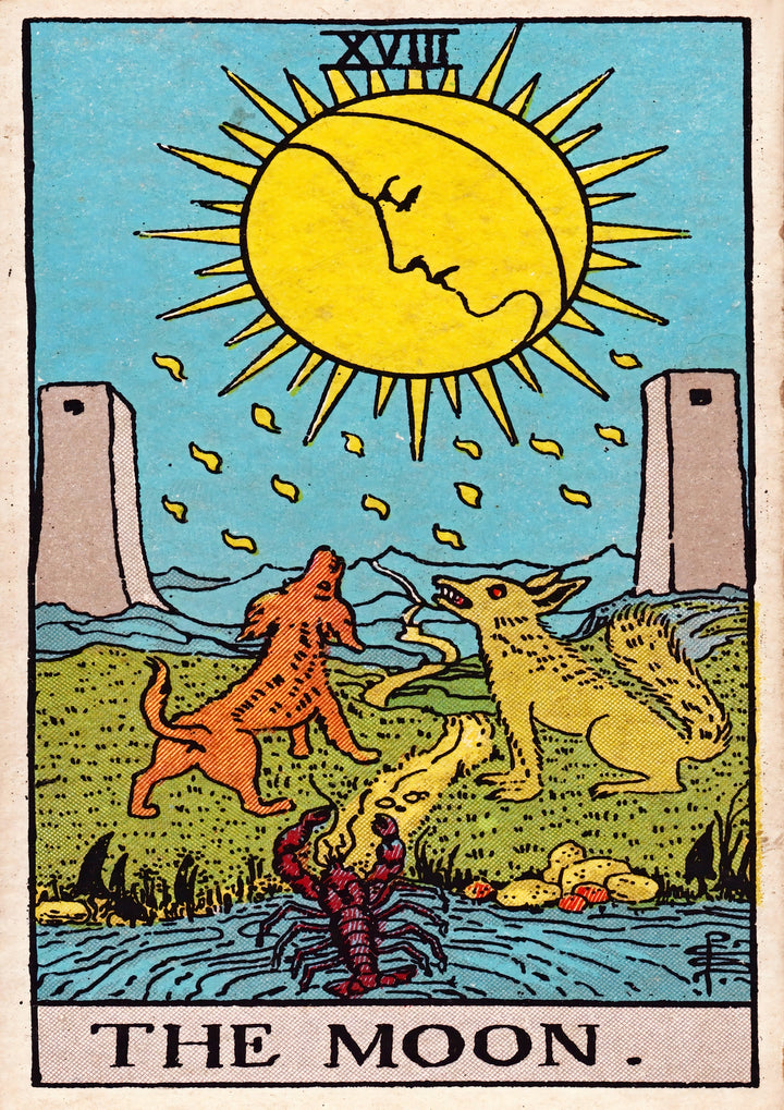 This vintage Tarot poster, titled "The Moon," showcases an enchanting mystical scene featuring a radiant moon with dual faces, flanked by two towers. Foreground elements include a howling dog and a lobster emerging from a serene water body. The intricate details and celestial theme make it ideal for fans of spiritual and mythical artwork. Perfect for those appreciating vintage and illustration styles.