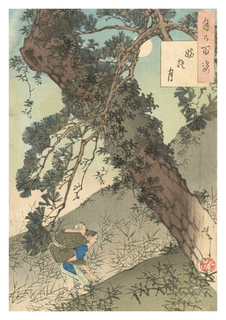 This traditional woodblock poster by Tsukioka Yoshitoshi, titled "The Moon & the Abandoned Old Woman," captures a poignant scene under the moonlit sky. A towering pine tree casts shadows over a sloping mountainside, where an elderly woman is seen in a moment of solitude. Perfect for fans of Ukiyo-e art, this print artfully conveys themes of nature and melancholy.