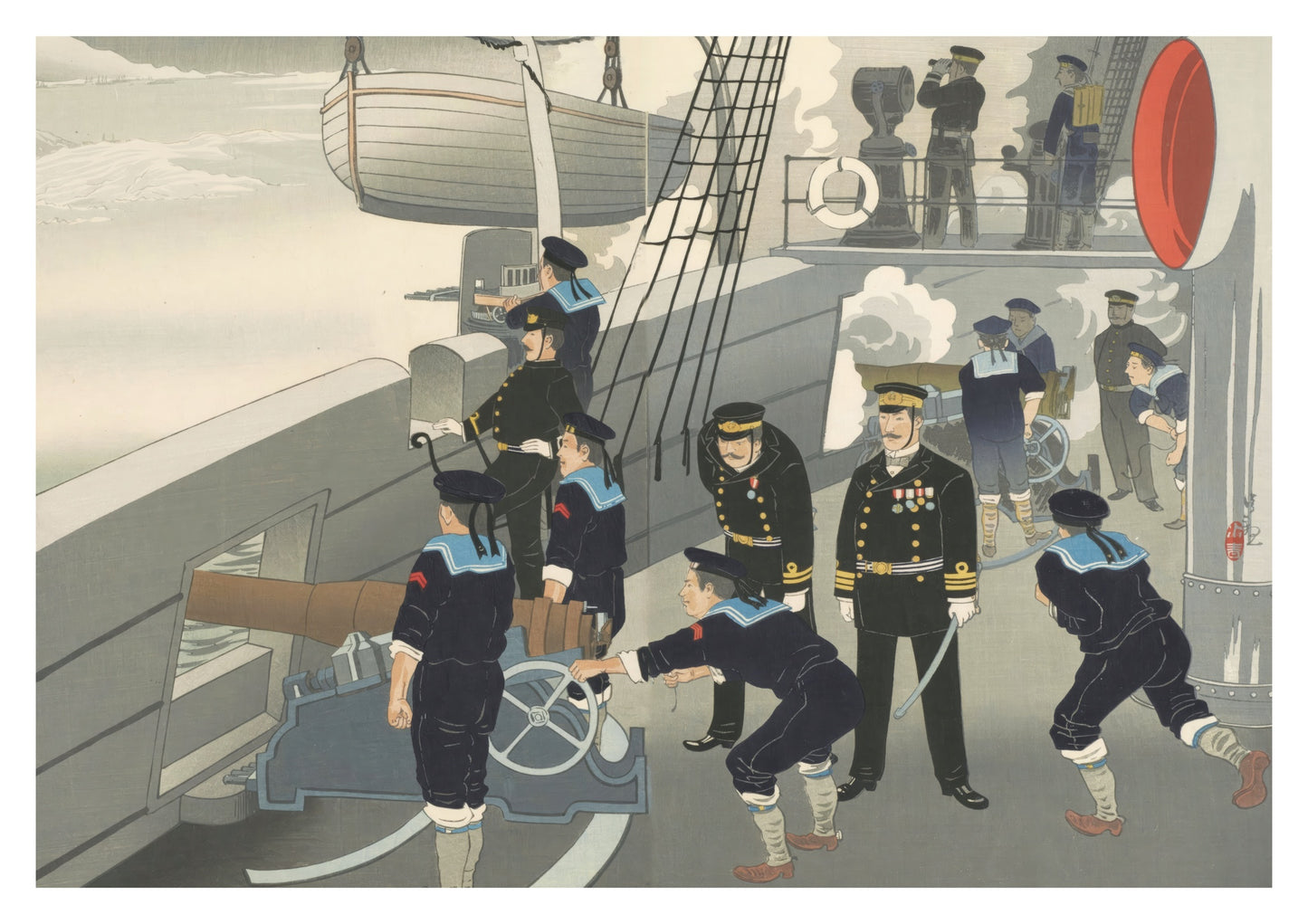 This Japanese woodblock poster, "The Navy Attacking Urashioko Harbour" by Kobayashi Kiyochika, vividly depicts a naval scene with sailors and officers in action aboard a warship. The detailed illustration showcases traditional military attire and maritime weaponry, encapsulating the essence of maritime warfare. Ideal for enthusiasts of traditional Ukiyo-E art and historical naval imagery.