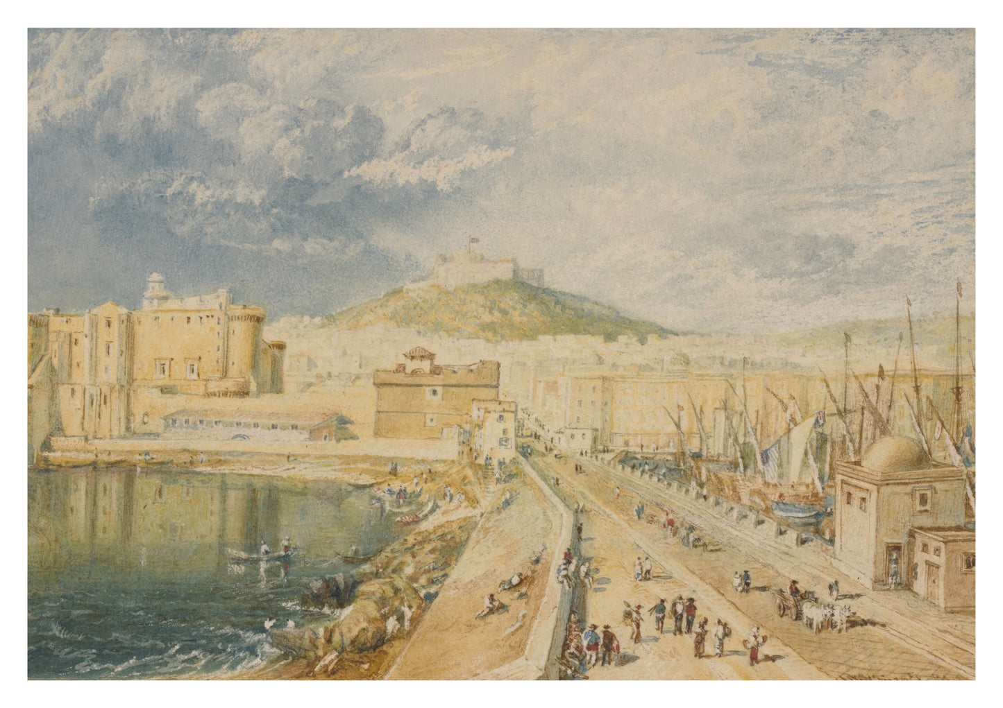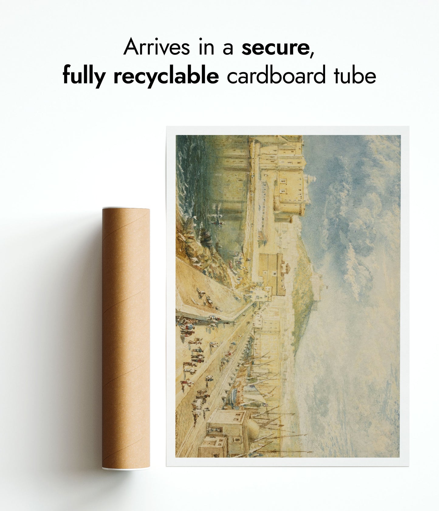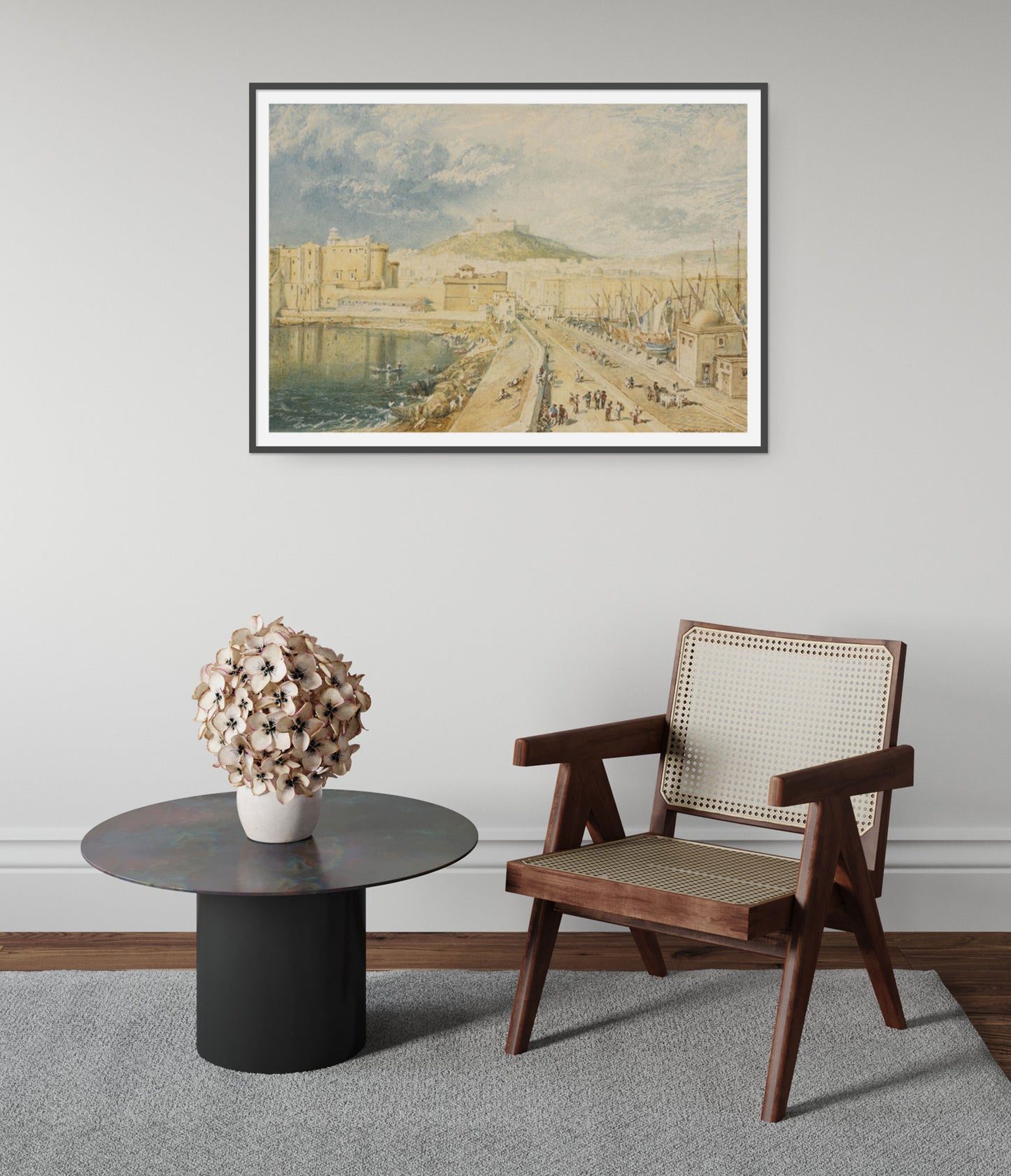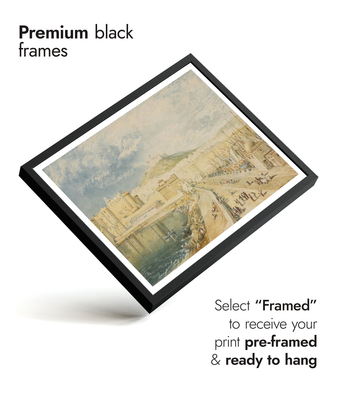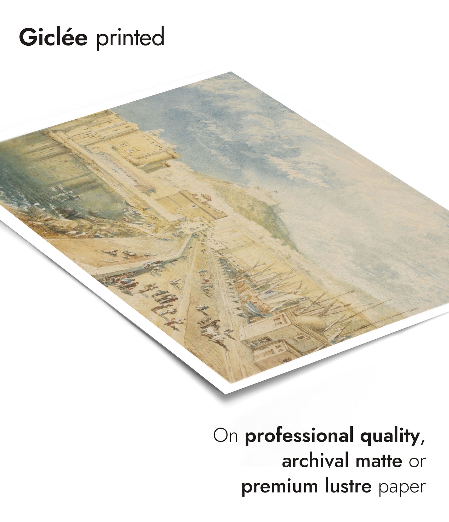 "The Old Harbour, Naples" poster by J. M. W. Turner showcases a picturesque Mediterranean scene with sailing boats, lively streets, and historic fortifications under a vibrant sky. This Romanticism landscape captures the essence of 19th-century Naples, highlighting its cultural and maritime heritage. Perfect for adding a touch of European charm and history to any space.