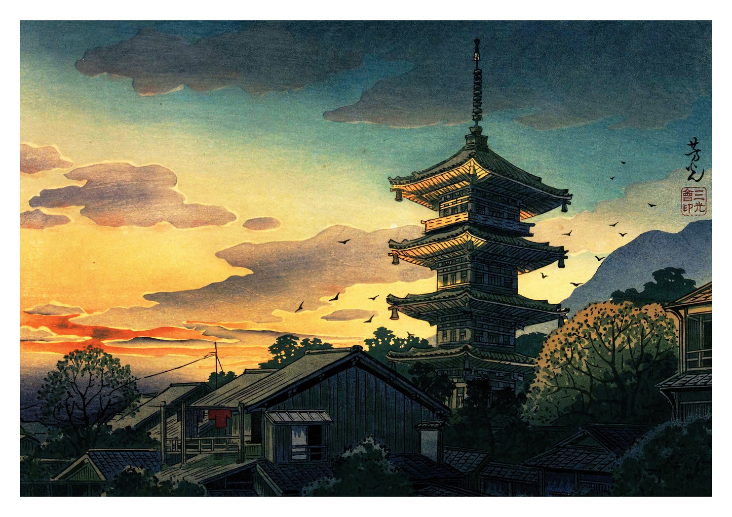 The poster "The Pagoda at Yasaka" by Nomura Yoshimitsu captures a serene Japanese village at sunset. Featuring a traditional woodblock style, the artwork illustrates the iconic Yasaka Pagoda silhouetted against a dramatic sky filled with soft hues and clouds. Birds in flight enhance the tranquil atmosphere of this beautifully detailed traditional Ukiyo-E piece. Ideal for lovers of Japanese art and historical landscapes.