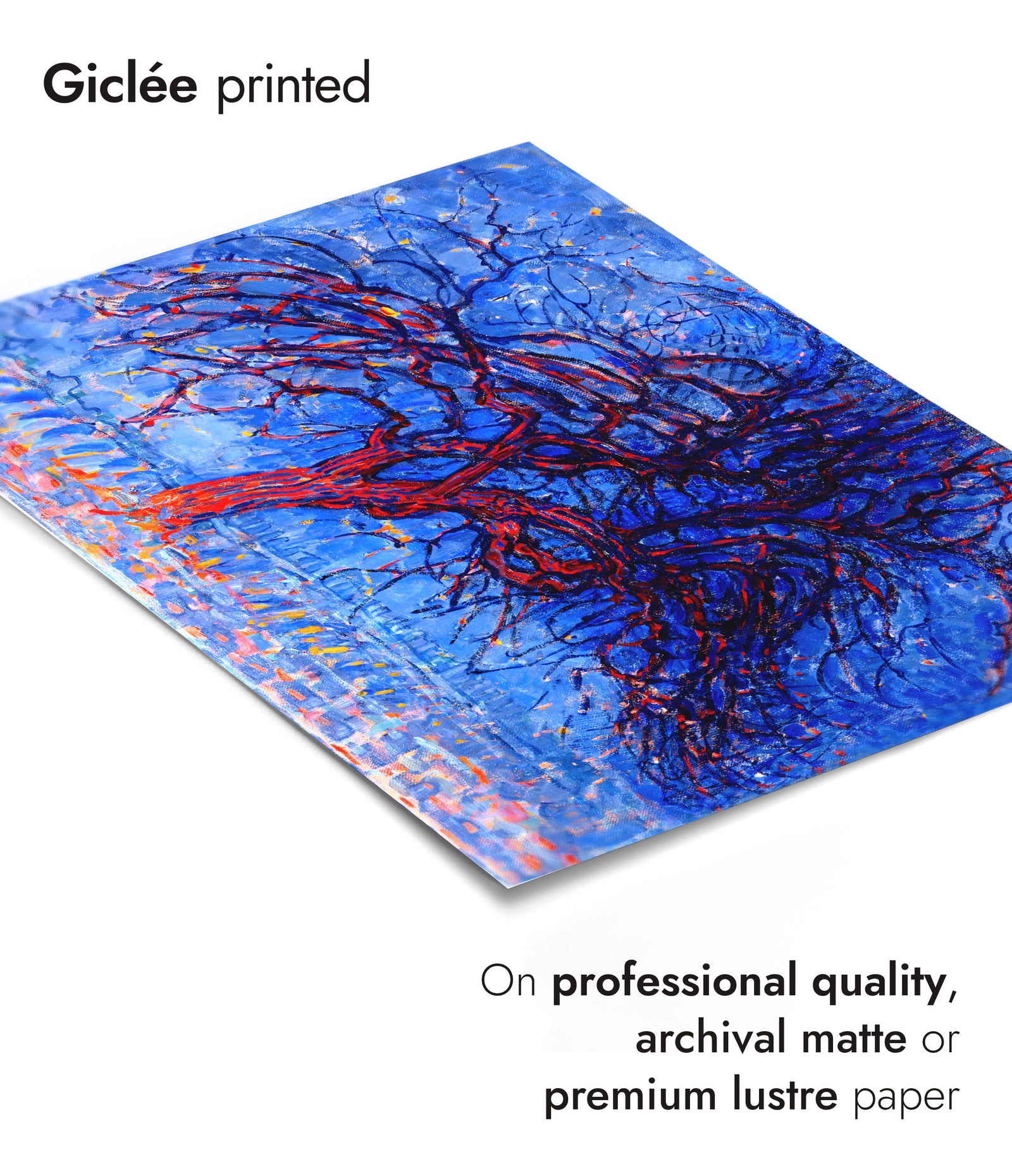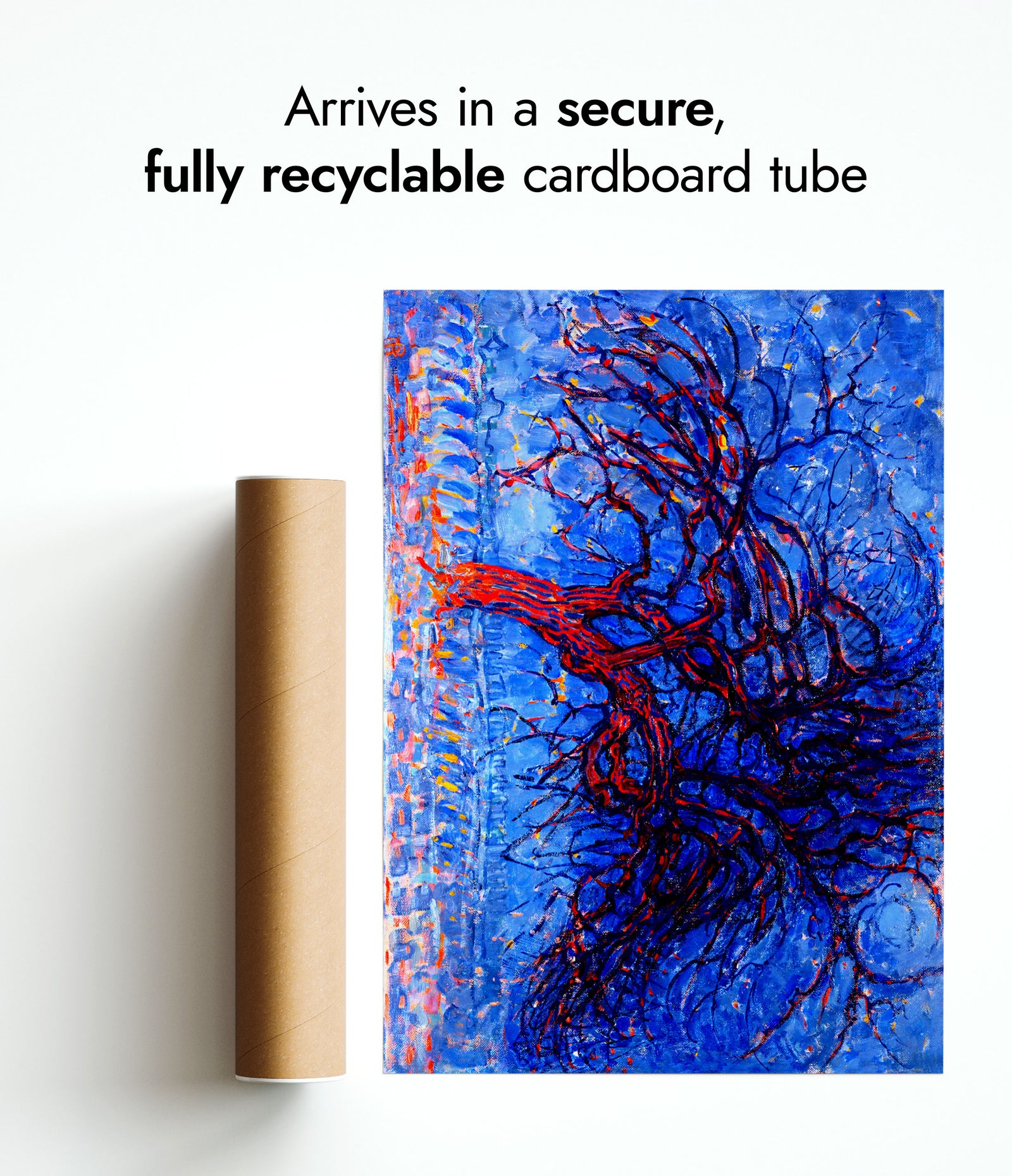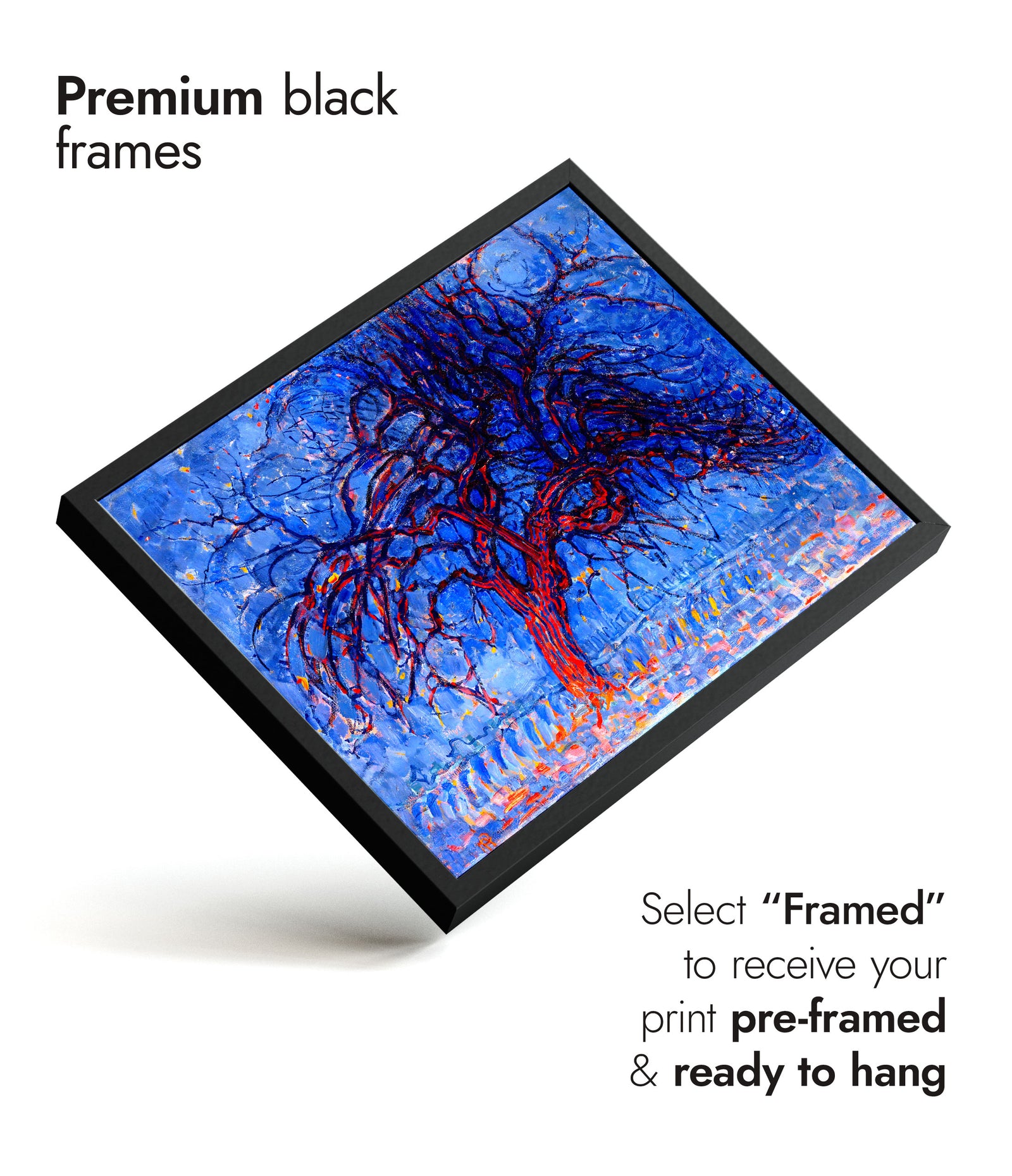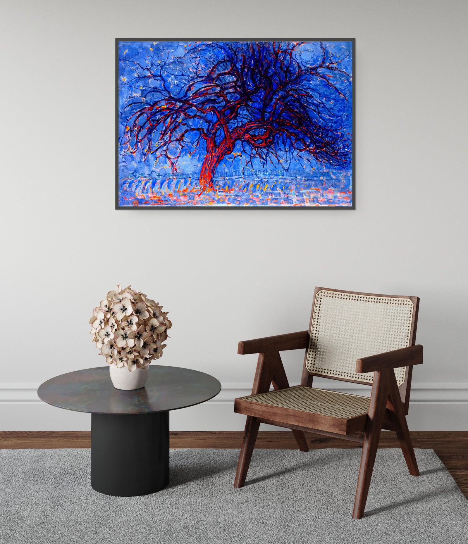 "The Red Tree" poster by Piet Mondrian captures a vibrant post-impressionist scene dominated by a strikingly red tree against a deep blue night sky. This landscape painting intricately blends swirling branches with dynamic brushstrokes, showcasing the artist's unique approach to nature and form. Perfect for adding a touch of artistic mastery to any space.