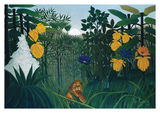 Henri Rousseau's "The Repast of the Lion" poster captures a lush, tropical forest scene. Amidst vibrant flowers and dense greenery, a lion feasts, blending harmoniously within the untamed wilderness. This Primitivism piece showcases Rousseau's signature Naive painting style, emphasizing rich details and a serene yet wild landscape, making it a striking animal and forest-themed art print.